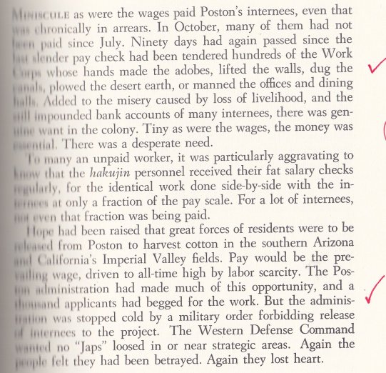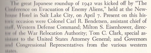 A term I have not seen elsewhere that is about the internment is the “big roust.” The author compares this to what was done to various Native American tribes when they were moved off their original territories and forced to relocate elsewhere.