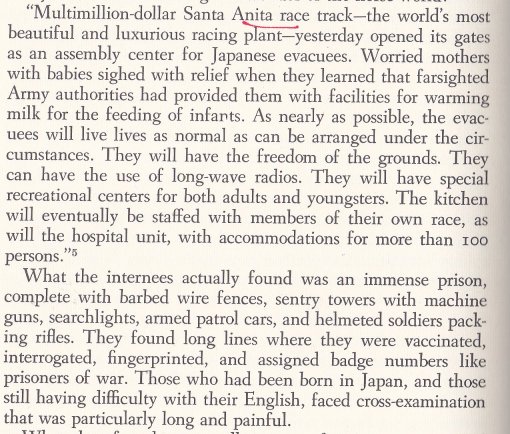 The author notes that some of the stalls still smelled like horse manure when the people moved into them. It took only sixty days to make Santa Anita the 32nd largest community in the entire state of California. Considering that it was just supposed to be a race track, that's quite an accomplishment.