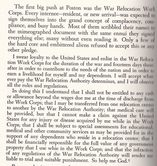 Workers began to stop showing up for work. “Directives against the malcontents were posted on the block bulletin boards.” The anthropologists, sociologists and others who were studying the internees suggested a more understanding approach, but the camp management went for a get-tough policy.