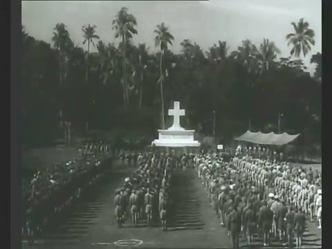 The Japanese even faked a religious ceremony. The cross is actually cardboard and machine guns are hidden, trained on the prisoners.