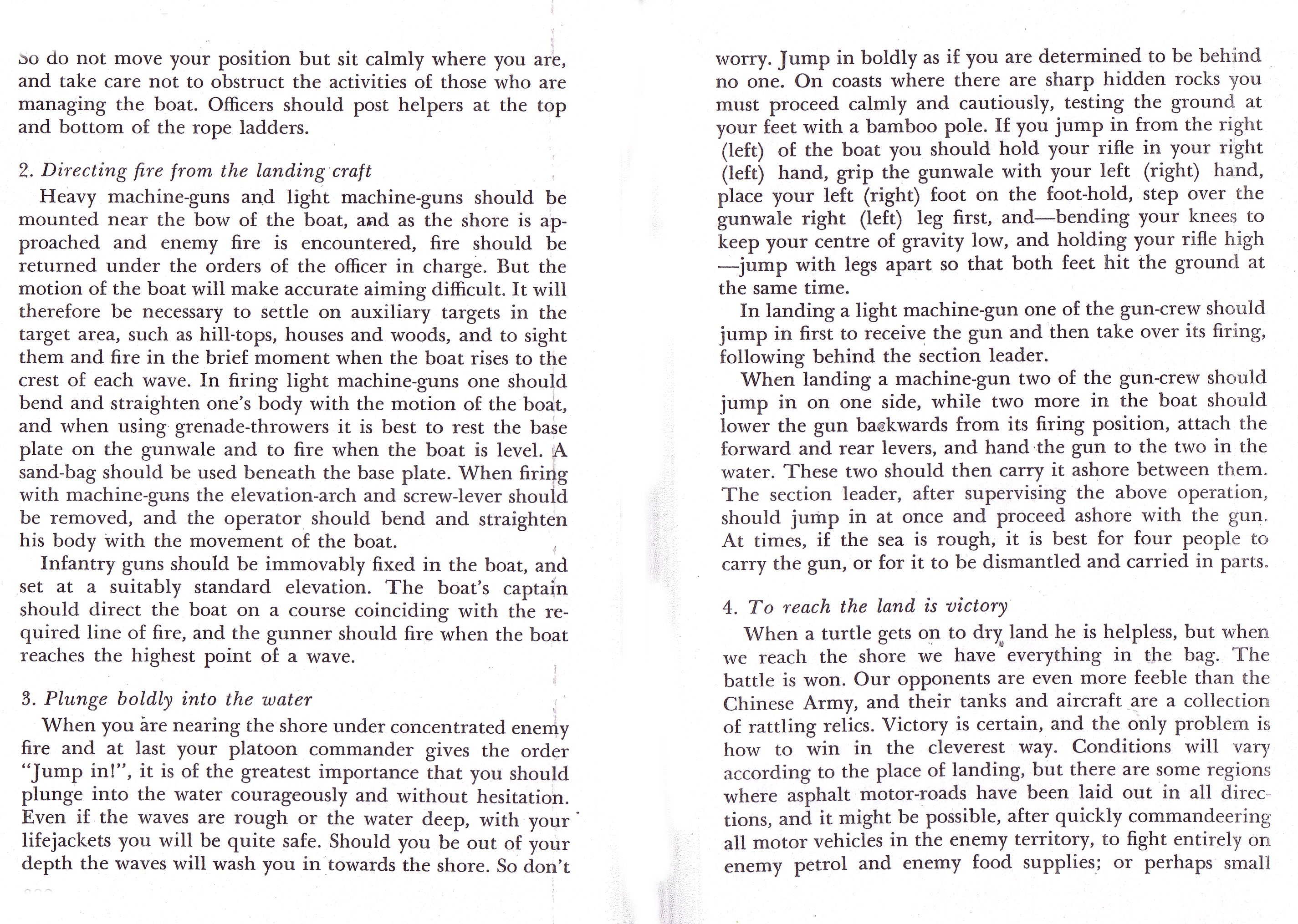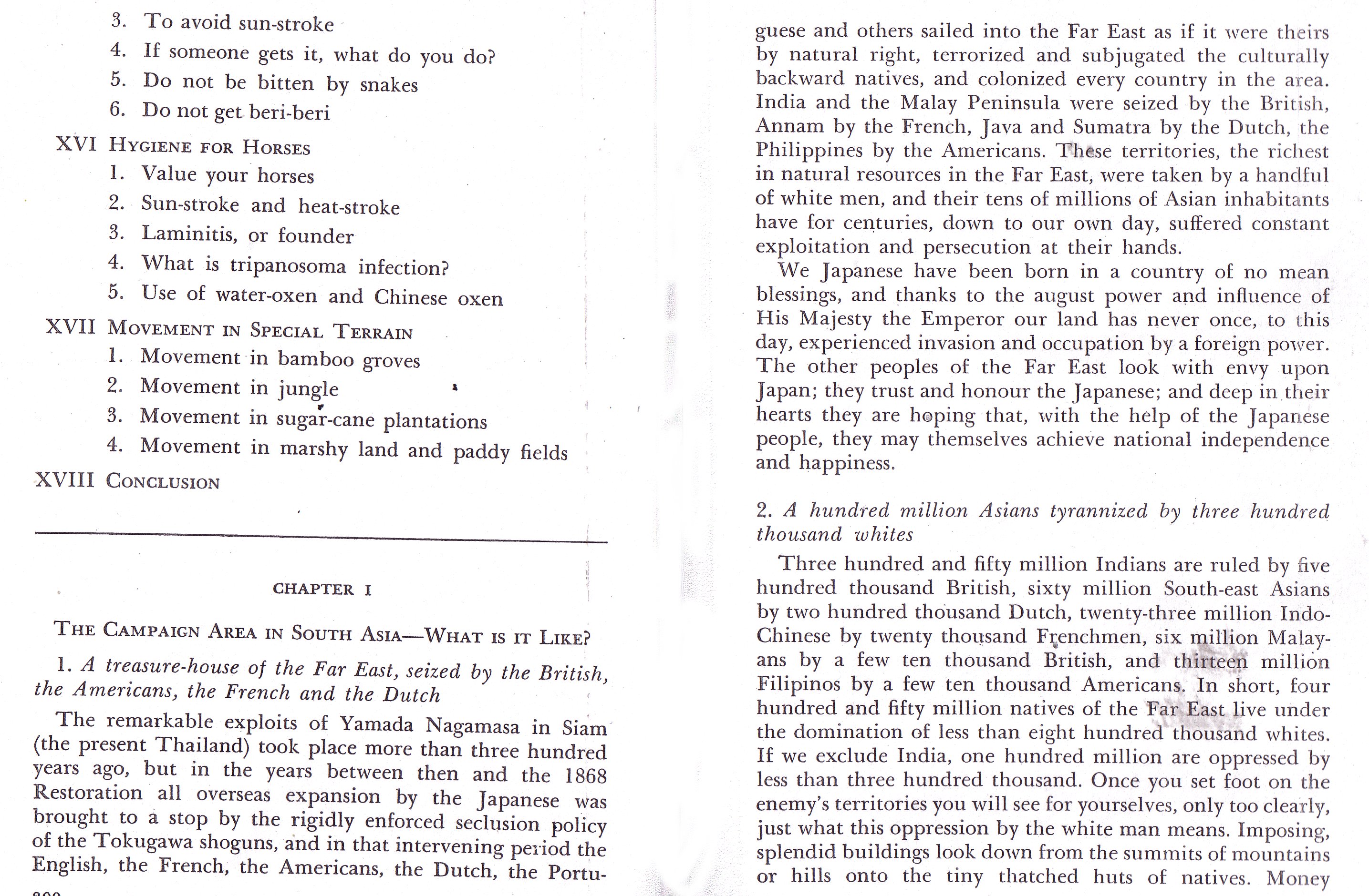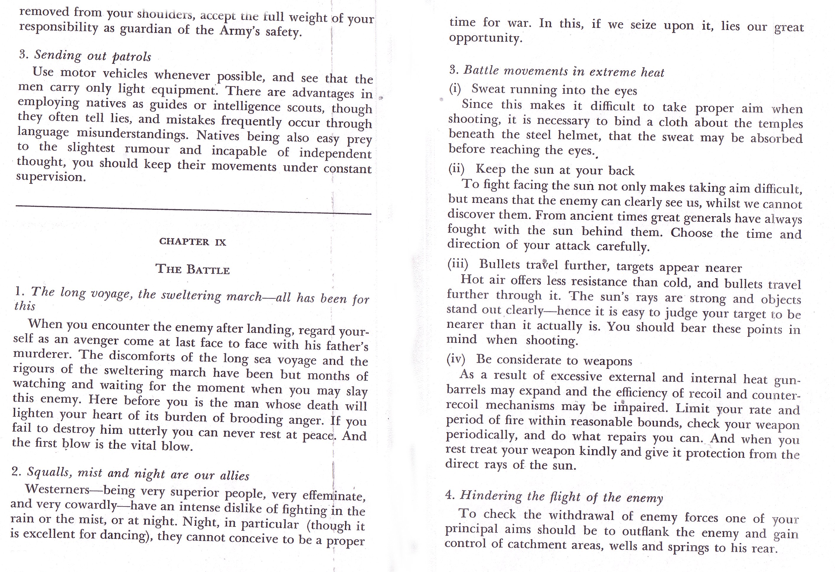 A strong put-down of Westerners is contained in section 2 where it says that Westerners are “...very effeminate and very cowardly-have an intense dislike of fighting in the rain or the mist, or at night.” This is one of the areas where both sides made the same mistake – they underestimated the ability of the soldiers of the other side.