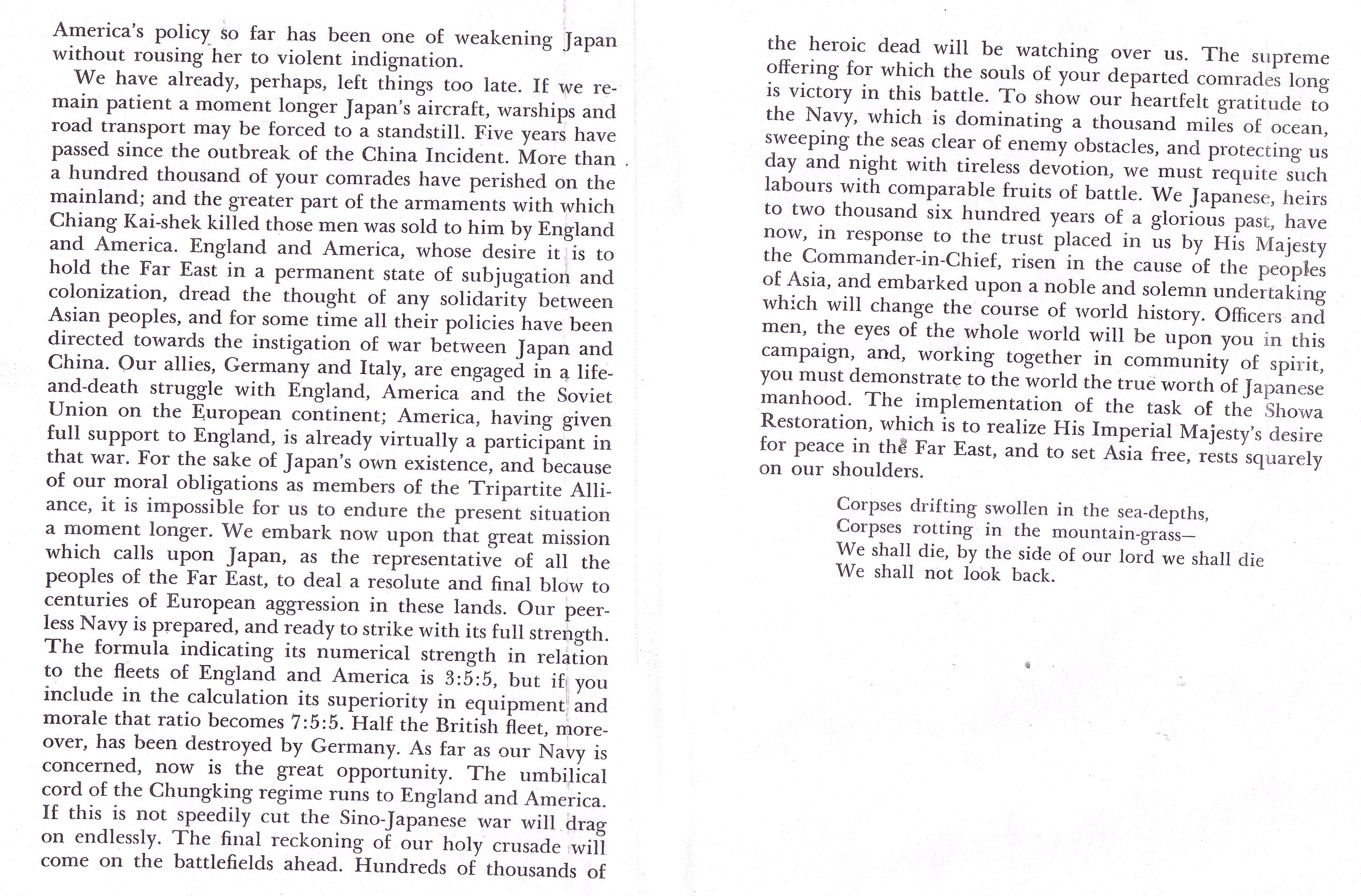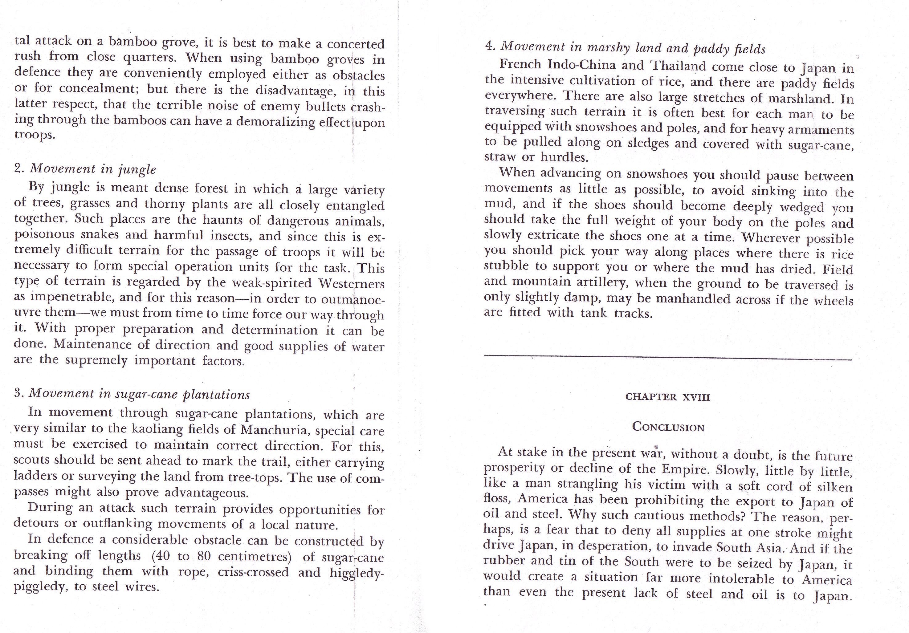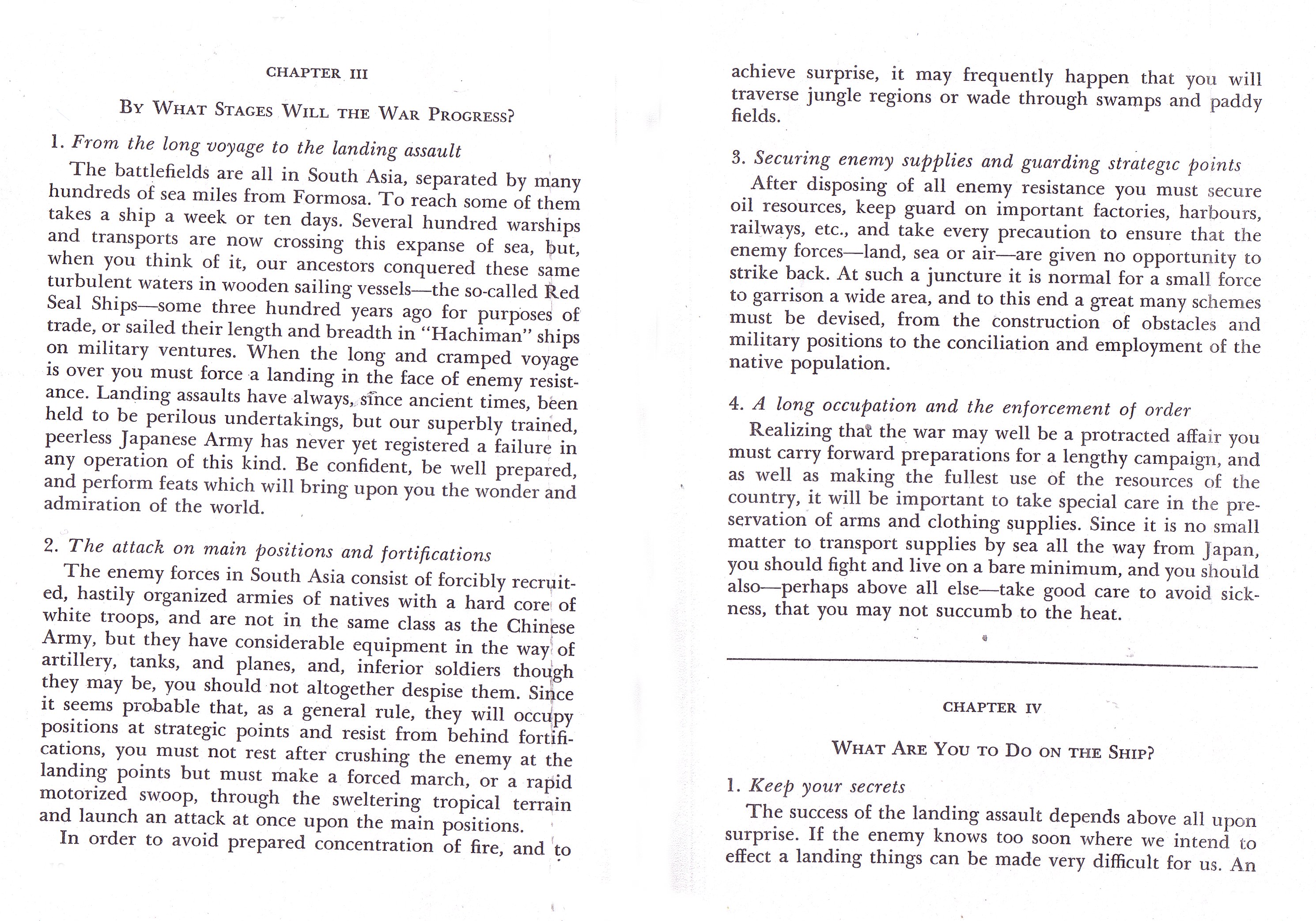 On part 4, there's a reference made to “Our opponents are even more feeble than the Chinese Army, and their tanks and aircraft are a collection of rattling relics. Victory is certain, and the only problem is how to win in the cleverest way.” From what I have read, the Japanese army was able to push the Chinese army around fairly well, but not with complete ease, so they weren't all that weak. I'm not sure what the term “other opponents” refers to unless it's the defenses of the British and Dutch.