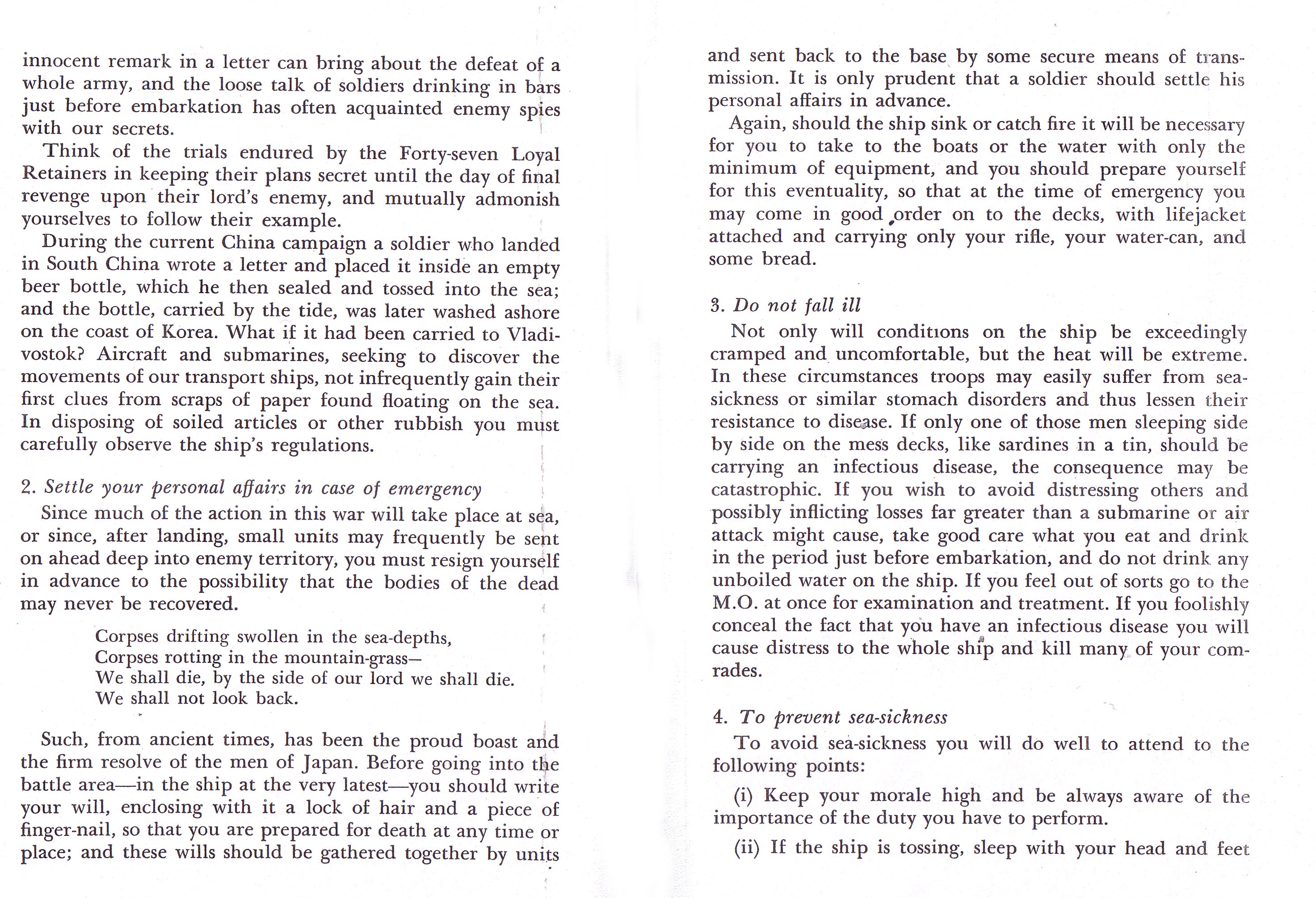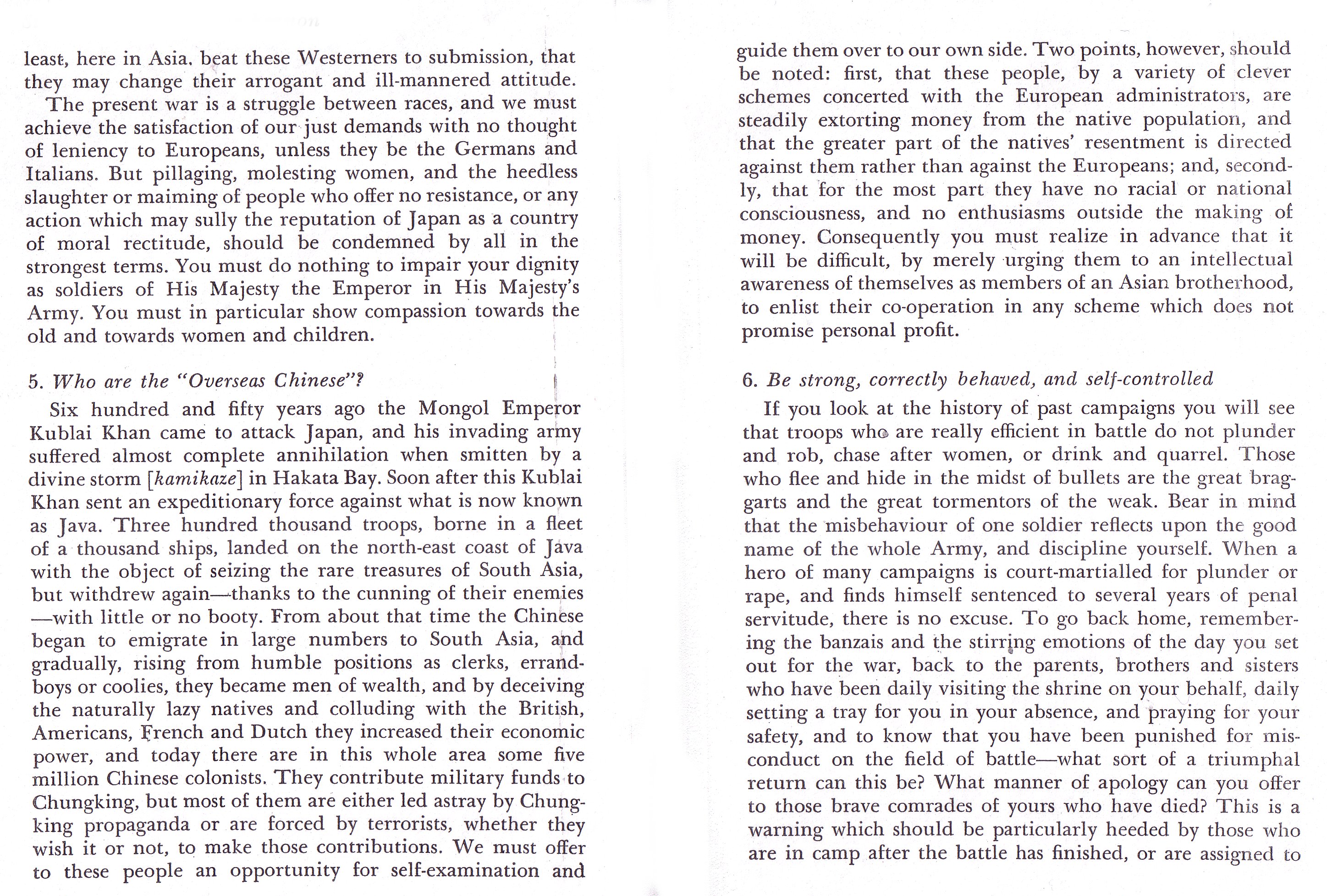 ”But pillaging, molesting women, and the heedless slaughter or maiming of people who offer no resistance, or any action which may sully the reputation of Japan as a country of moral rectitude, should be condemned by all in the strongest terms. You must do nothing to impair your dignity as soldiers of His Majesty the emperor in His Majesty's Army. You must in particular show compassion toward the old and toward women and children.”