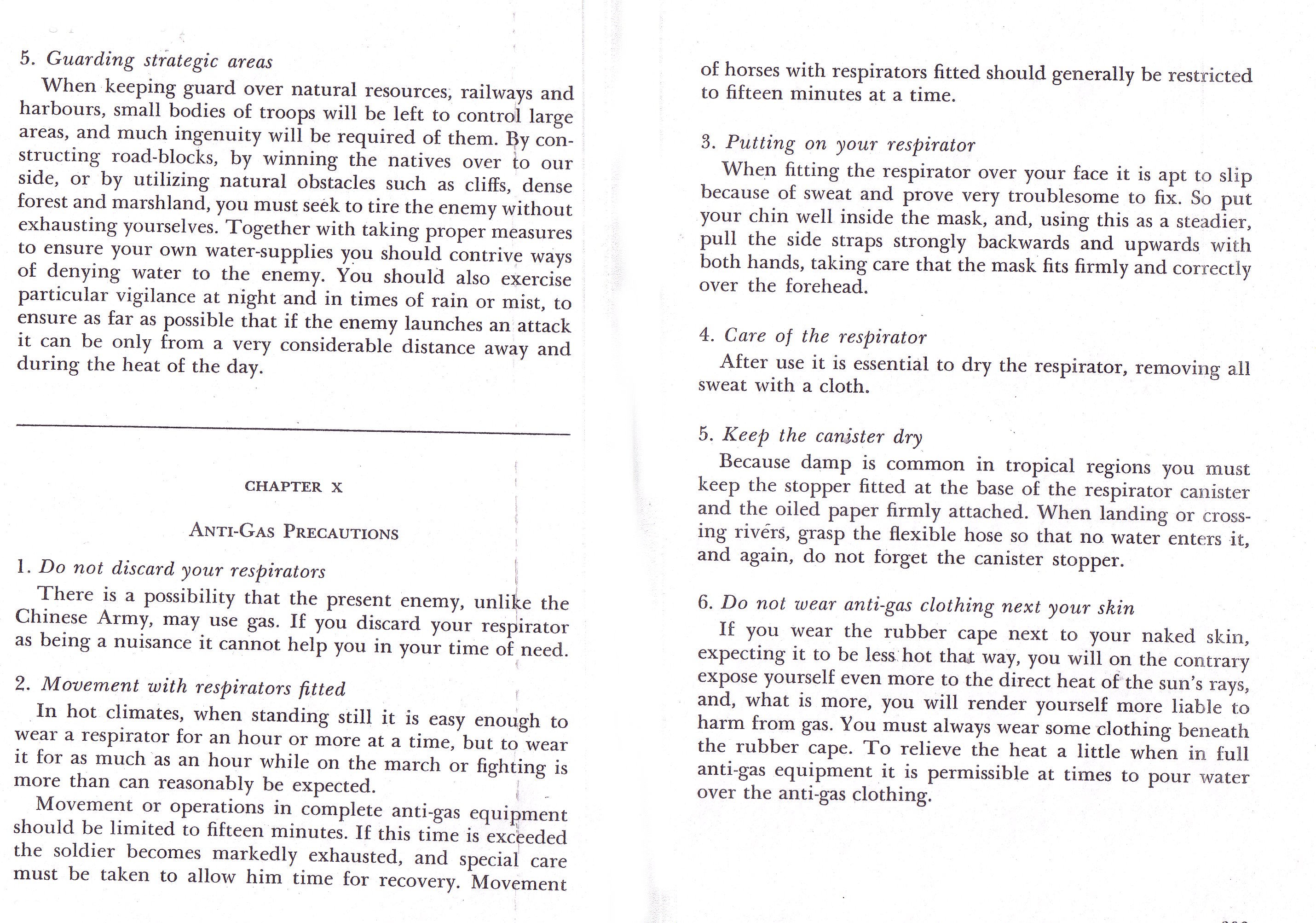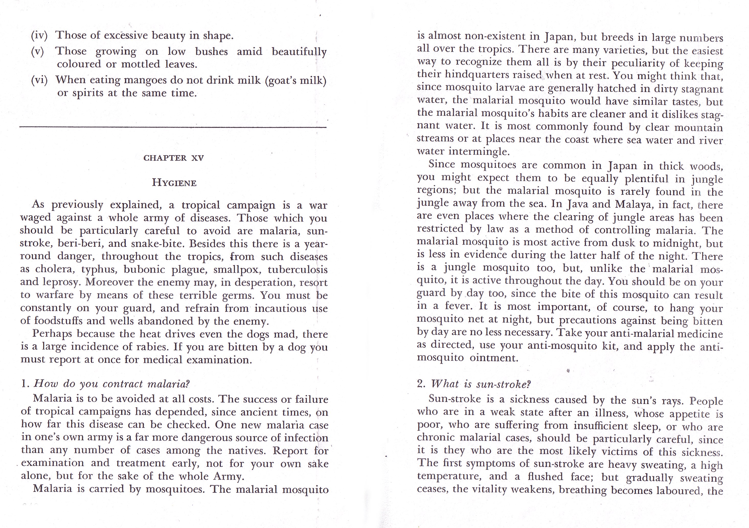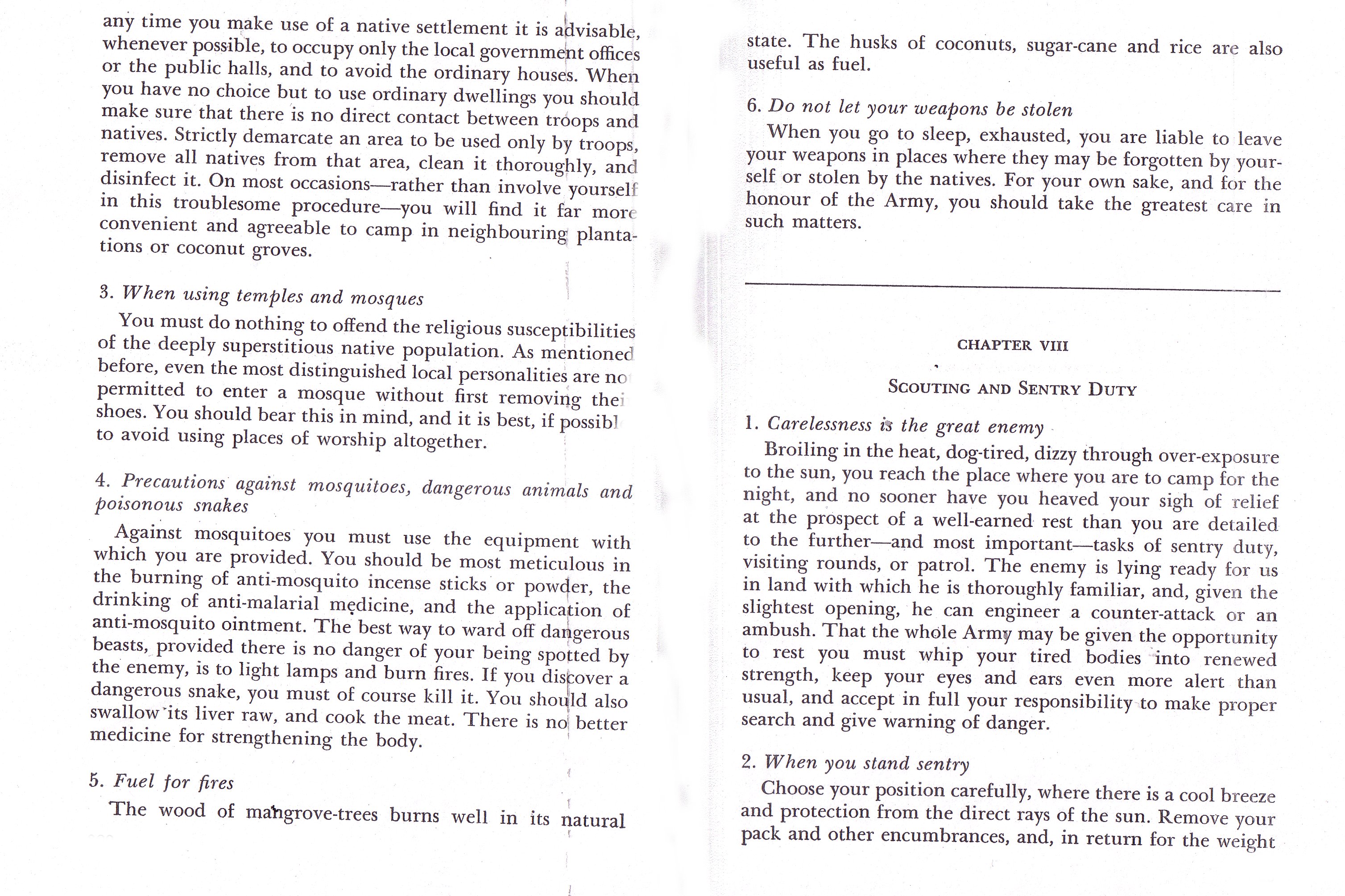 Chapter 7, part 2, refers to the Native inhabitants and gives another good idea of just how little the Japanese thought of them. “Native settlements-since the natives' standard of living is extremely low, and their ideas on hygiene are non-existent-are nests of fleas, lice, bedbugs and infectious disease.”
