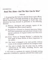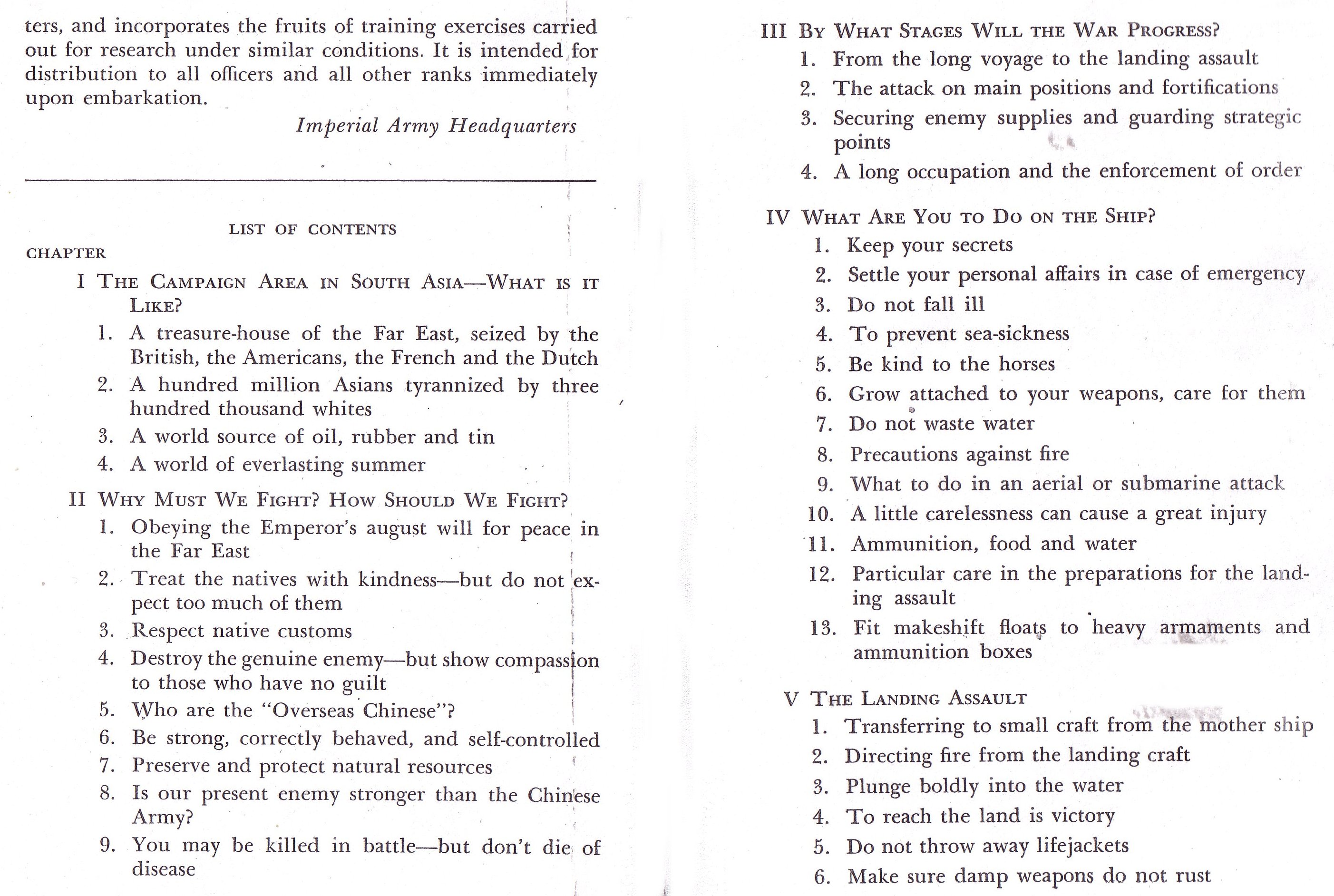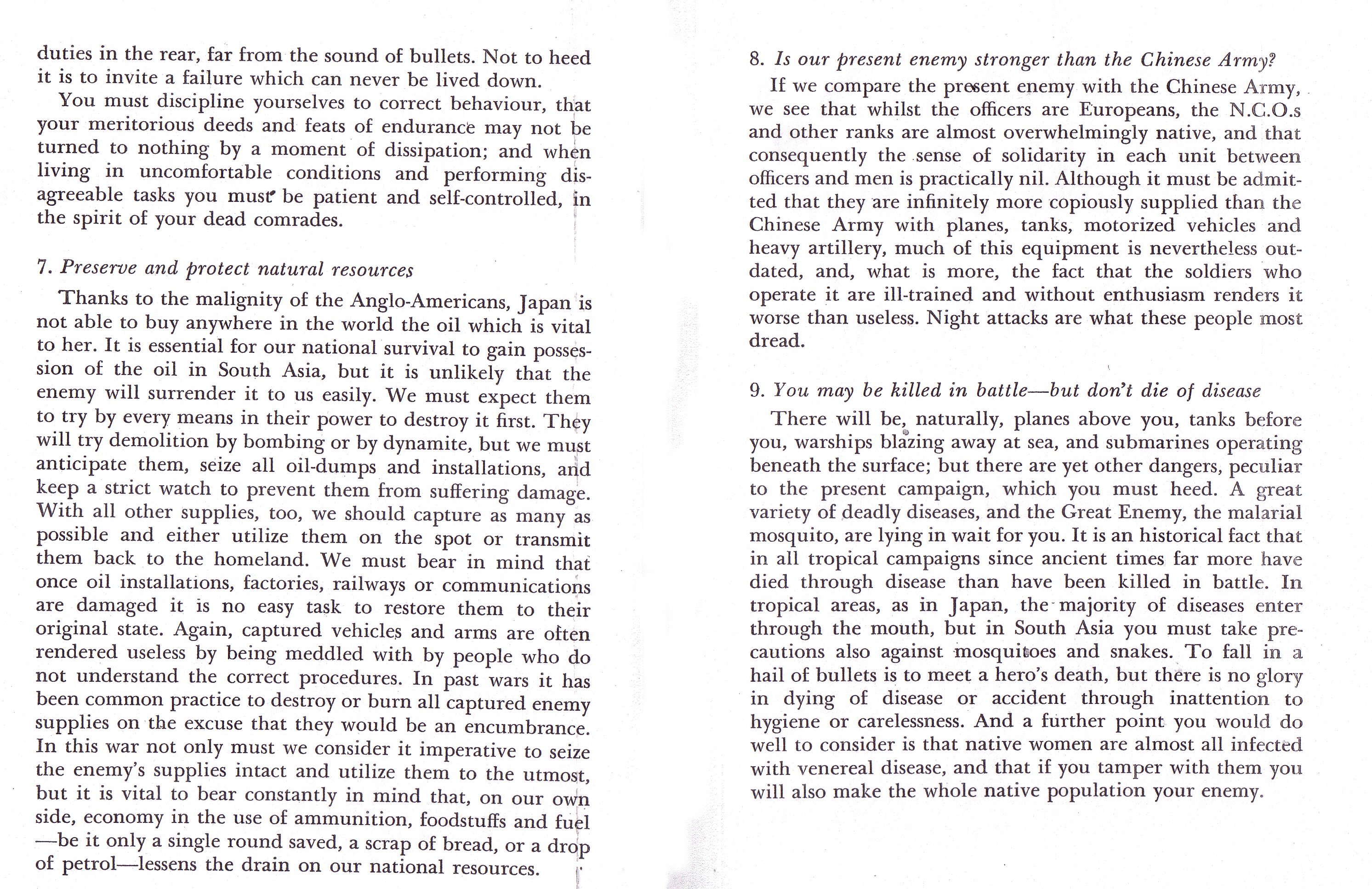 This is a very interesting pamphlet, especially in that it gives the reader a good idea of one of the reasons Japan was going to war, Japan's view of the “natives,” and the instructions that were most ignored, those being how to properly treat defeated people and captured prisoners.