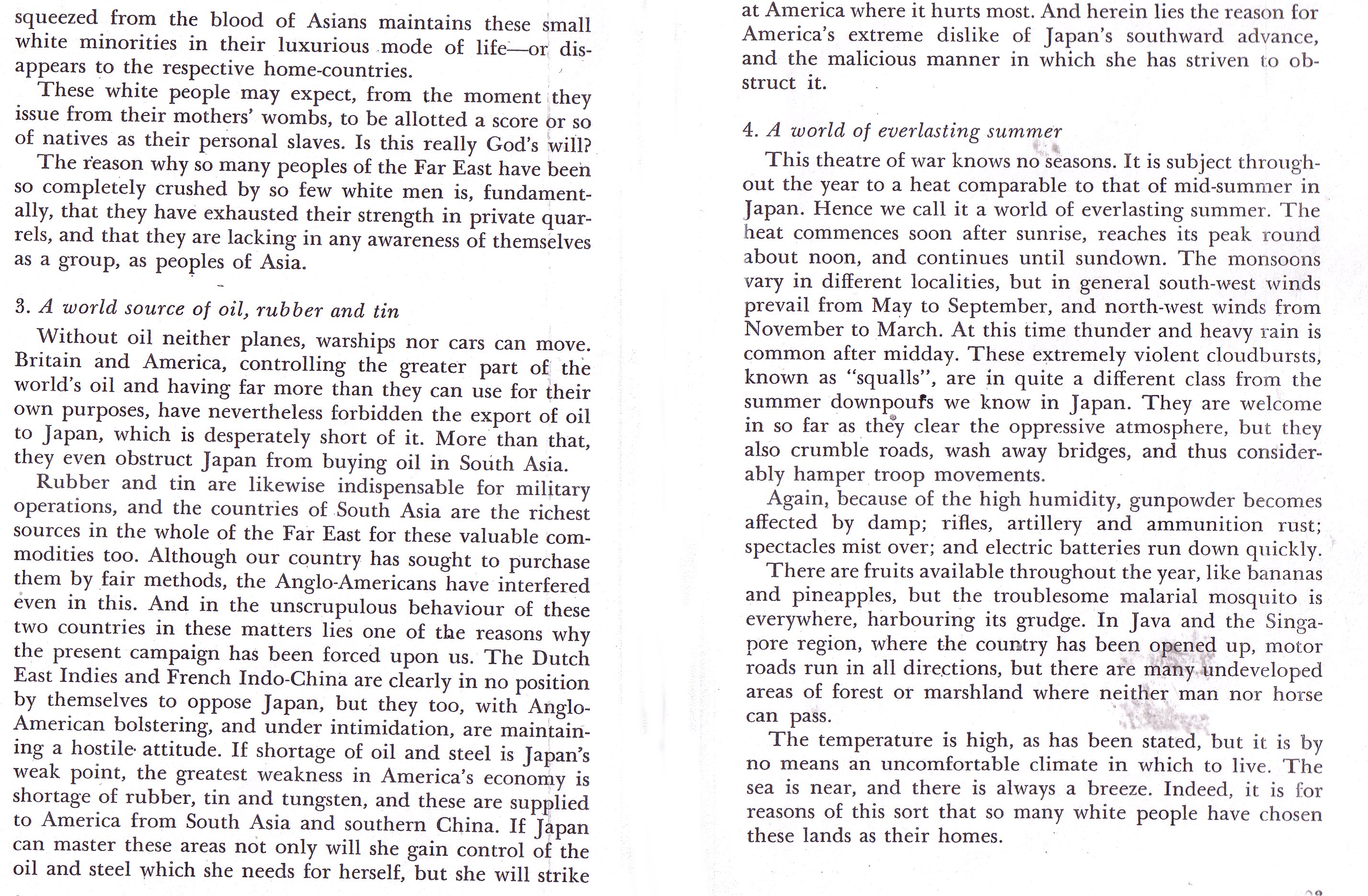 This section talks about all the soldiers Japan has lost on the mainland of China, and how the weapons used to kill them were supplied by England and America, and that those two countries want to keep the Far East “...in a permanent state of subjugation and colonization...”