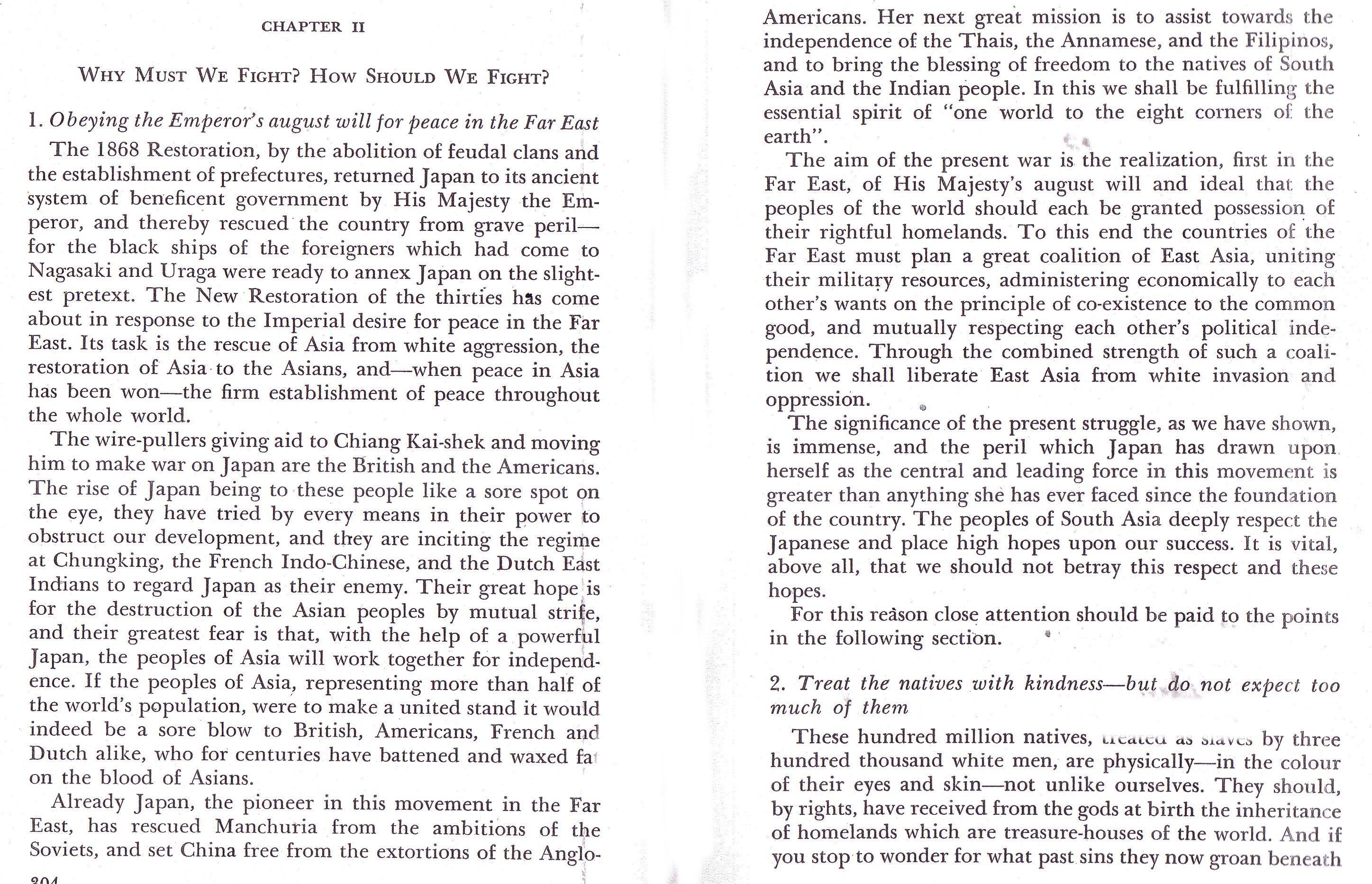Chapter 2, section 1. “Its task is the rescue of Asia from white aggression, the restoration of Asia to the Asians...” Again, the idea of Asia for the Asians is shown as a cause for the Japanese actions in the Far East.