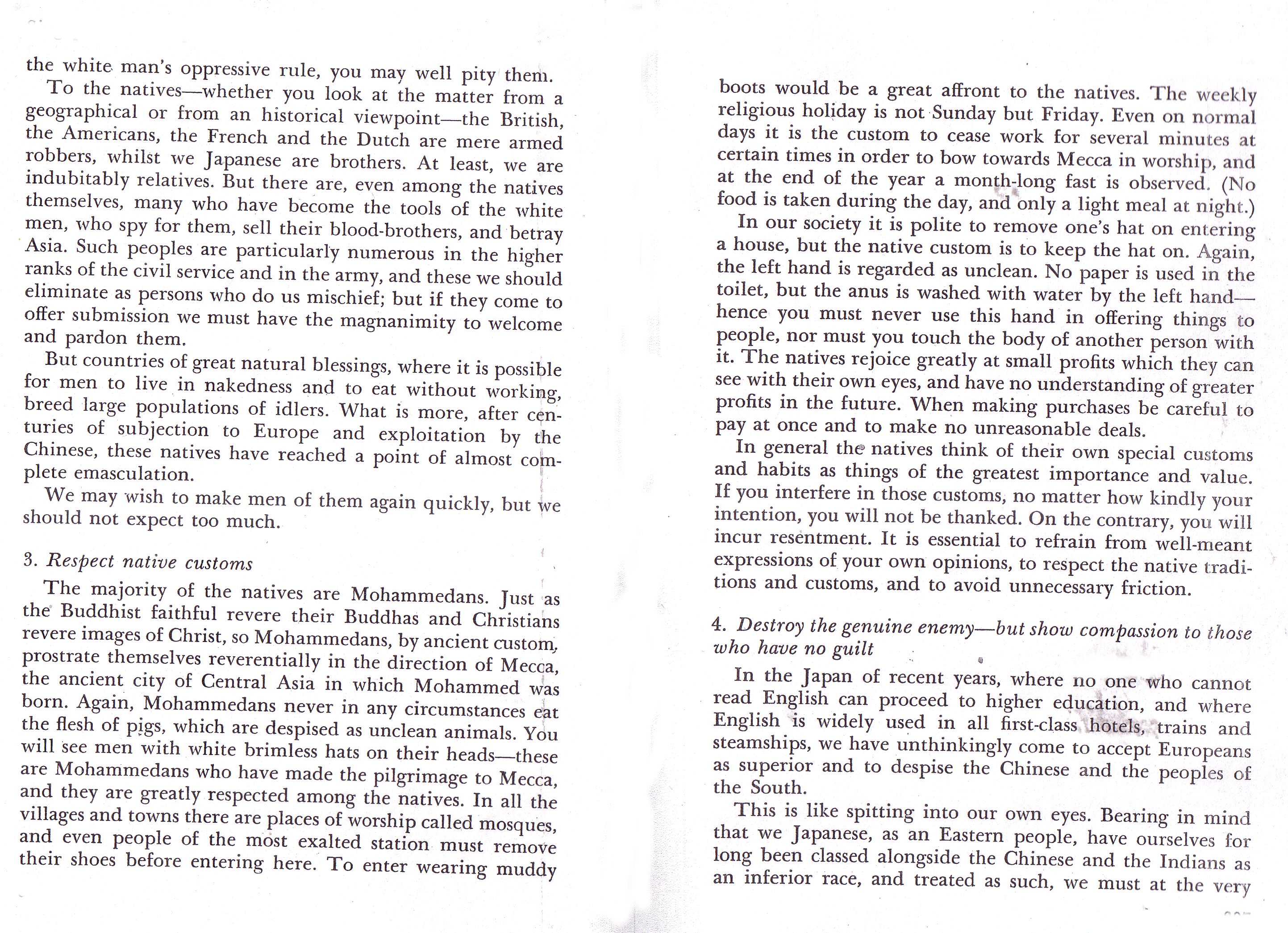 This section says that, from the viewpoint of the natives of the Far East countries, the British, Dutch, Americans and French are “armed robbers.” It also says that many of the natives have become “tools of the white men”, and that this group is more numerous in the civil service. Such people are to be “eliminated” if they cause the Japanese “mischief”, but “if they come to offer submission, we must have the magnanimity to welcome and pardon them.