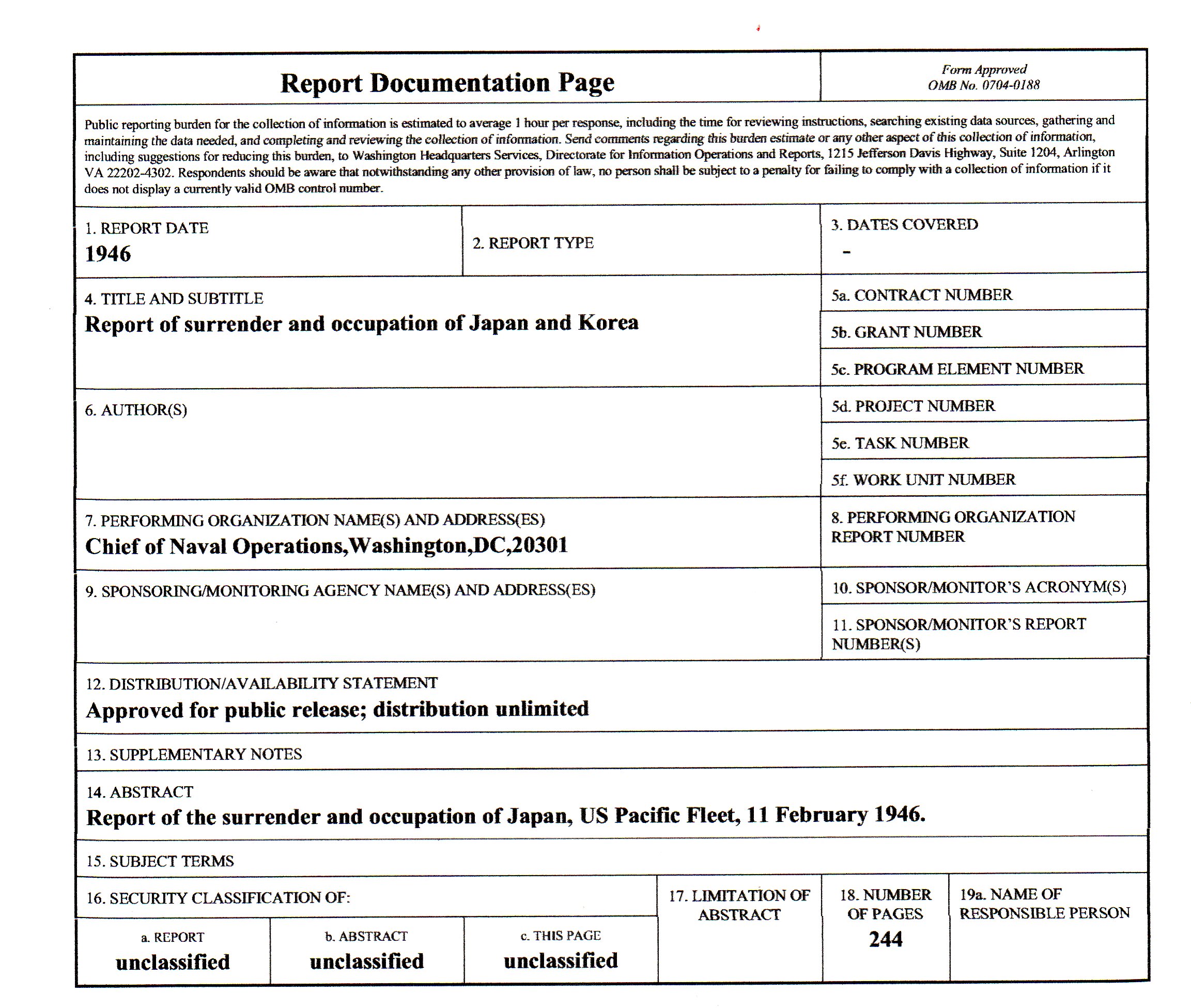 Report of Surrender and Occupation of Japan and Korea
