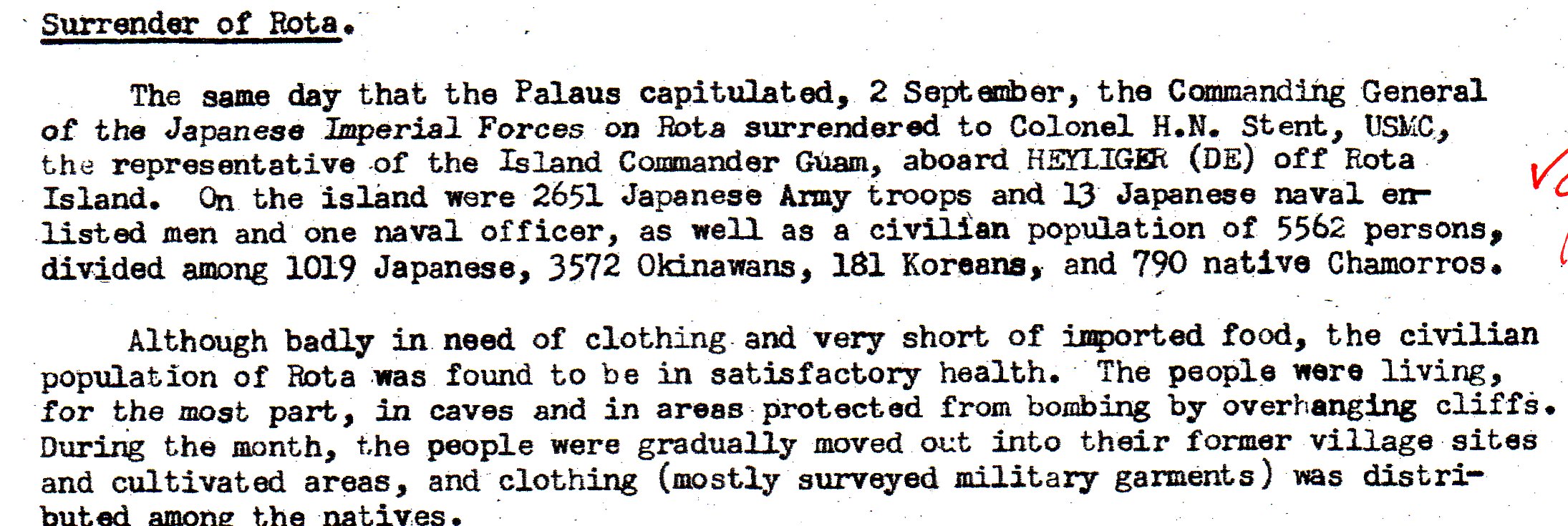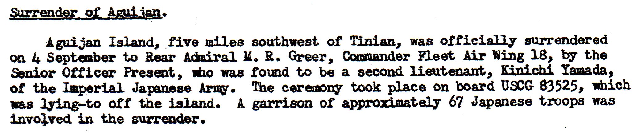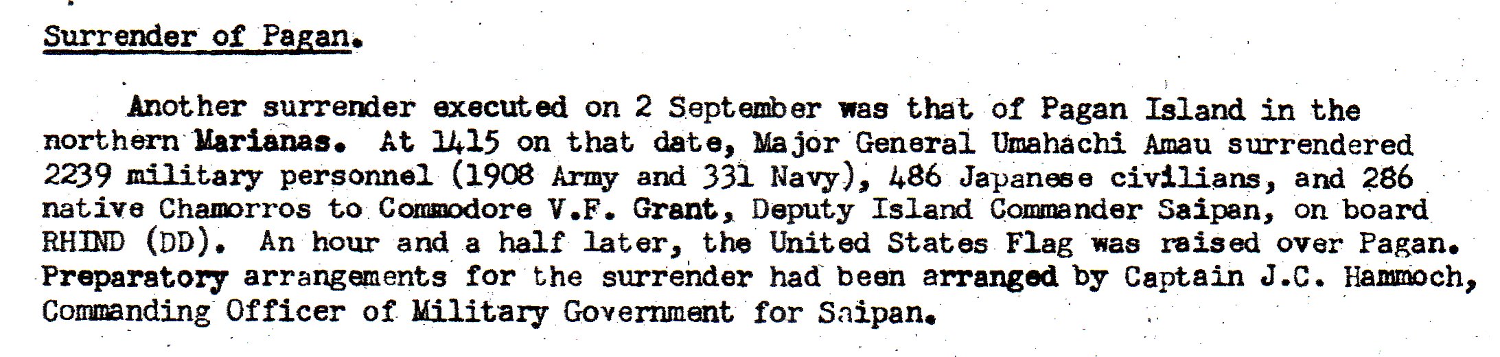 Pagan island in the northern Marianas. Over 2200 troops were left and 486 Japanese civilians, all of whom had a very limited food supply left to them. Within a couple of weeks or so they would have run out of food.