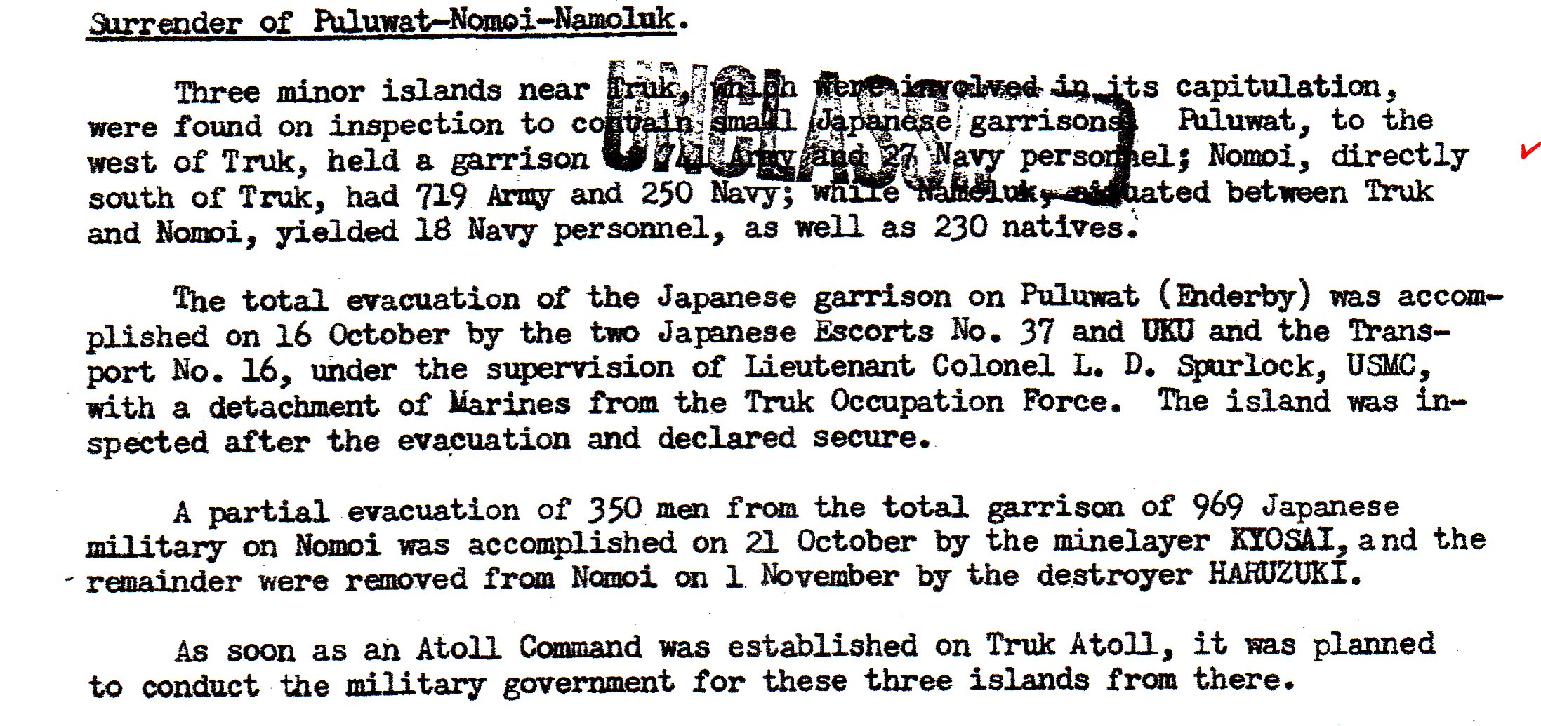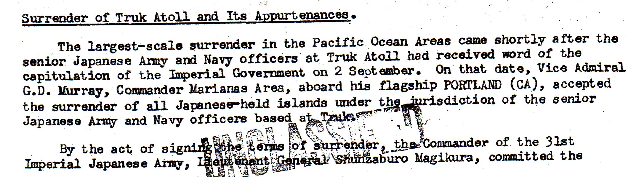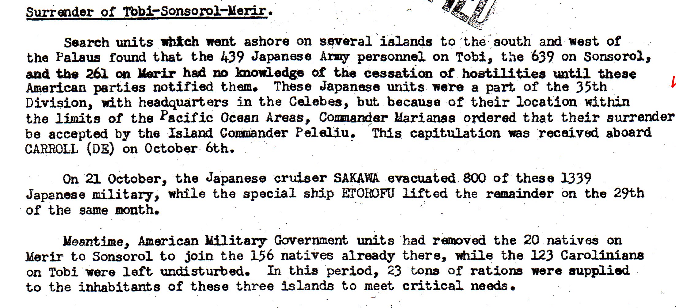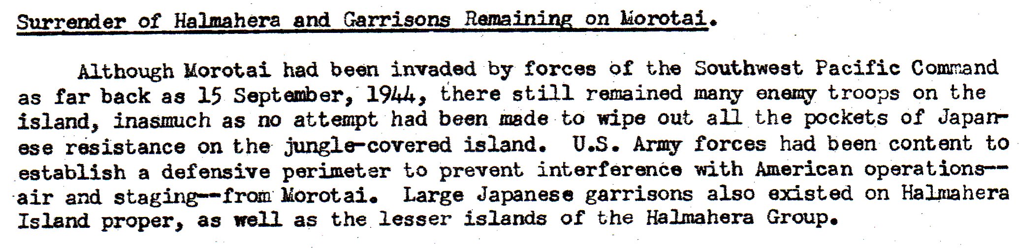 This deals with the Morotai surrender. This was one of the islands where the U.S. had invaded but taken over only parts of the island, living some isolated Japanese garrisons in hill and jungle areas.