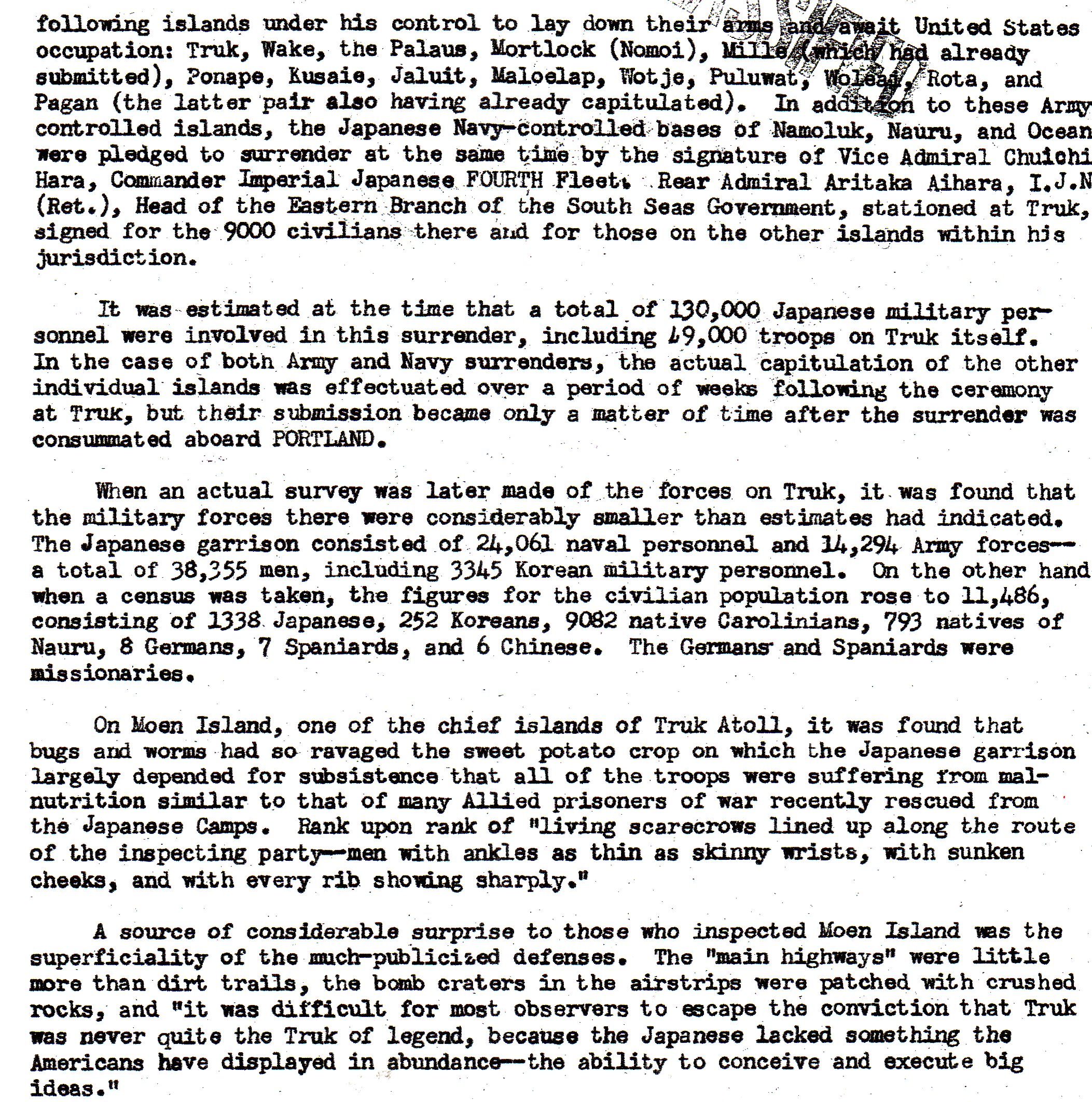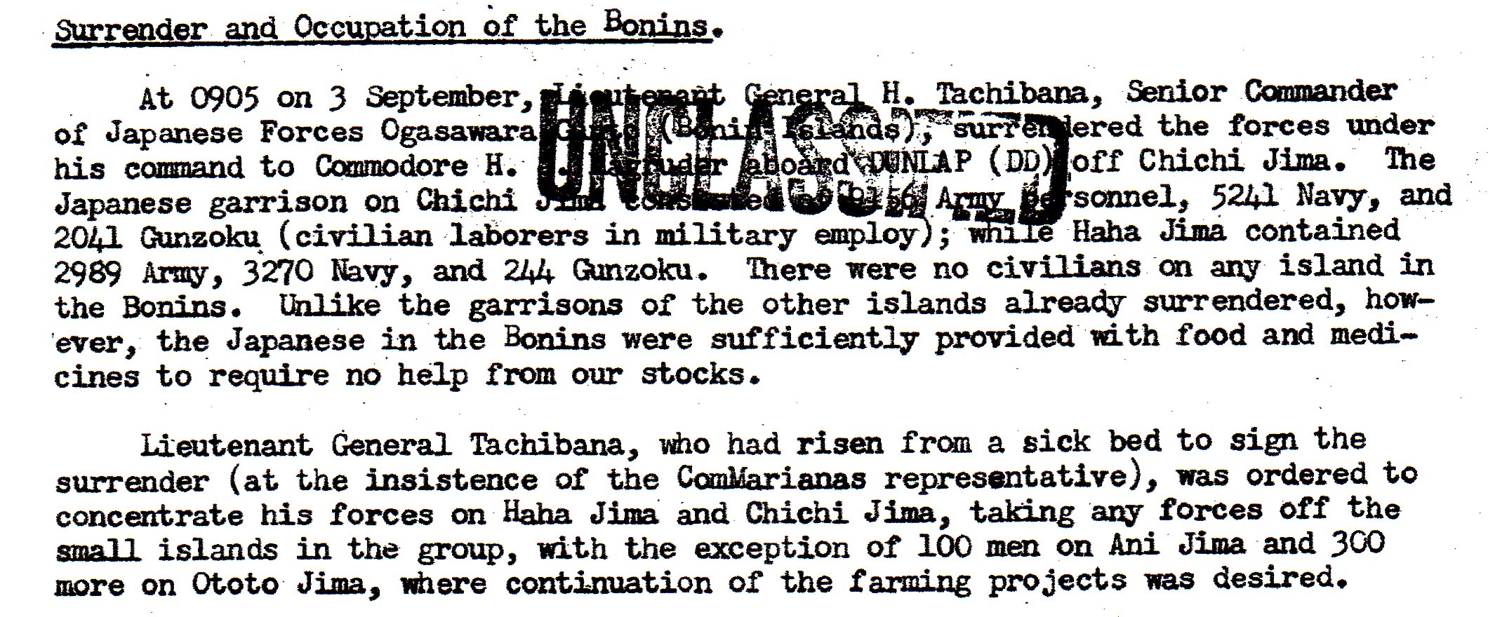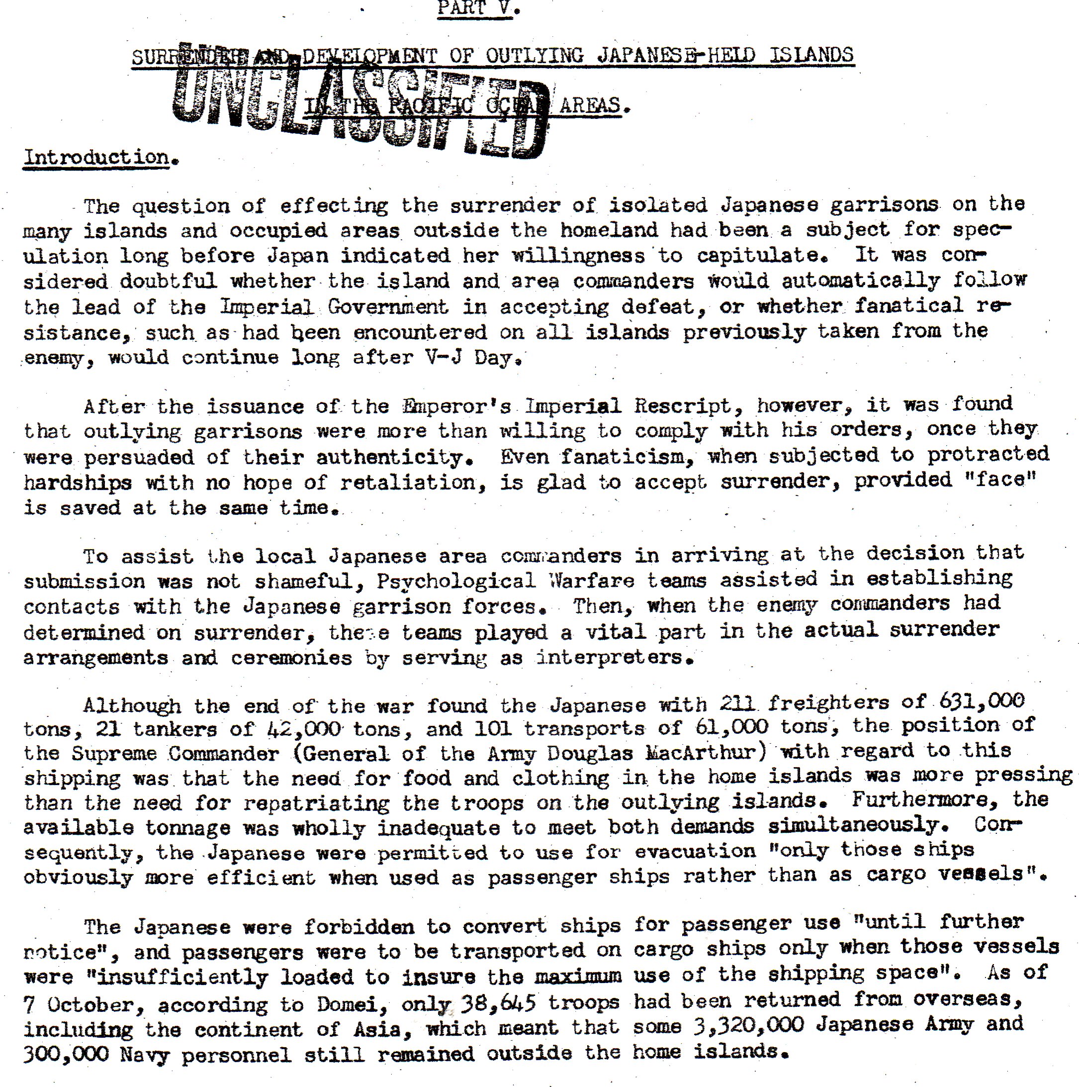 This is the introduction to the report. It shows that the U.S. did not know how the separated Japanese garrisons would react. They might go along with the general surrender, or they might try and fight it out. In general, things went well.