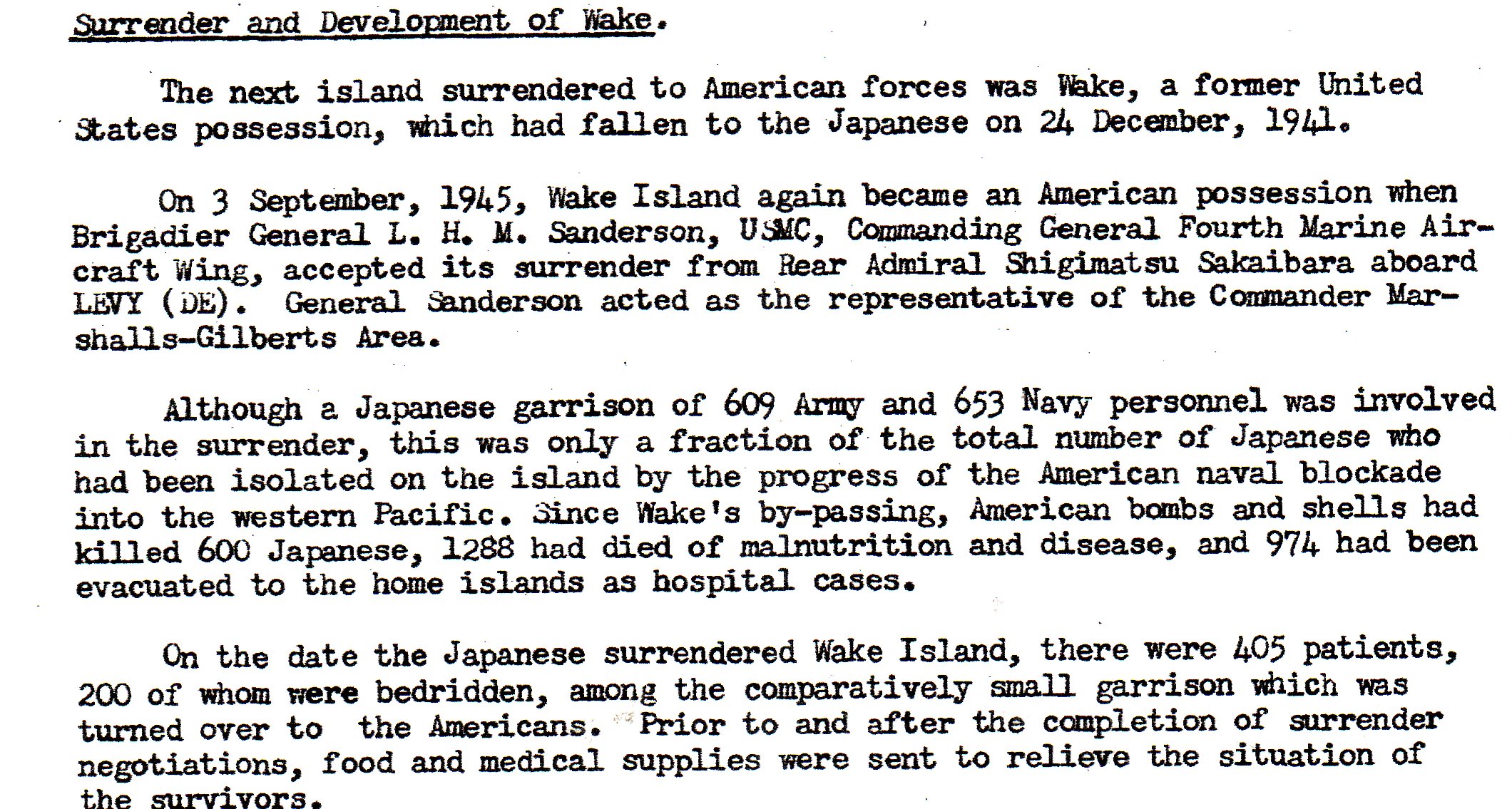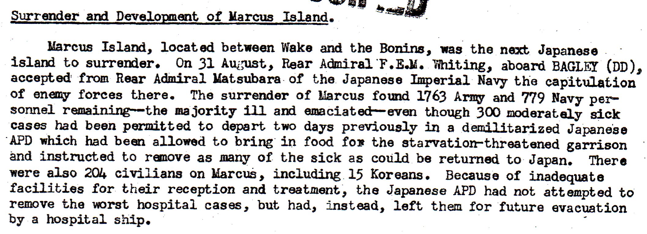 Marcus Island, located between Wake Island and the Bonins. There was around 2500 Japanese troops there, most ill and emaciated.