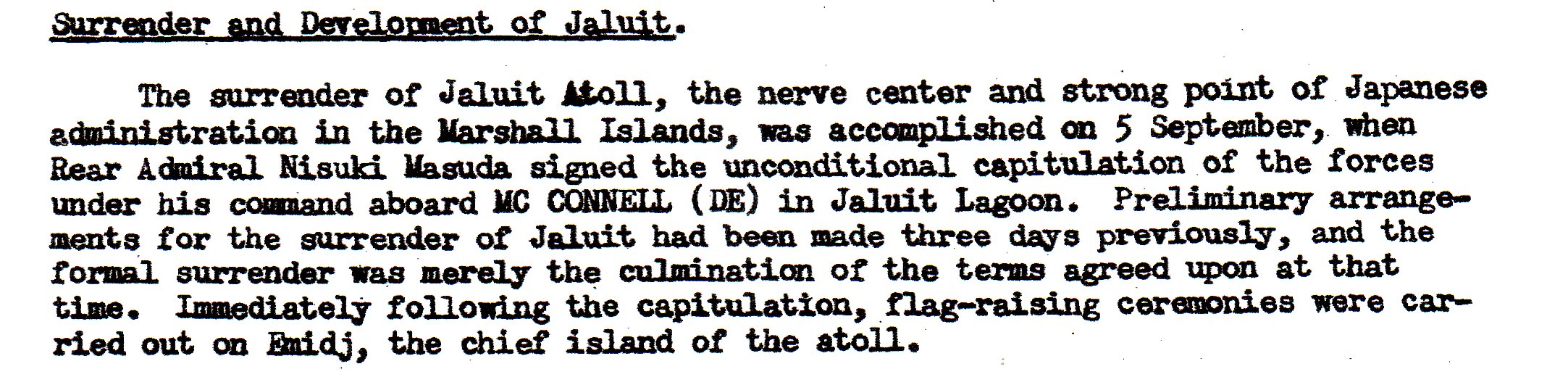 Jaluit in the Marshall Islands. There were originally 2205 Japanese troops, and 1903 were left to surrender, making them a very fortunate group indeed to have so many still alive of their original number.