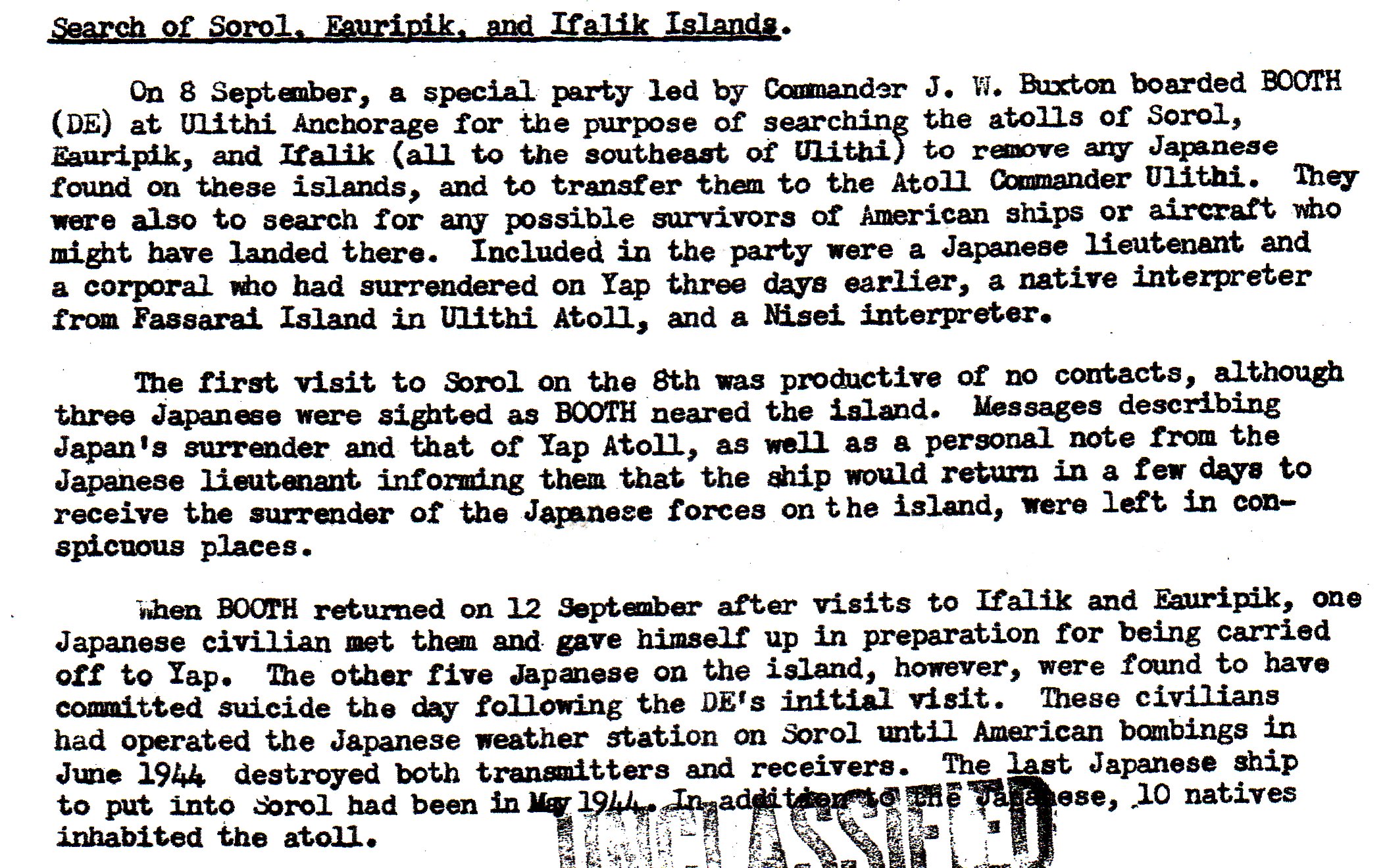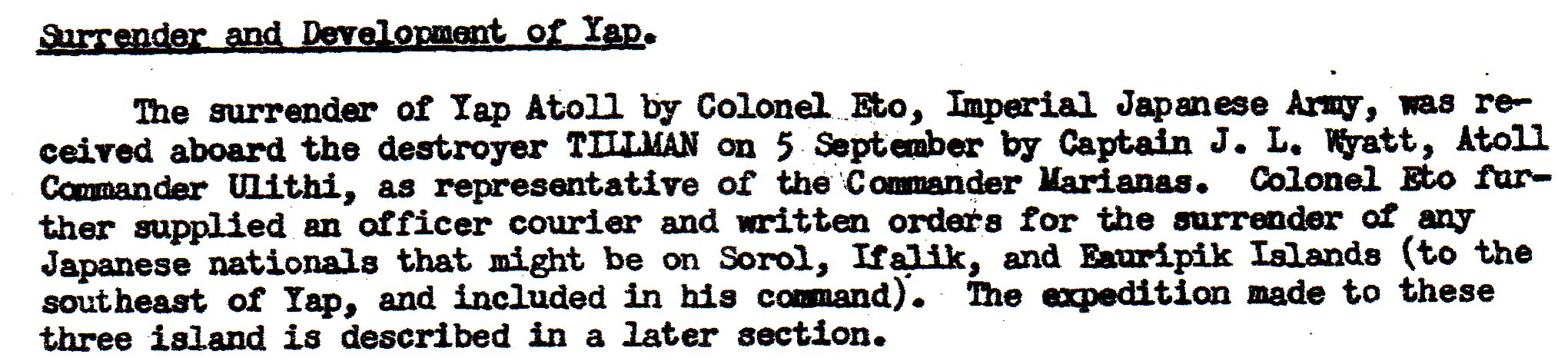 This section deals with some islands south and west of the Palaus that had some Japanese troops on each island. None of the groups knew that the war was over.