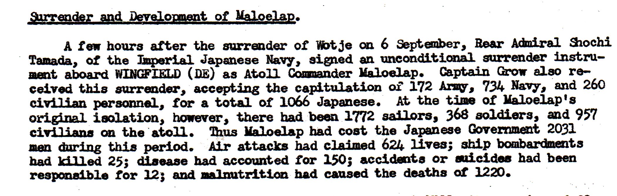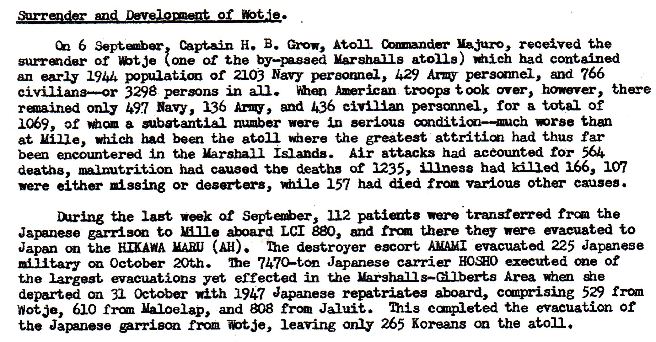 Wotje Island, in the Marshalls. Originally there were 3298 people on the island, counting troops and civilians, both. There were 2103 Navy personnel; only 497 lived long enough to surrender. There had been 429 Army men, and only 136 were left. Out of 766 civilians, only 436 survived. Although 564 of these people had been killed by U.S. air attacks, malnutrition killed 1235 and illness killed 166.