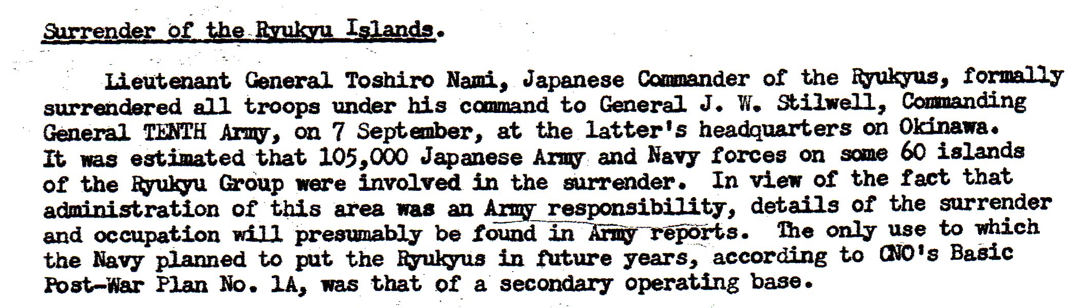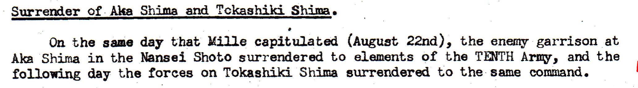 This deals with the surrender of troops on Aka Shima and Tokashiki Shima. These are both somewhere in the Ryukyu Islands, according to a map in the report.