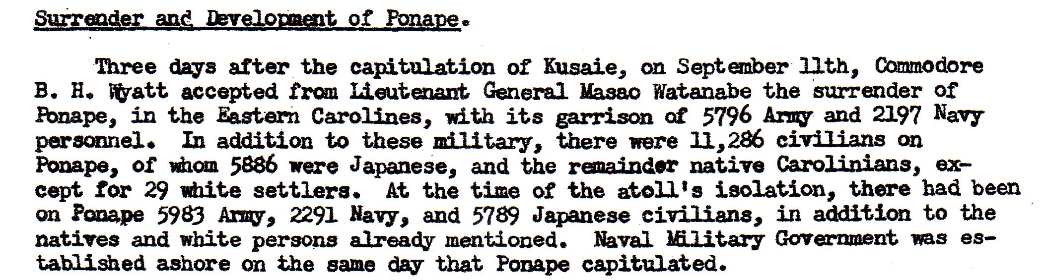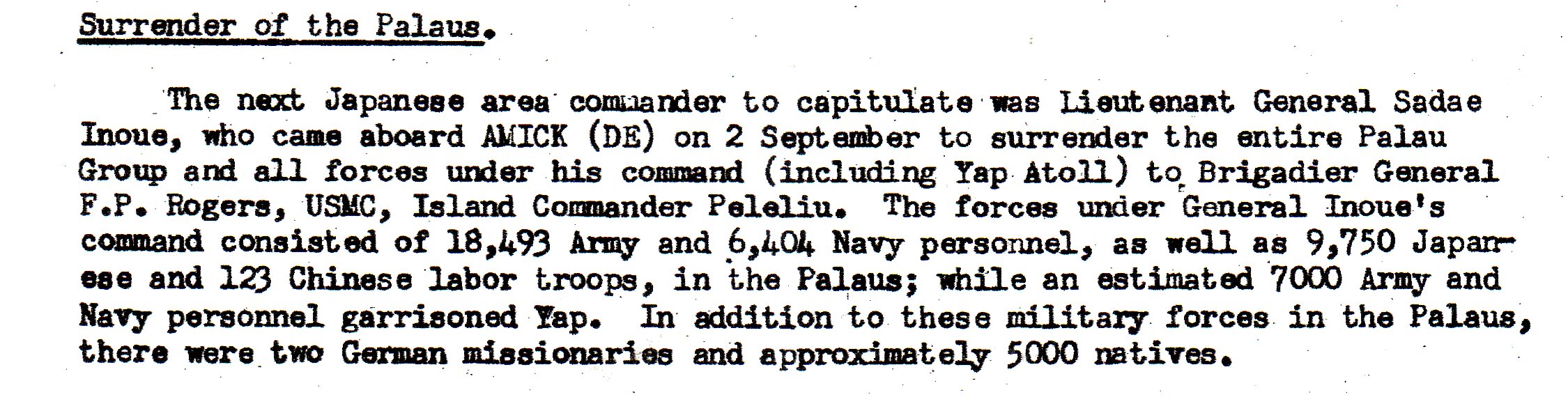 The Palaus. Lieutenant General Sadae Inous was the commander who surrendered this area. There were a fair number of Japanese troops left here, and various labor troops.
