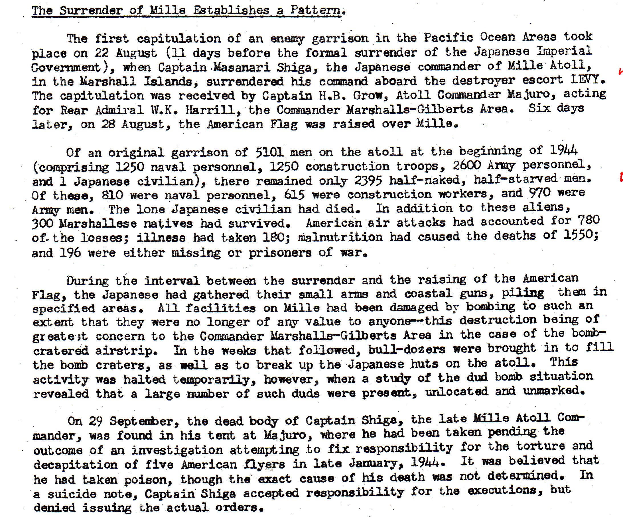 This one was in the Marshall islands, and was Mille Atoll. the Japanese commander was Captain Masanari Shiga. The troops originally numbered 5101. There were only 2395 left, and they were half-starved, according to the report.