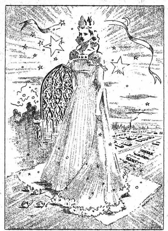 Page 1: Miss Shigeko Nakano chosen center queen; voting; winners of raffle drawings; queen contest committees; sports.