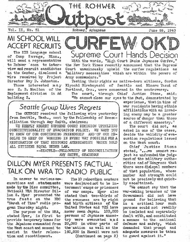 Page 3: Outpost loses editors; student relocation will be accelerated; now showing; co-op congress to meet; H.S. typewriters finally arrive; Rohwer school library adds many current popular books; head librarian speaks tomorrow; center library open evenings; head librarian speaks tomorrow.
