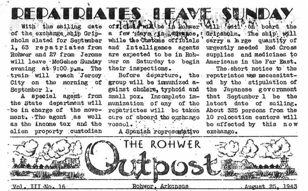 Page 1: Segregation group 1 to leave on Sept. 14; Red Cross mail contact with Gripsholm arranged; ration book use taboo; high schools start semester on Monday; Chicago conference for interested; 54 exchanged substitutes to be housed in Rohwer.