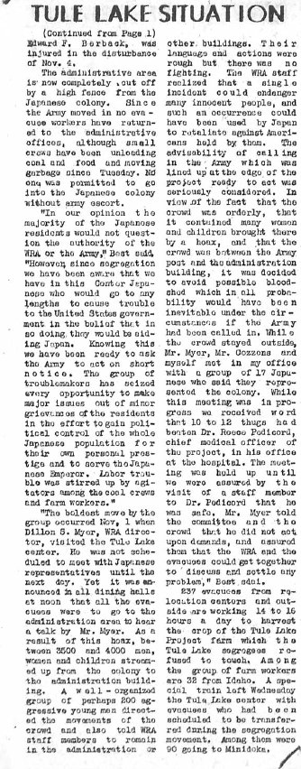 Page 1:Editor Saiki leaves center; subsistence grants; councilmen elected; poppies sold for Armistice Day; farm yields winter crops.