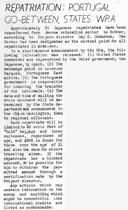 Page 4: Inter-center visitor describes relocation life in Colorado; club notes; mochi to tickle palates of New Year merrymakers, promised; midwest paper to publish daily accounts of Arkansas centers (in the St. Louis Dispatch); Rotarians to tour center; vital statistics; here's your chance, grables and gables.