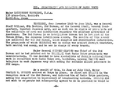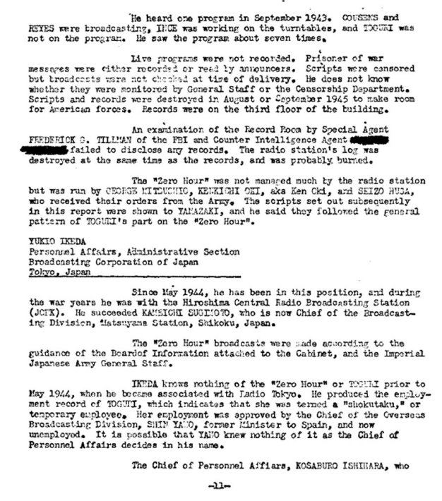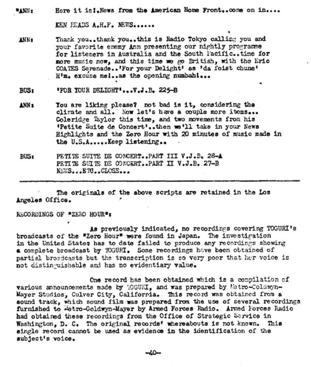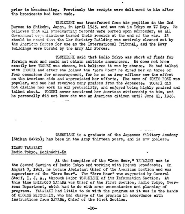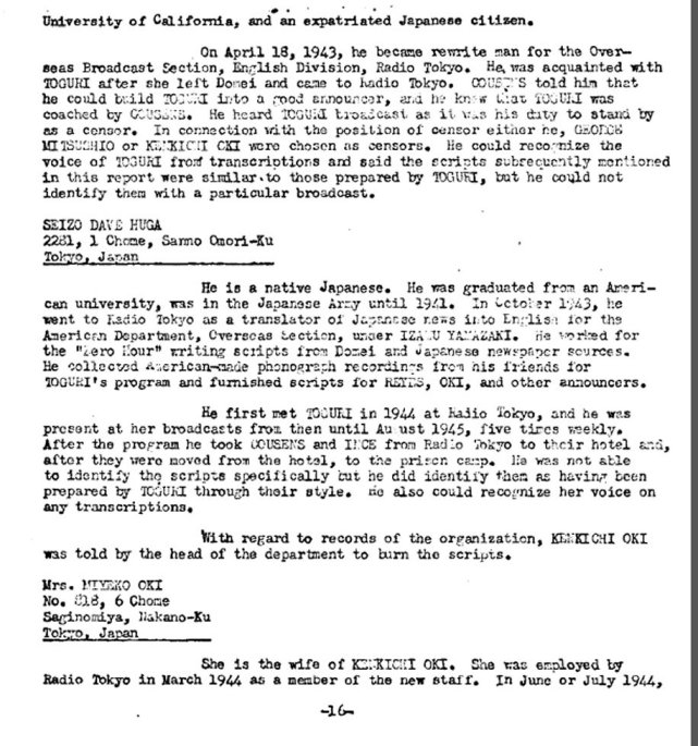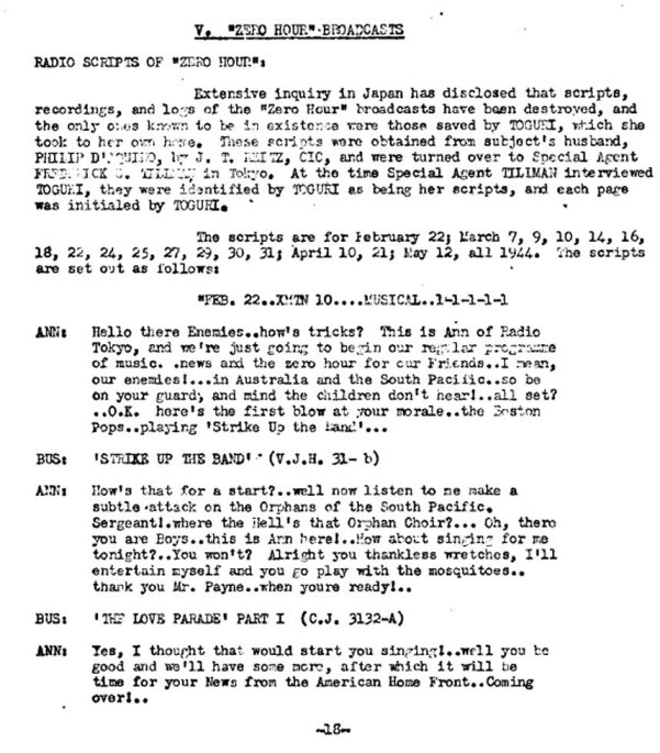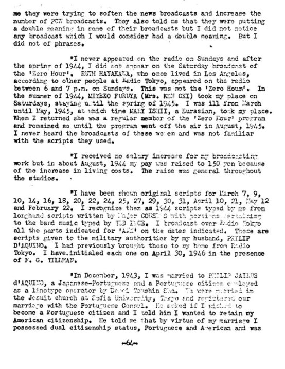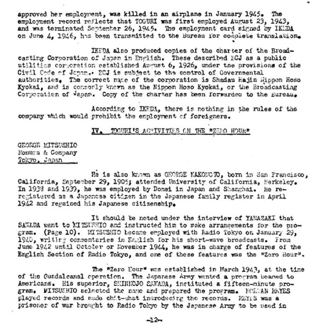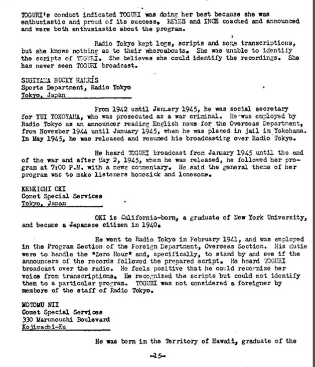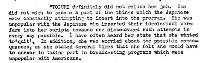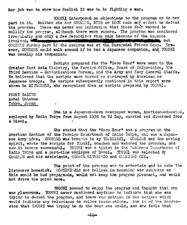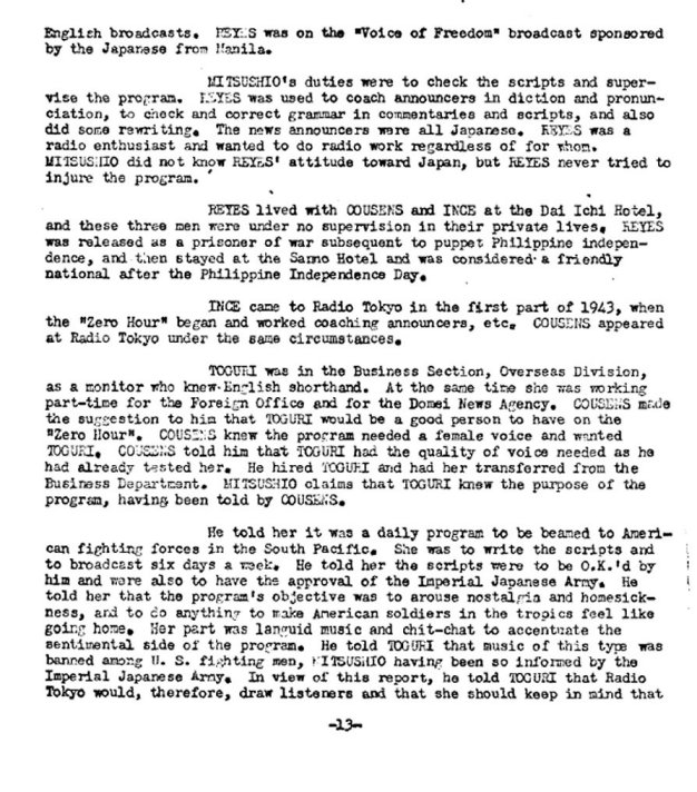 Then the information on Radio Tokyo begins. Various people involved are covered. One of the most important parts is on page 13 when the report says that she knew the purpose of the program, that it was Japanese propaganda meant to undermine the American effort.