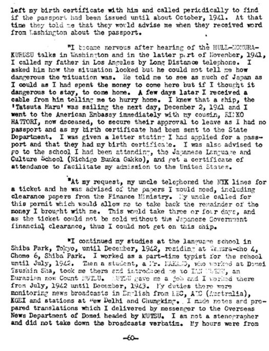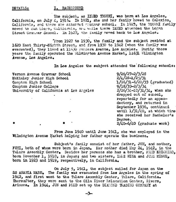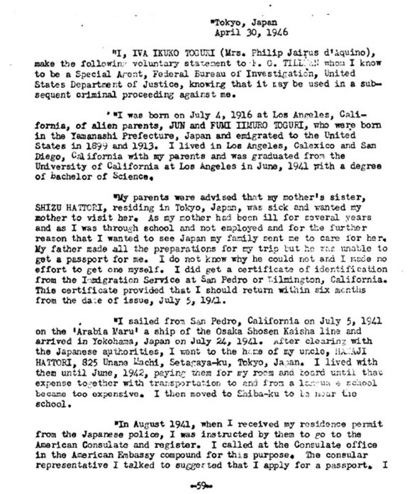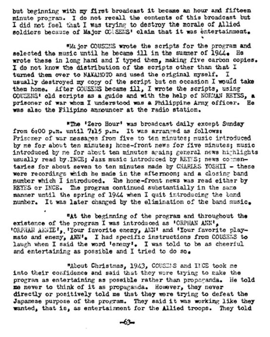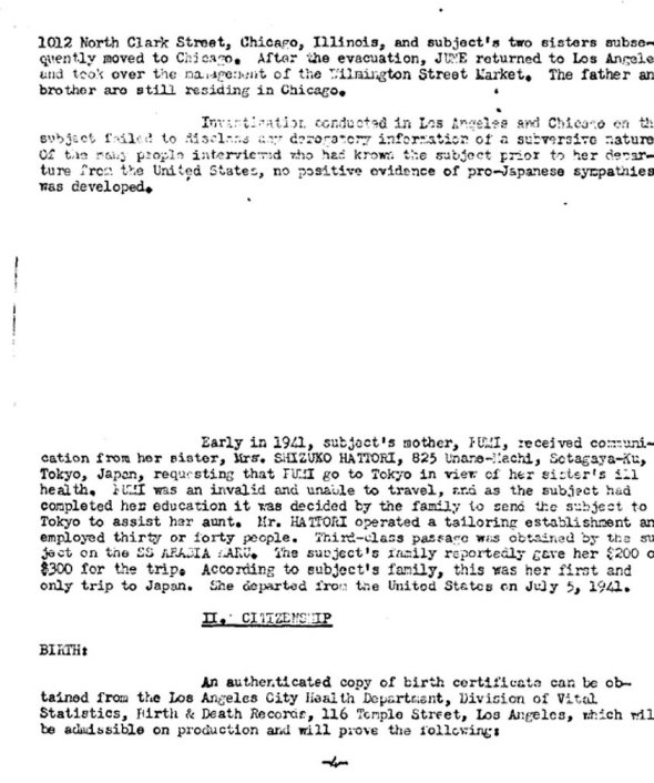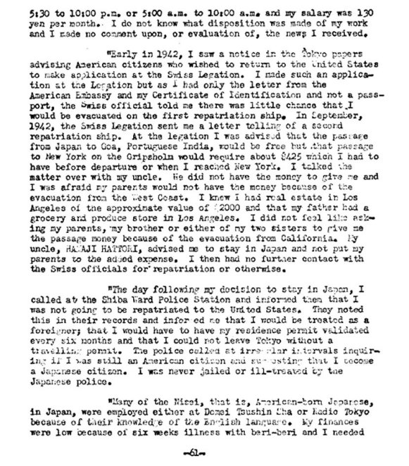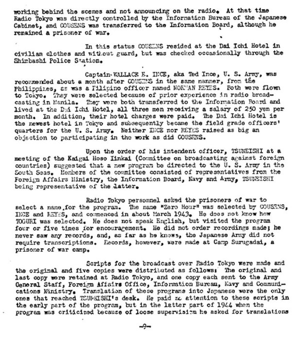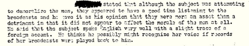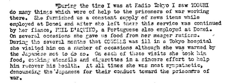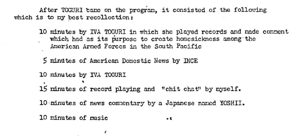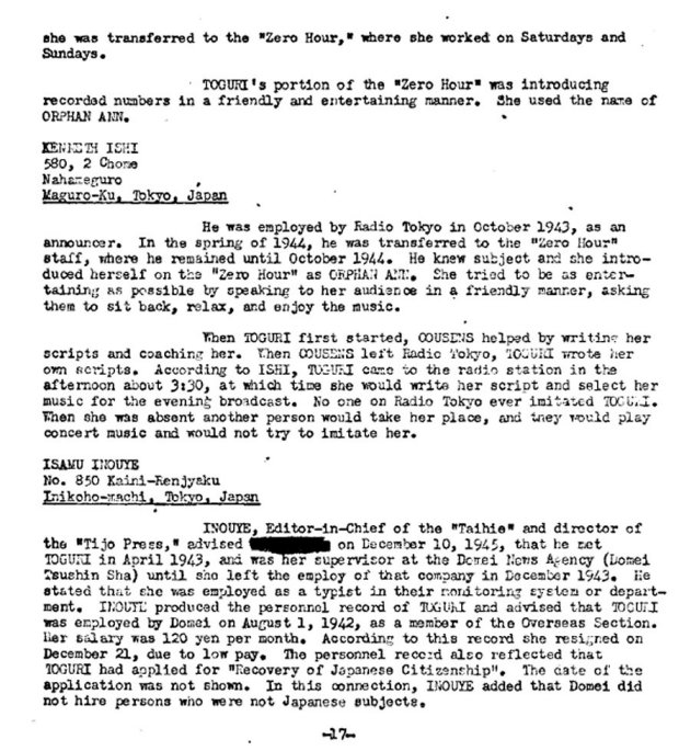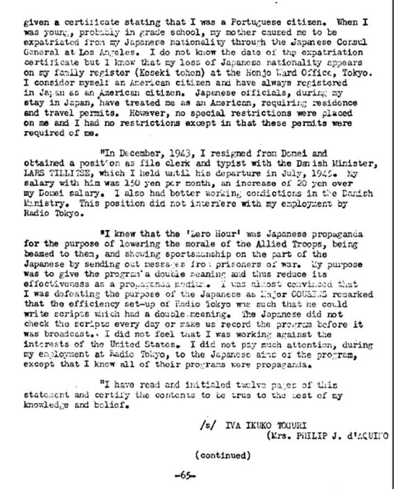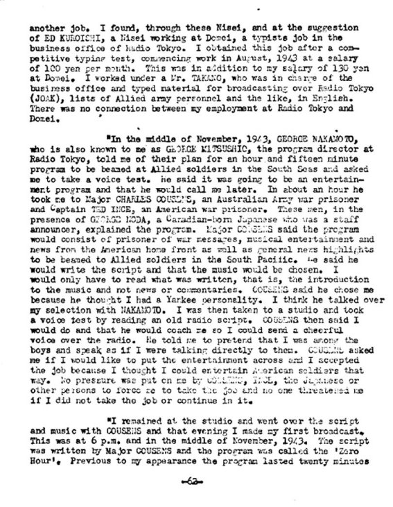 Then the information on Radio Tokyo begins. Various people involved are covered. One of the most important parts is on page 13 when the report says that she knew the purpose of the program, that it was Japanese propaganda meant to undermine the American effort.