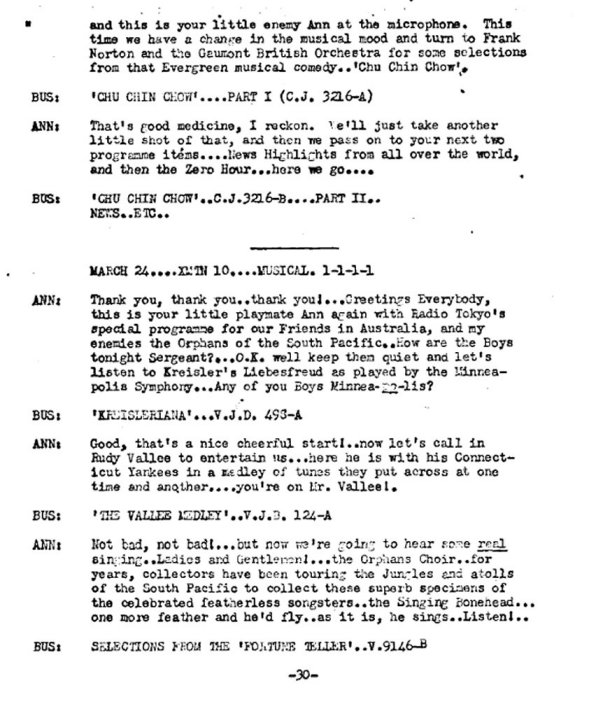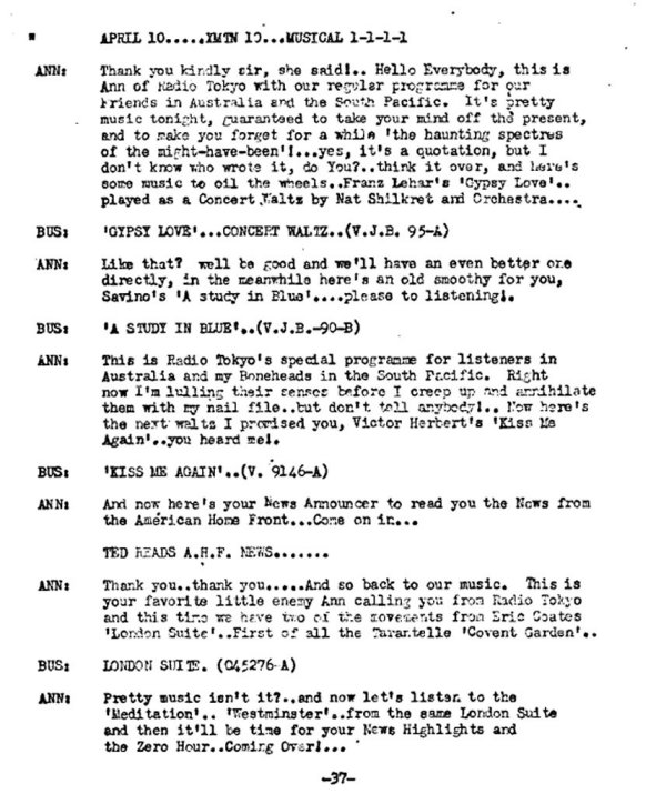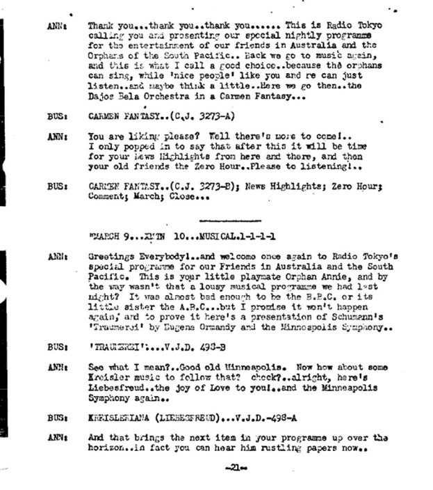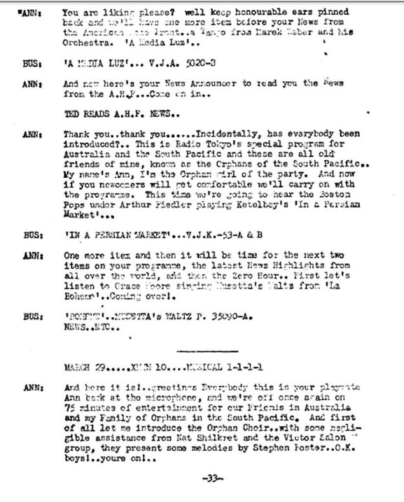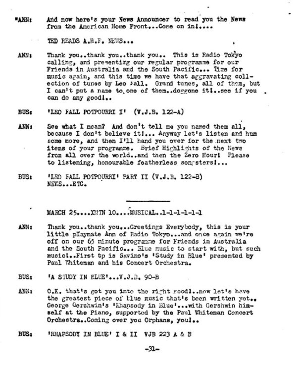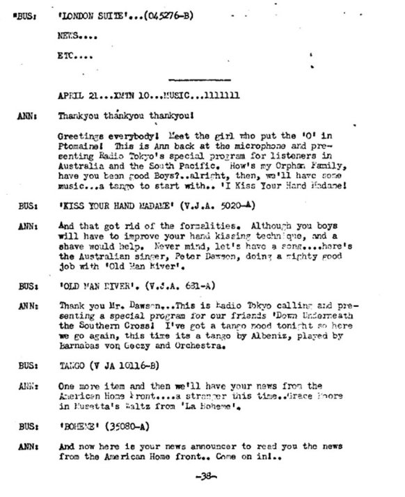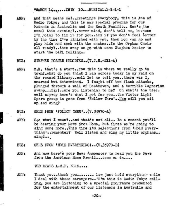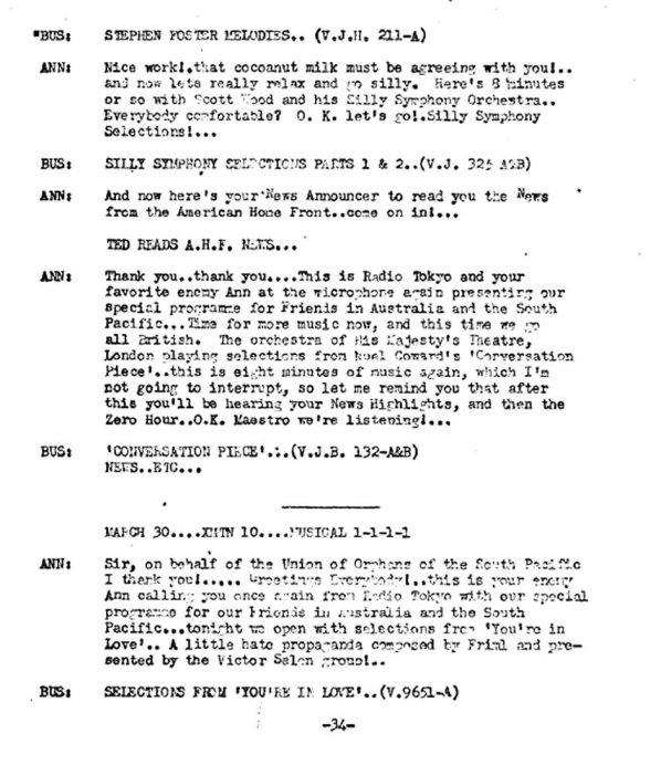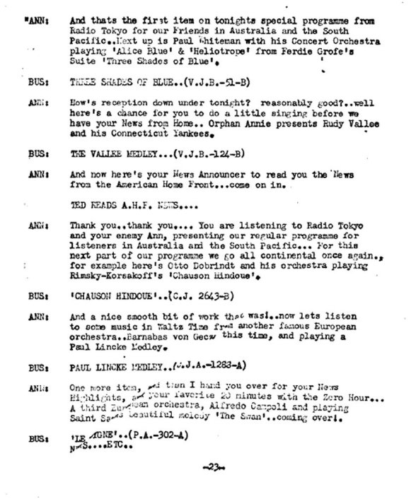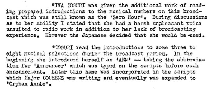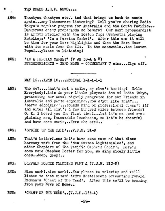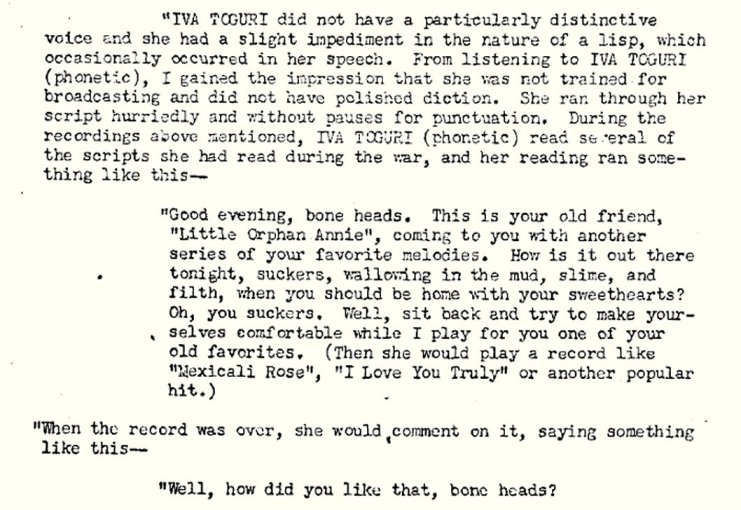 Some things I will just write a few words about, and some things I will include scans from the original work, especially things like the scripts for her broadcasts from Tokyo to American troops. It's a fascinating document to go through.