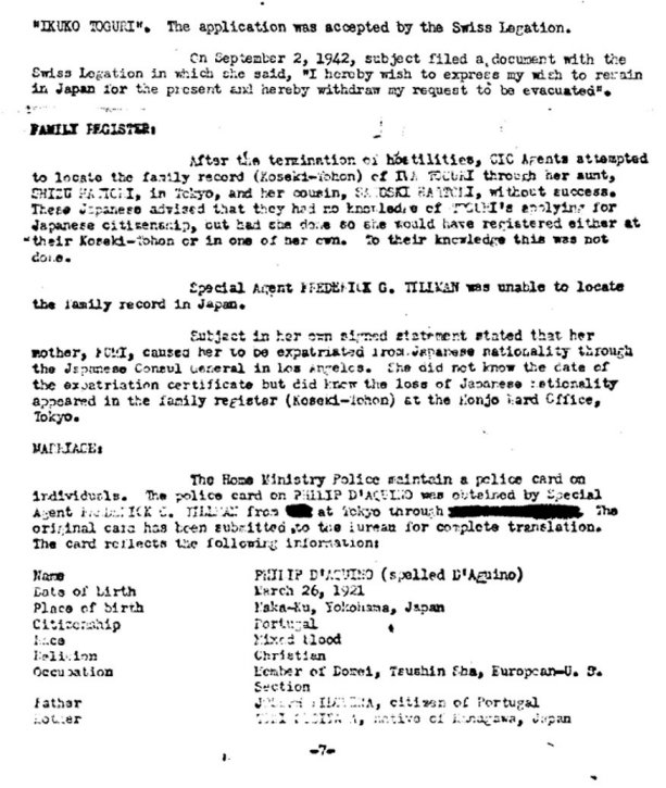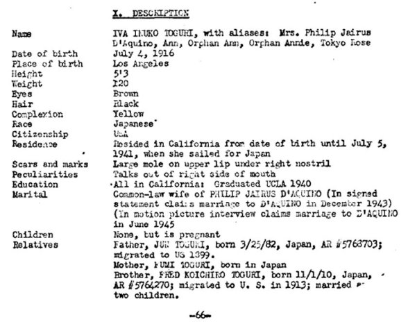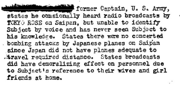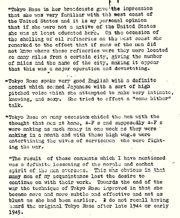 (A lot of the documents refer to orders to interview people and the results of those interviews. A primary target was whether or not Toguri could be physically identified by Tokyo Rose by Americans who had been captured. One of the documents in this section also confirms that the Tokyo Rose-associated broadcasts were not always done by the same person. All this material takes up quite a few pages of the report.)