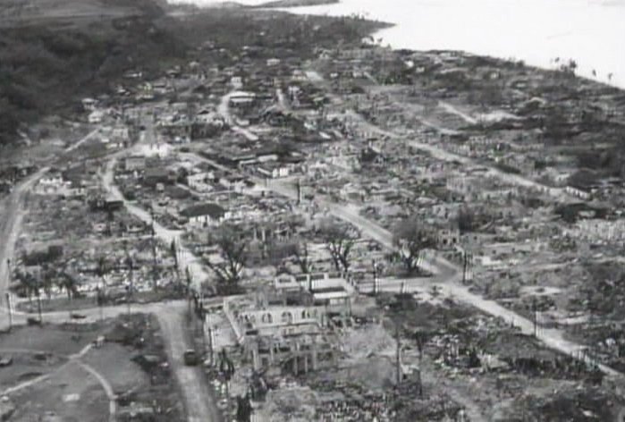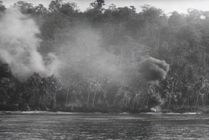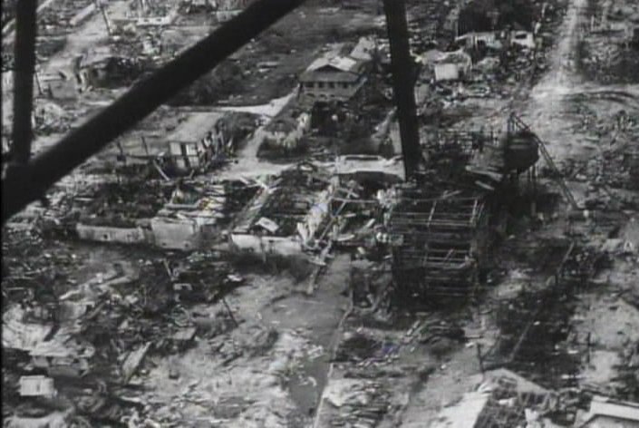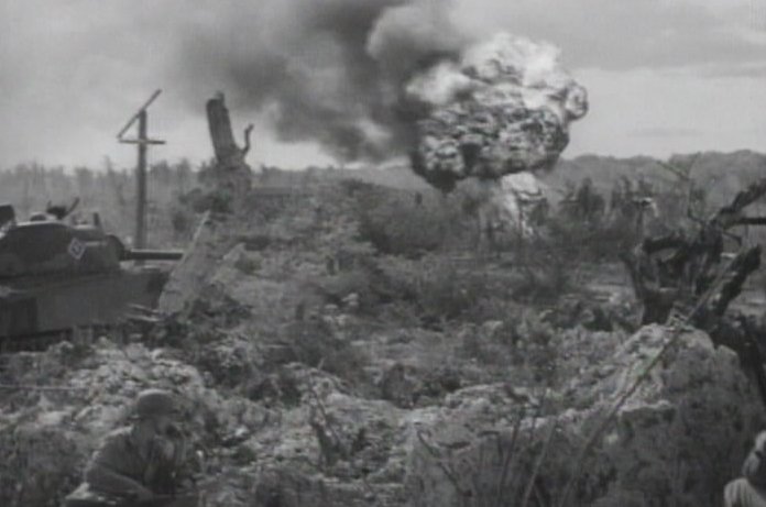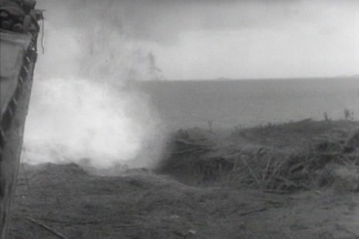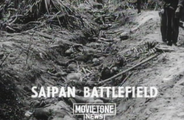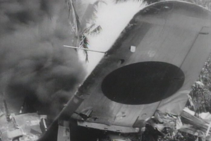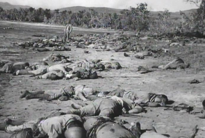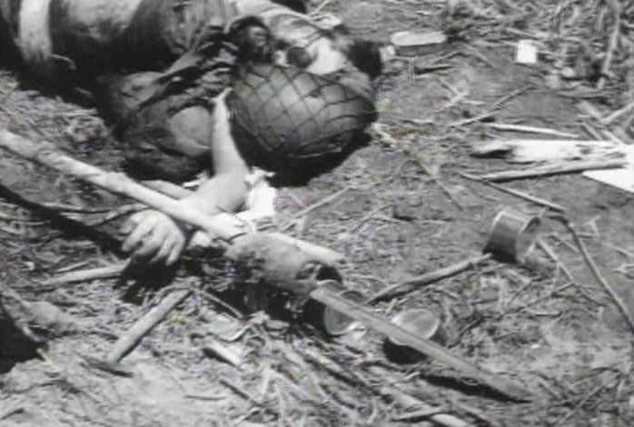 The body of a Japanese soldier. Many had attacked bayonets to sticks, having no regular guns to use. (There are a lot of scenes like this is the series, most of them rather gruesome. This is actually one of the less-gruesome scenes.)