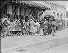Evacuees of Japanese ancestry waiting for the train which will take them to an assembly center from where they will later be transferred to a War Relocation Authority center to spend the duration. |