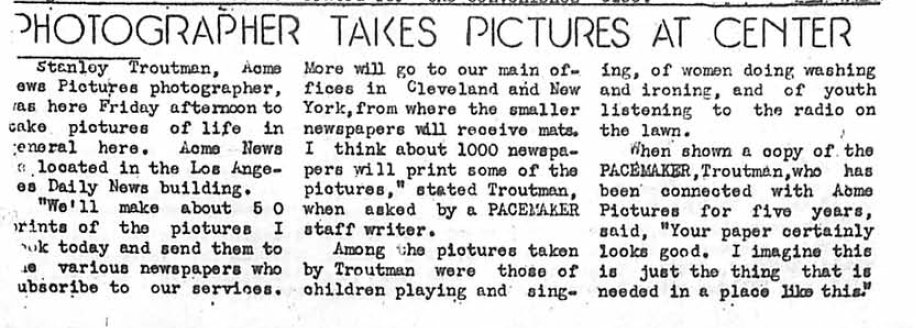 Page 1: The organization of boy scout troops is starting. There's also an article about things going on in the churches. The center needs more professional cooks. The Pacemaker is asking anyone who has the first issue, or the premier issue, to bring them to the paper. (This might explain why my source did not have the first issue or the premier issue.) There's also an article on the importance of recreational activities.
