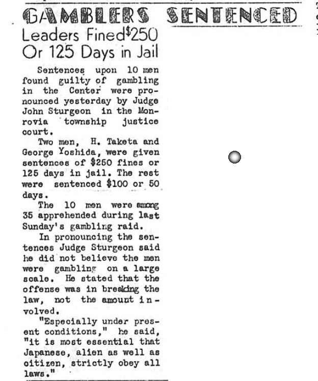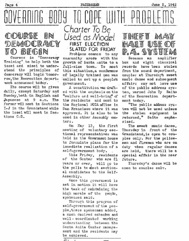 Page 1: The Win, Place & Show column is one the first page for some reason. Section leaders will be chosen in an election on that Friday. The Issei are enthusiastic about the election. The dance for the next night has been canceled. There's also an article on which stall Seabiscuit was kept in.