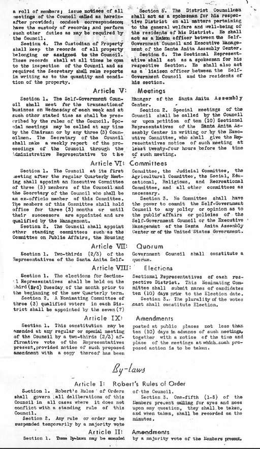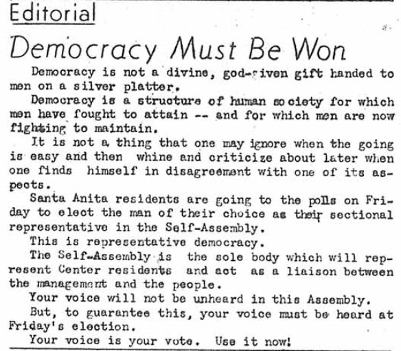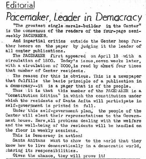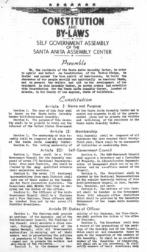 Page 1: 2740 people are taking school courses. The Constitution of the Santa Anita Self-Assembly will be printed in this issue. The Constitution had to be approved by someone in San Francisco.