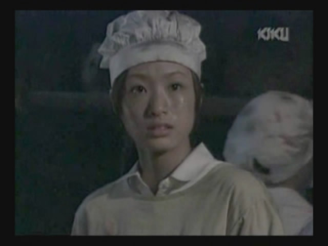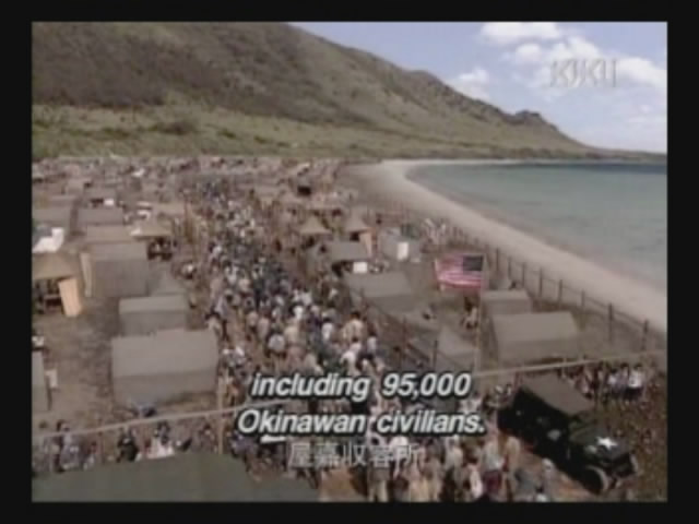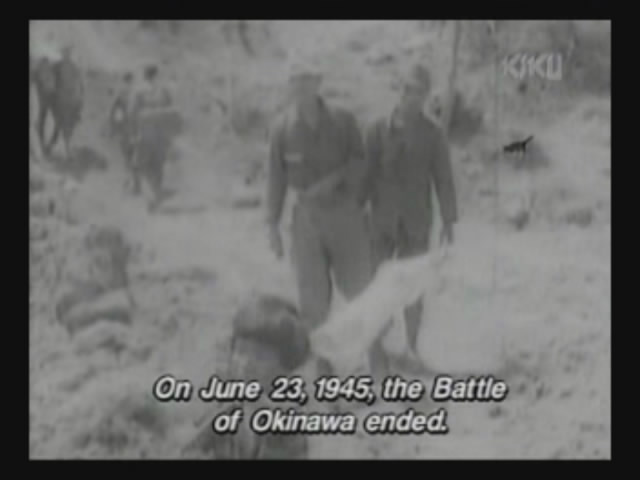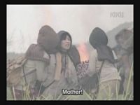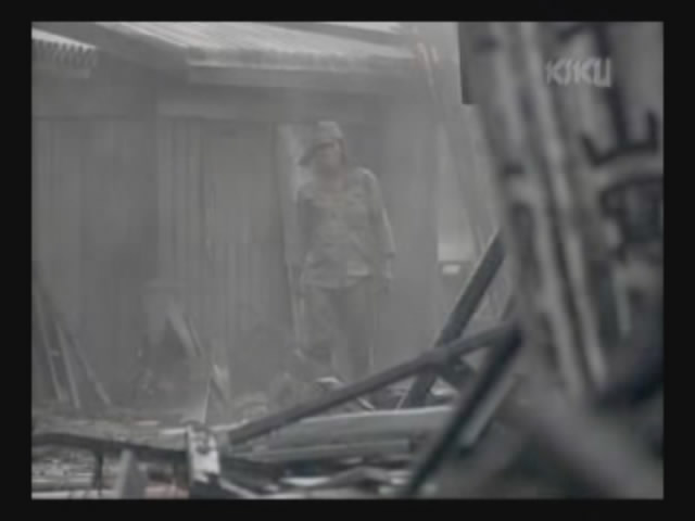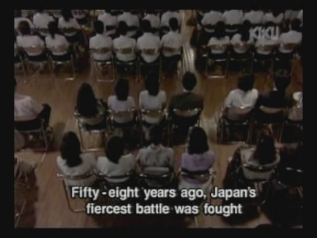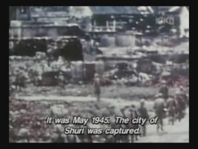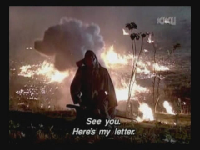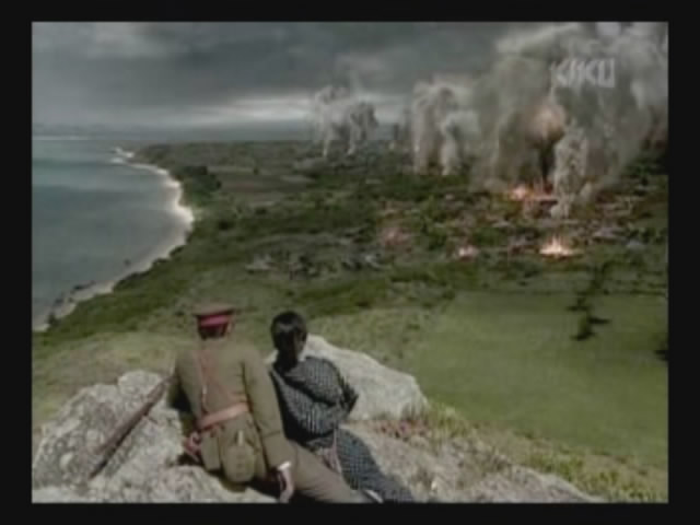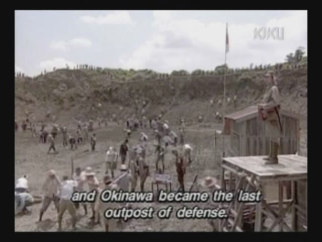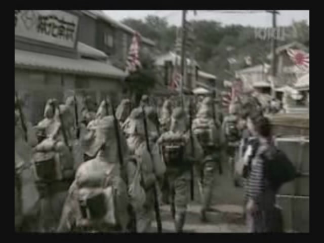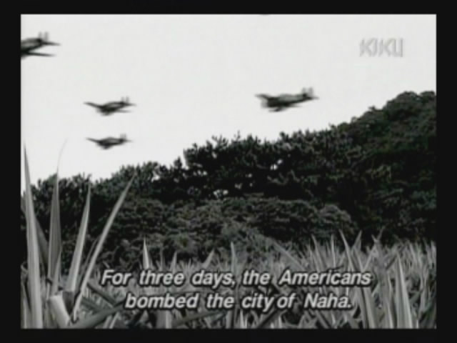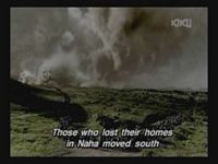 Just as Mie, one of the daughters, is about to jump off the cliff, the scene shifts to where the father has arrived at the ruins of Naha. (Why doesn't he take off the military outfit? There are bound to be some clothes in the wreckage that he can change into. As it is, it's like he's walking around with a bullseye painted on him.)