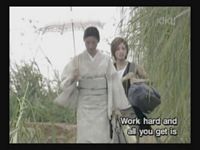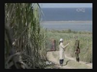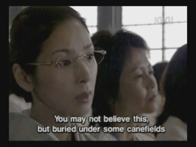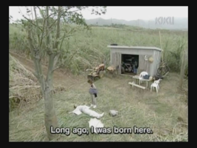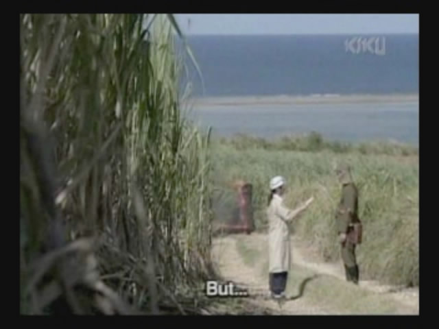 They examine some sugarcane plants that were bent by a recent typhoon, and the older woman explains that they will come back under their own power, just like Okinawa.