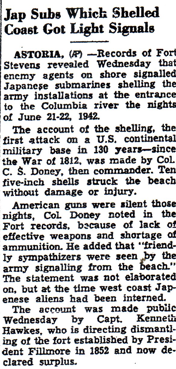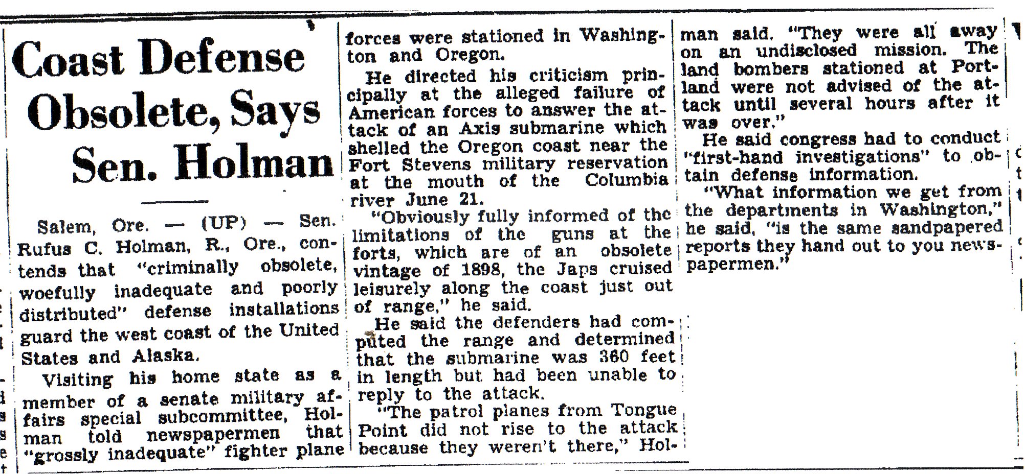 This is a very interesting article. A republican senator from Oregon complained about the “criminally obsolete, woefully inadequate and poorly distributed” defense installations on the coast, pointing out that Fort Stevens had been attacked and its defense guns were from 1898 and there was no immediate airplane response to the shelling.