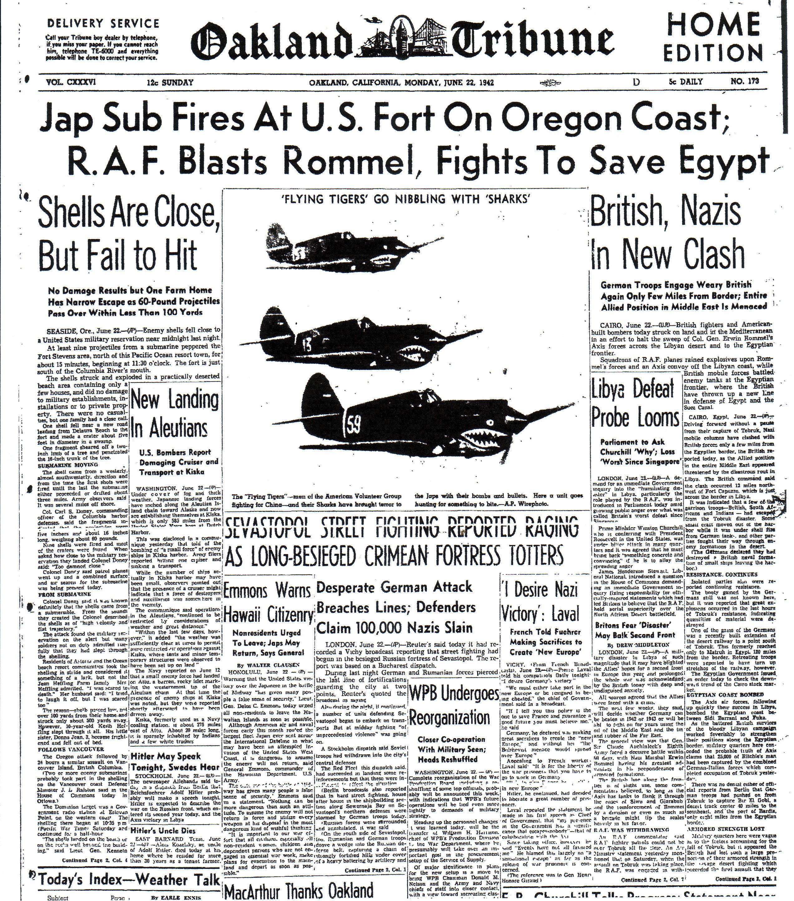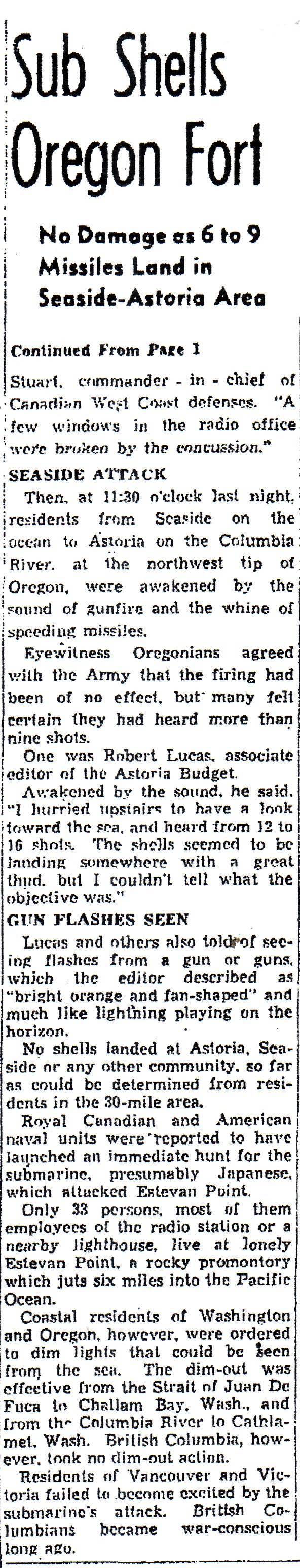 Front page headlines carried the news that the US coastland had been directly attacked by a Japanese submarine. The early report lists only nine shots as being fired, and that the submarine was probably, not positively, Japanese. It also notes that there was no actual damage anywhere, one reason very probably being that the attack took place near midnight, making aiming at targets rather difficult.