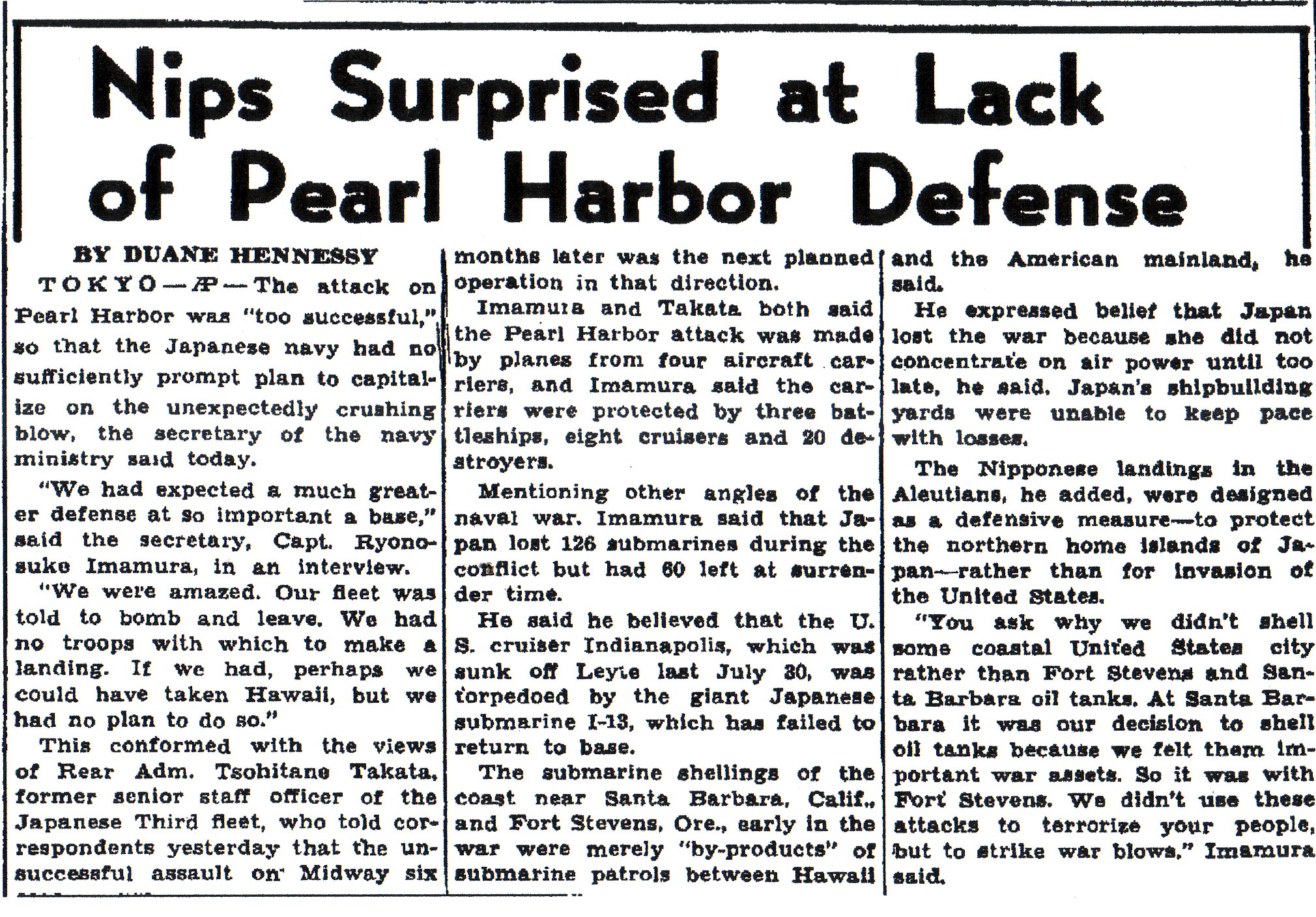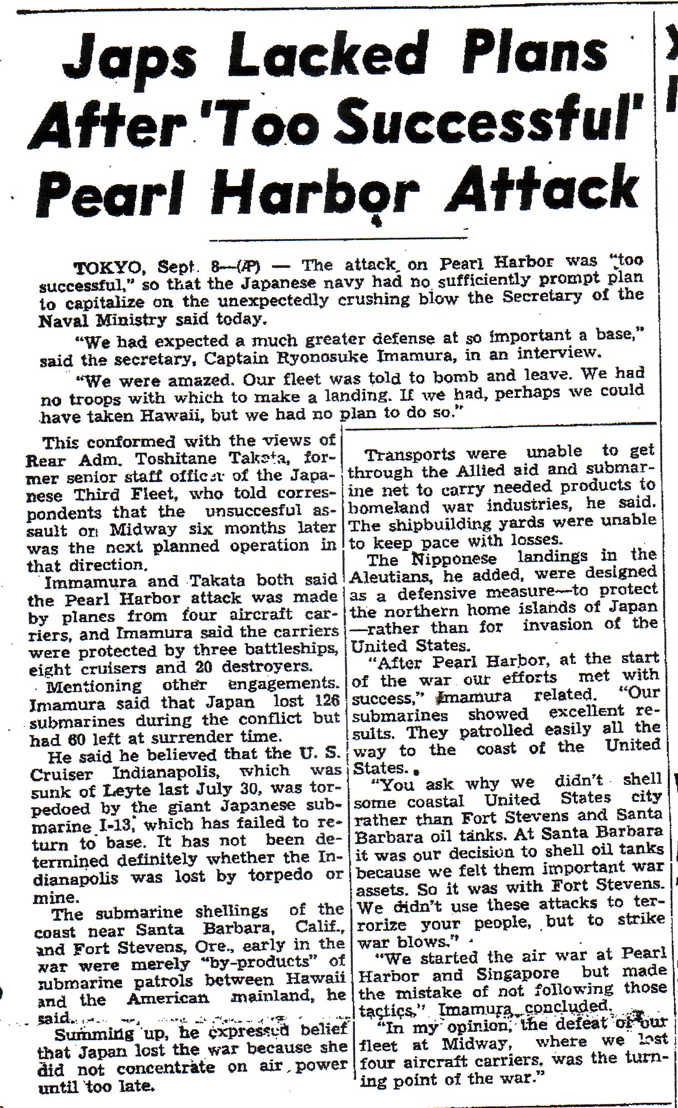 The two articles are quite similar. The first says the attack on Fort Stevens and Santa Barbara were merely “by-products” of routine submarine patrols. The articles quote the Japanese source as saying that Fort Stevens and Santa Barbara were shelled due to oil tanks being present.