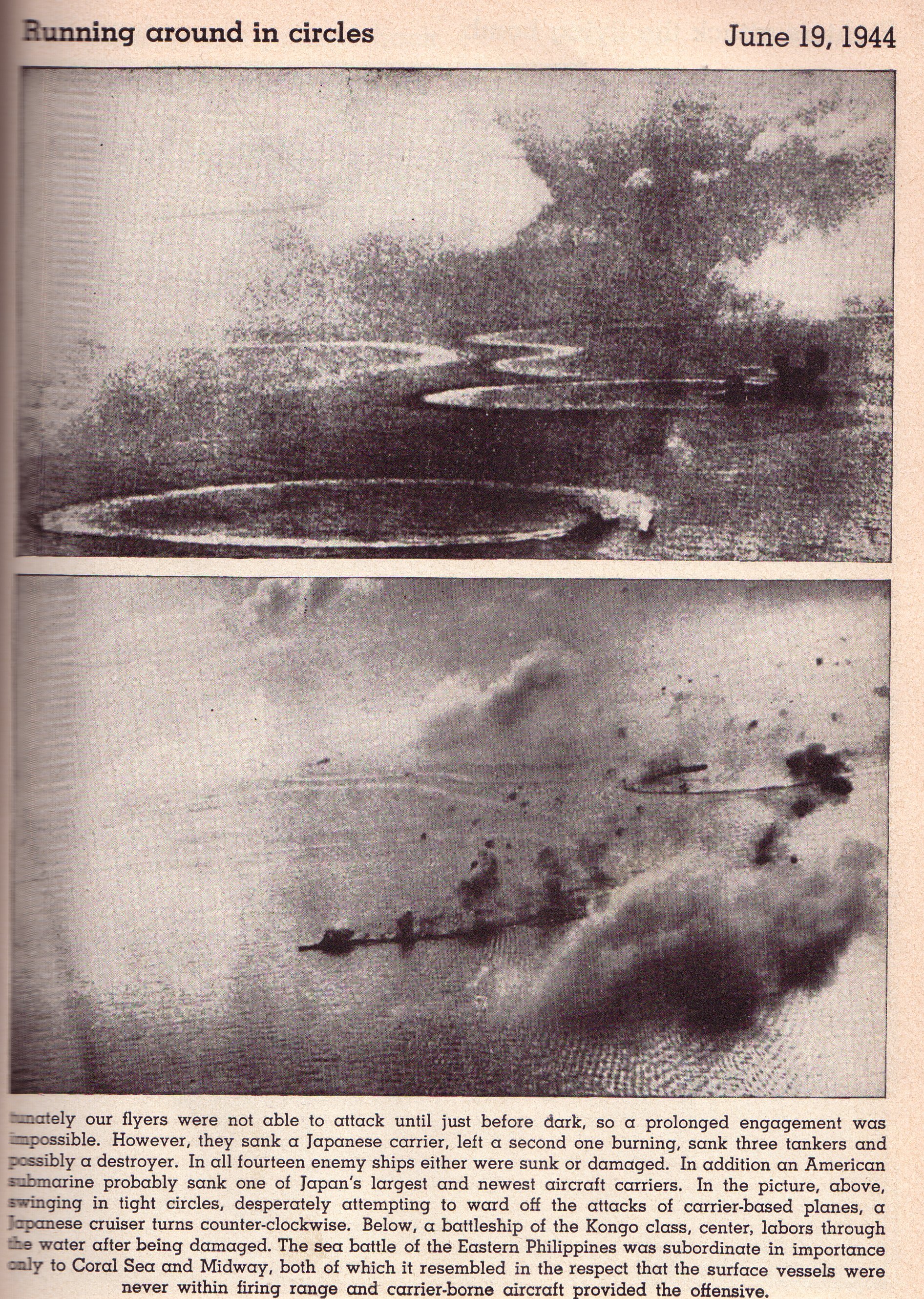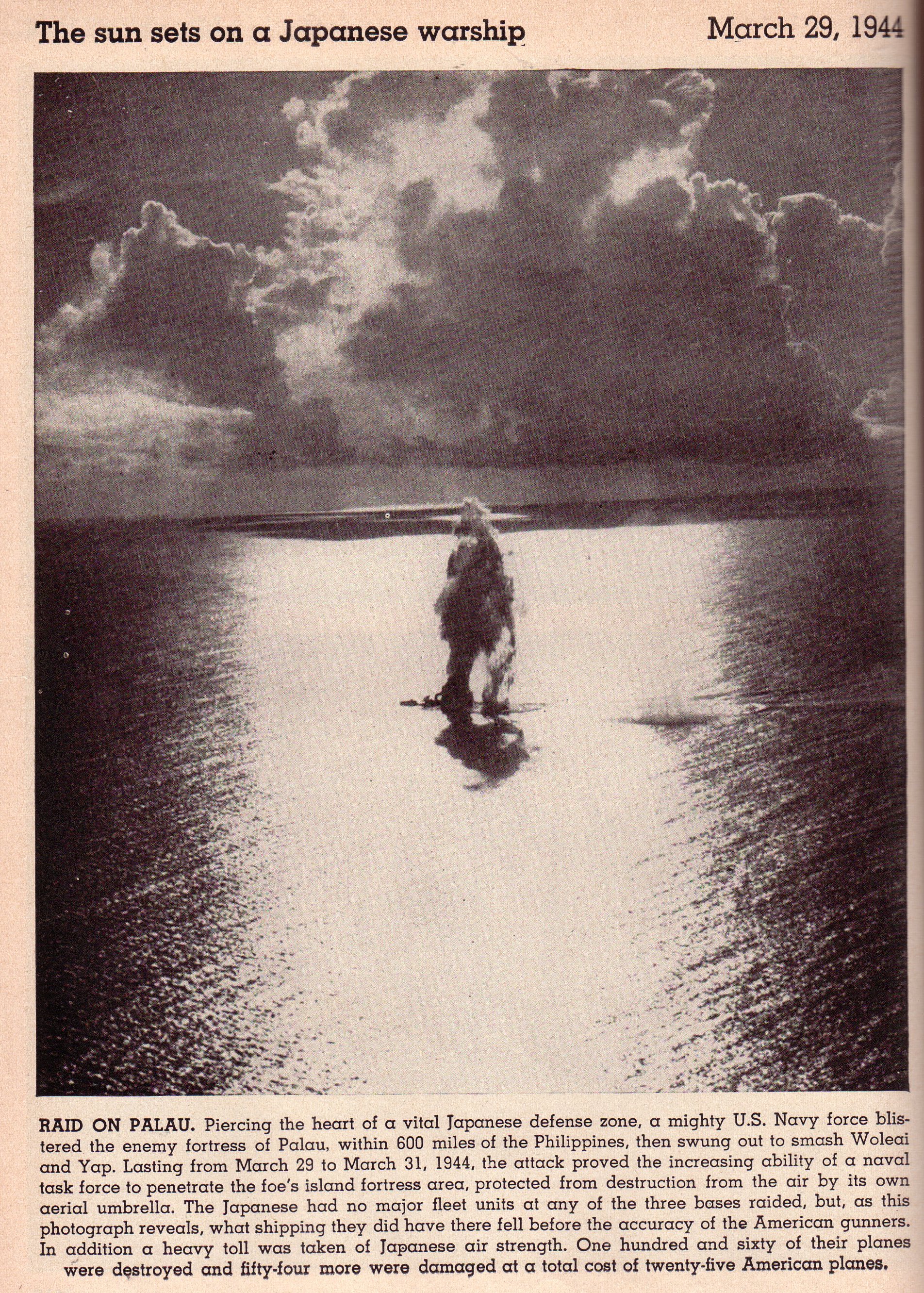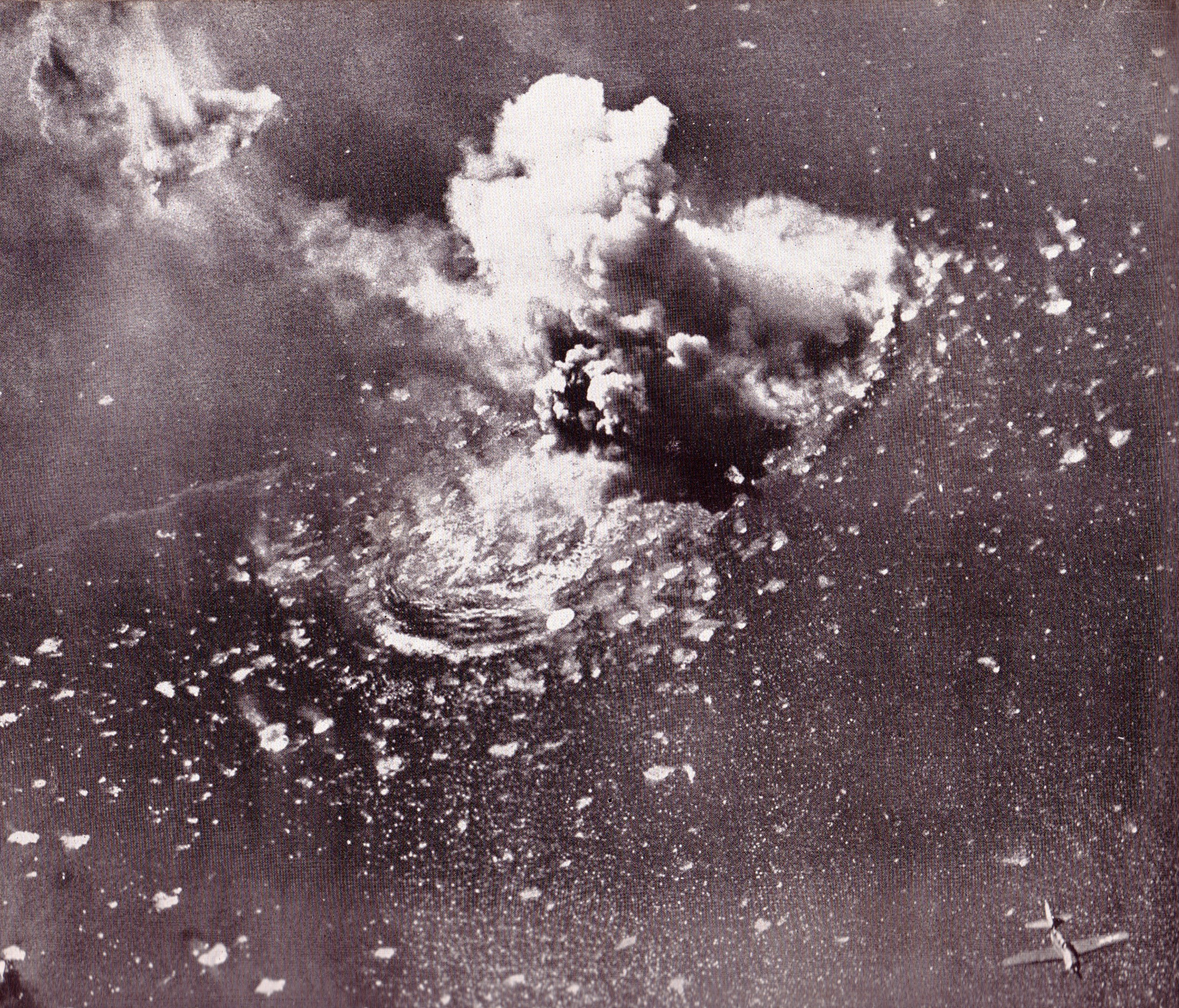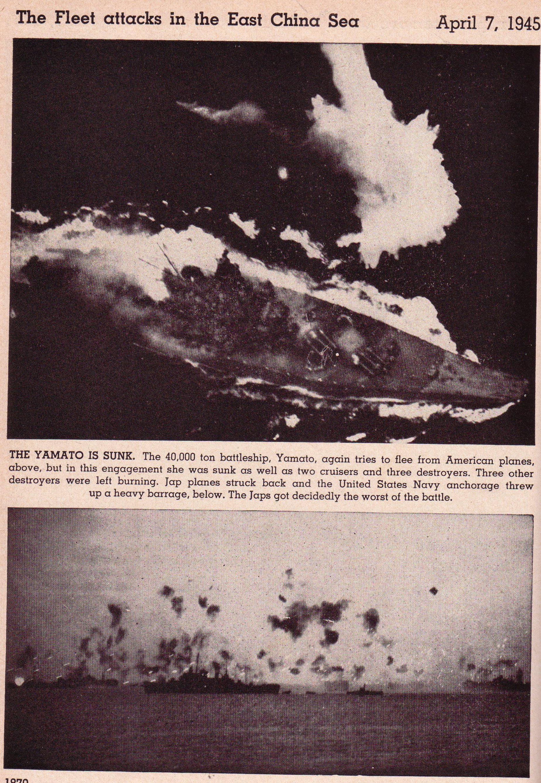 "The mightiest Japanese battleship, the Yamoto, is destroyed.It took 8 bombs and 8 torpedoes to do the job."