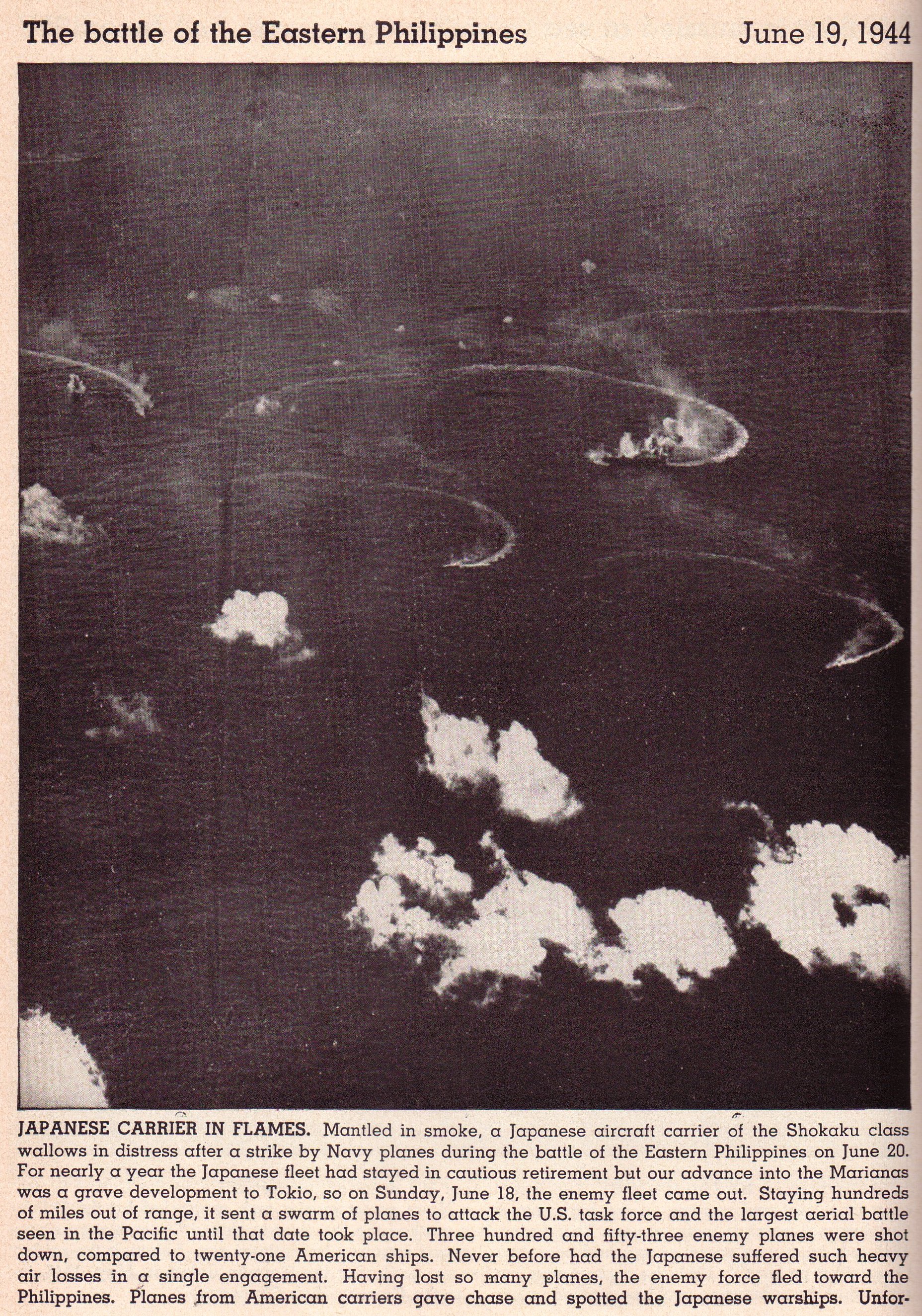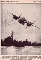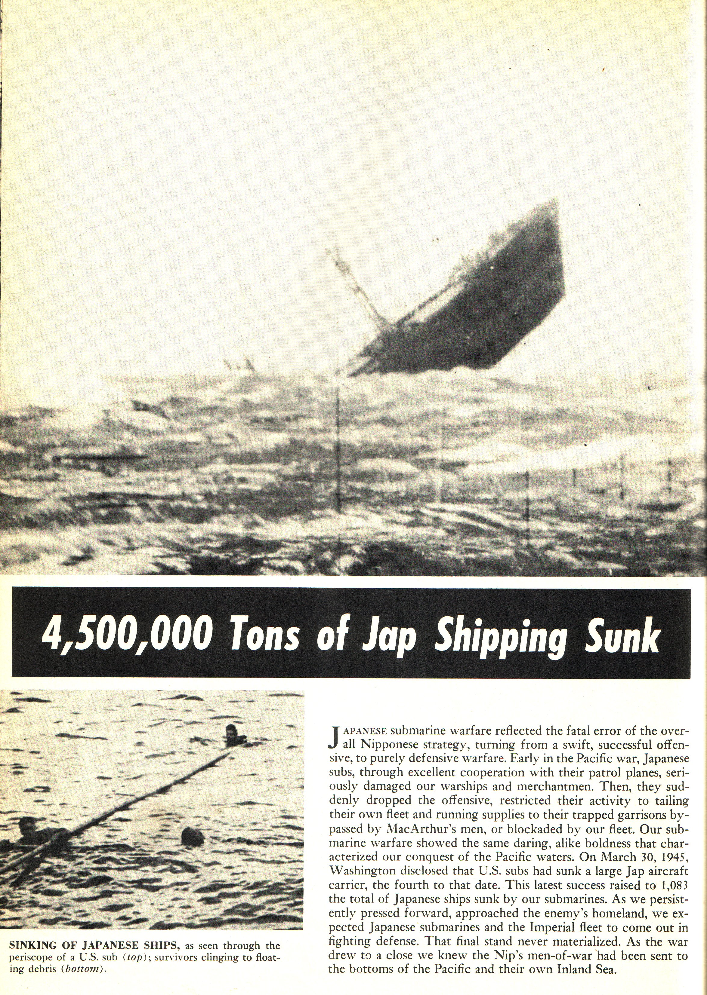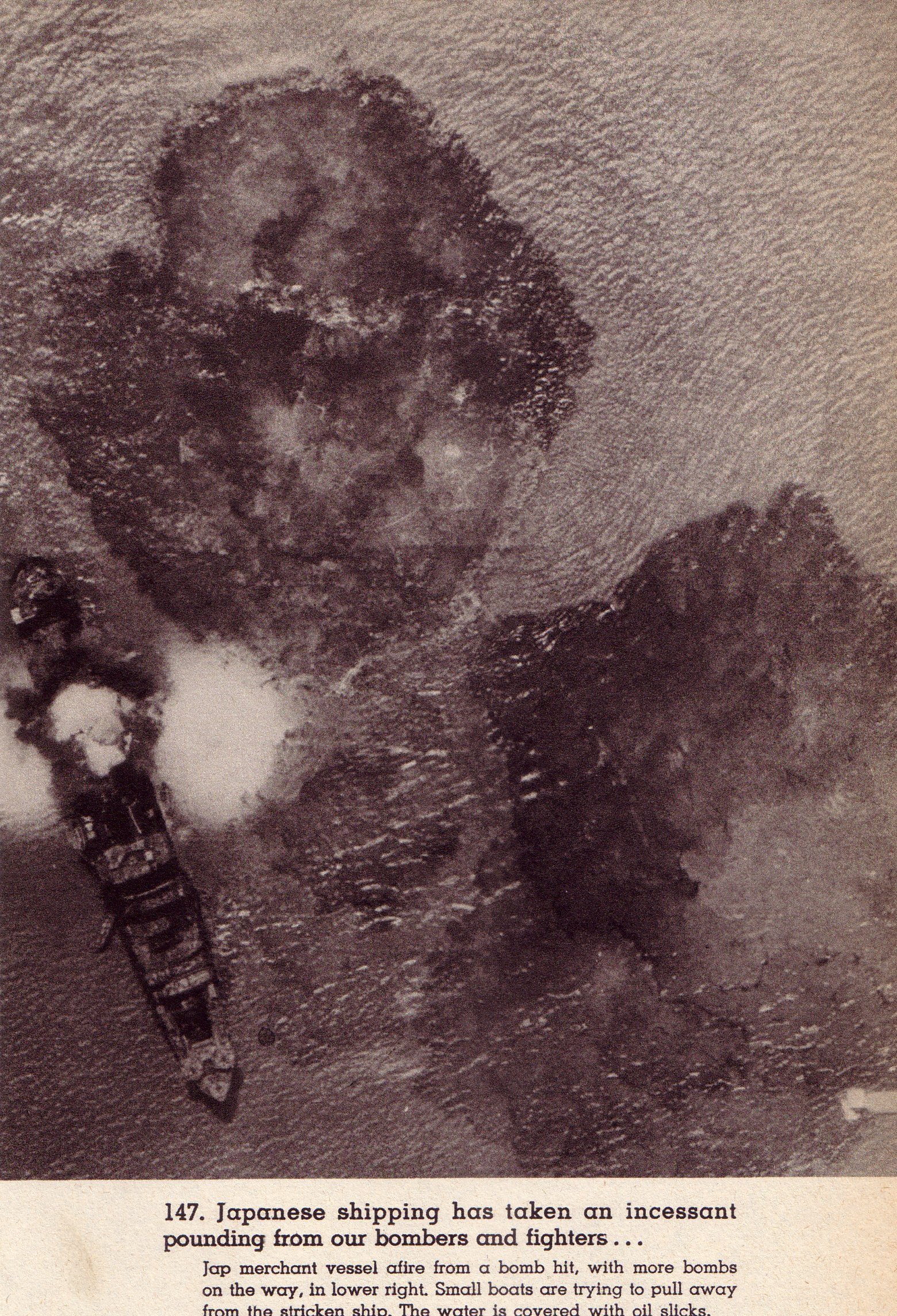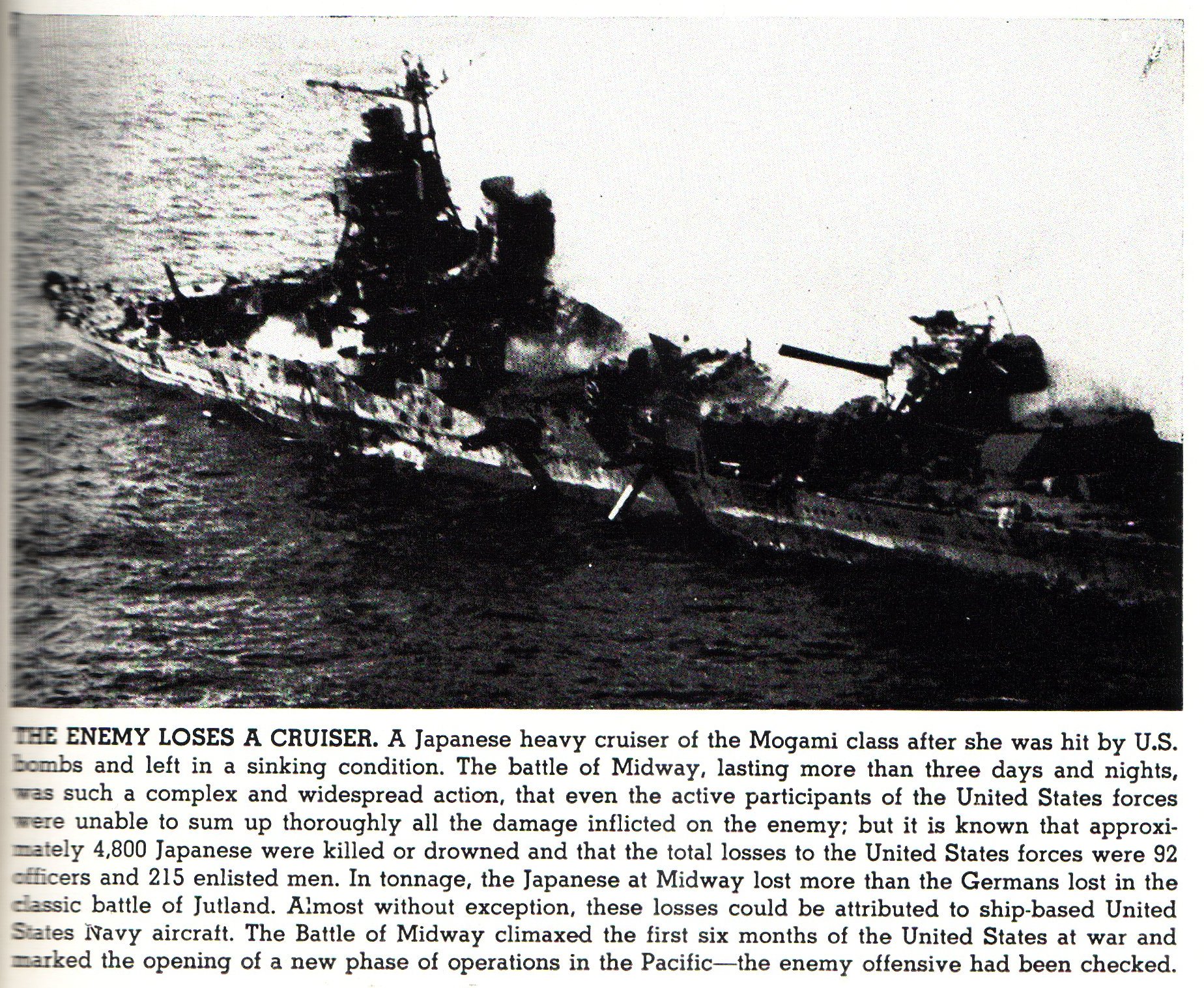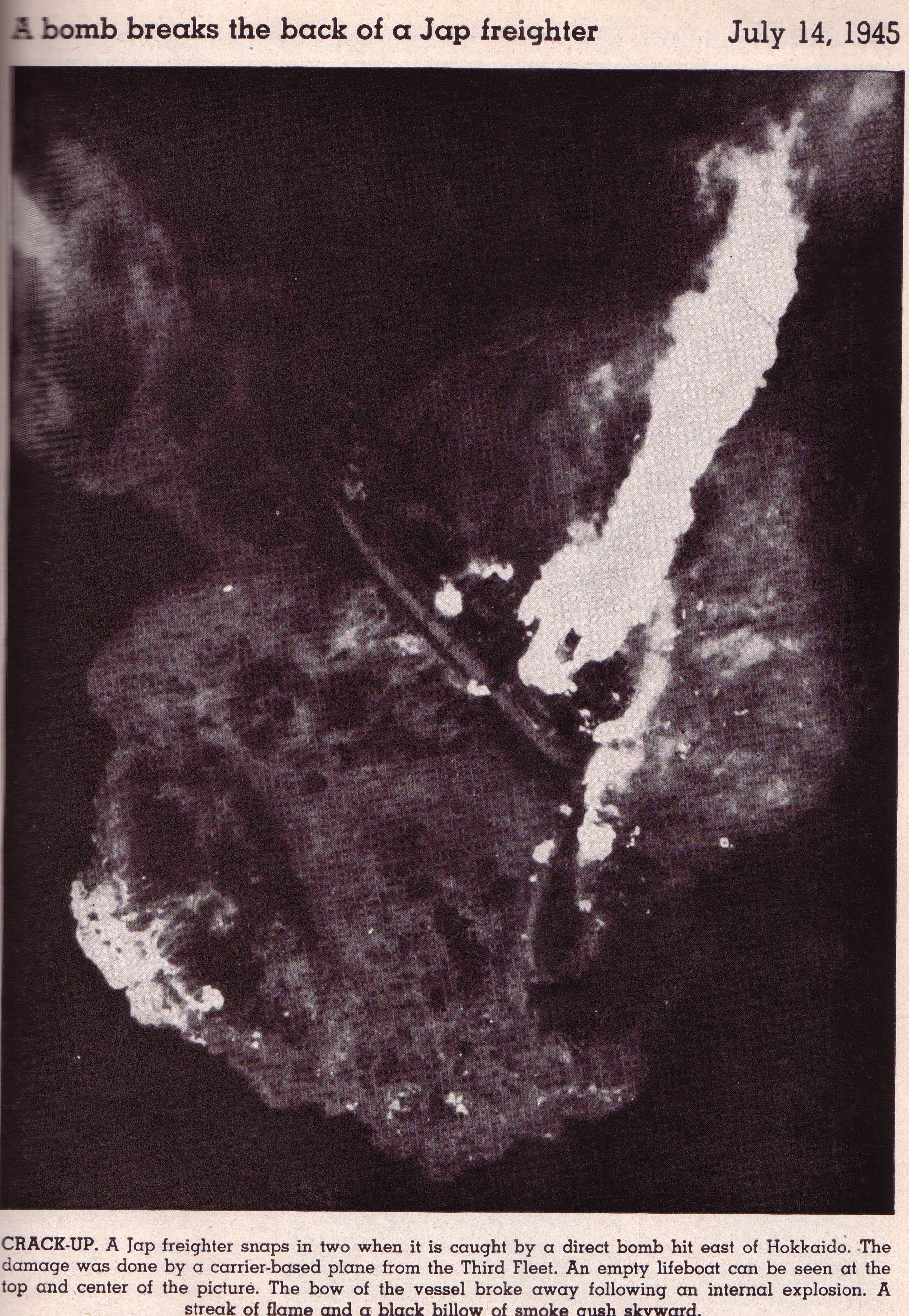 "The mightiest Japanese battleship, the Yamoto, is destroyed.It took 8 bombs and 8 torpedoes to do the job."