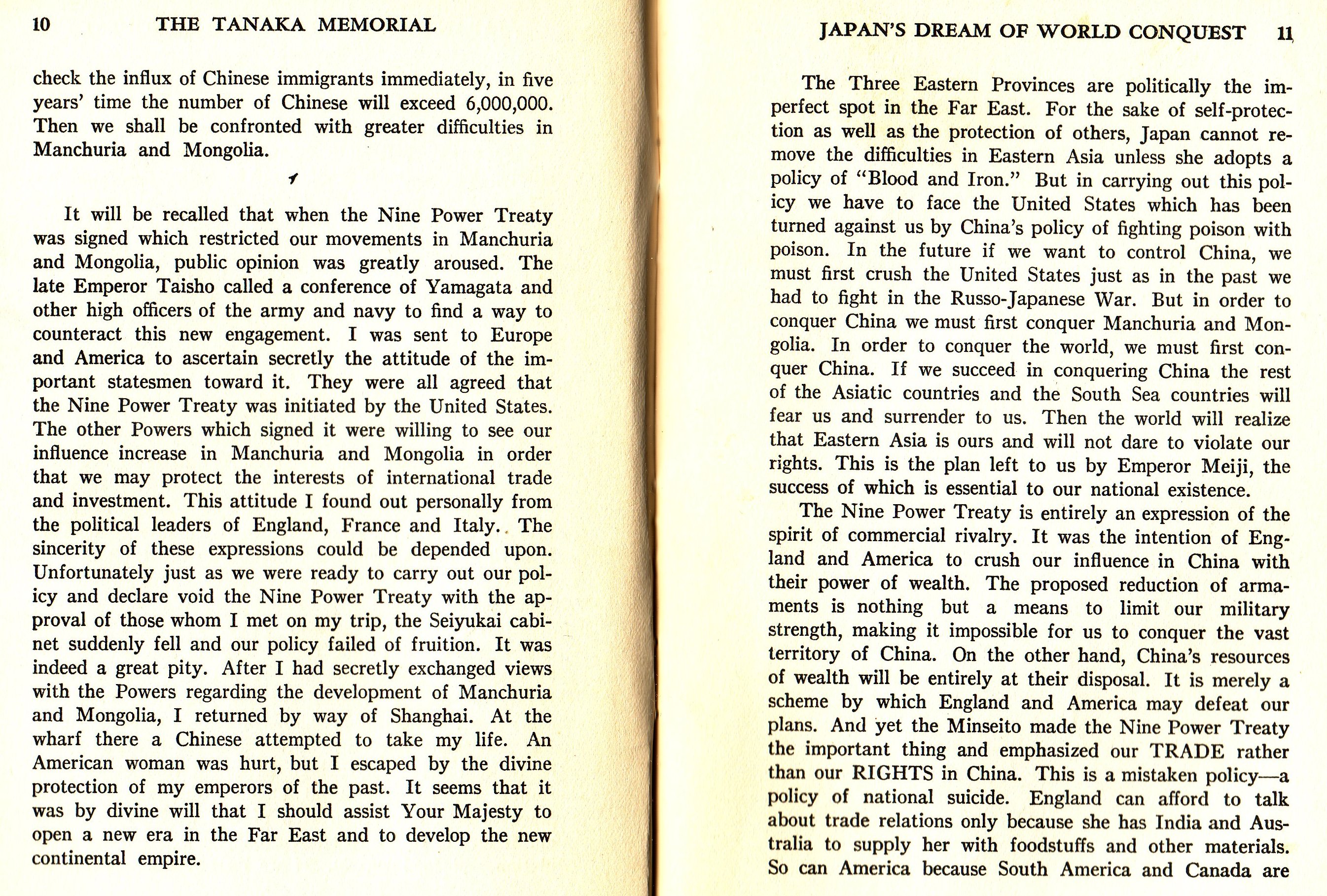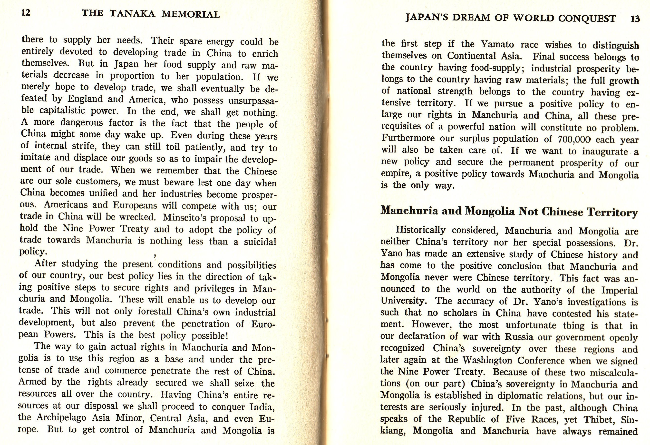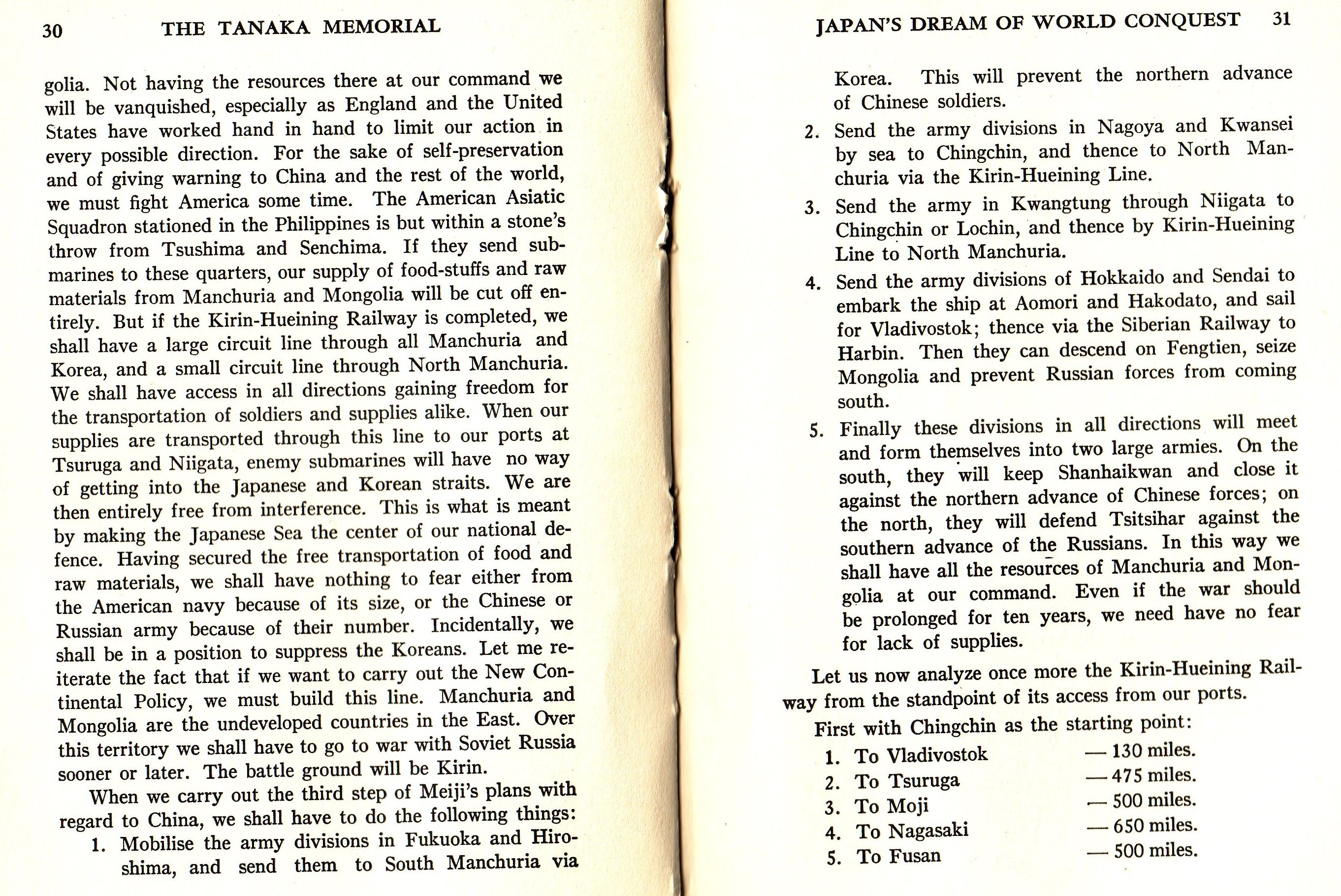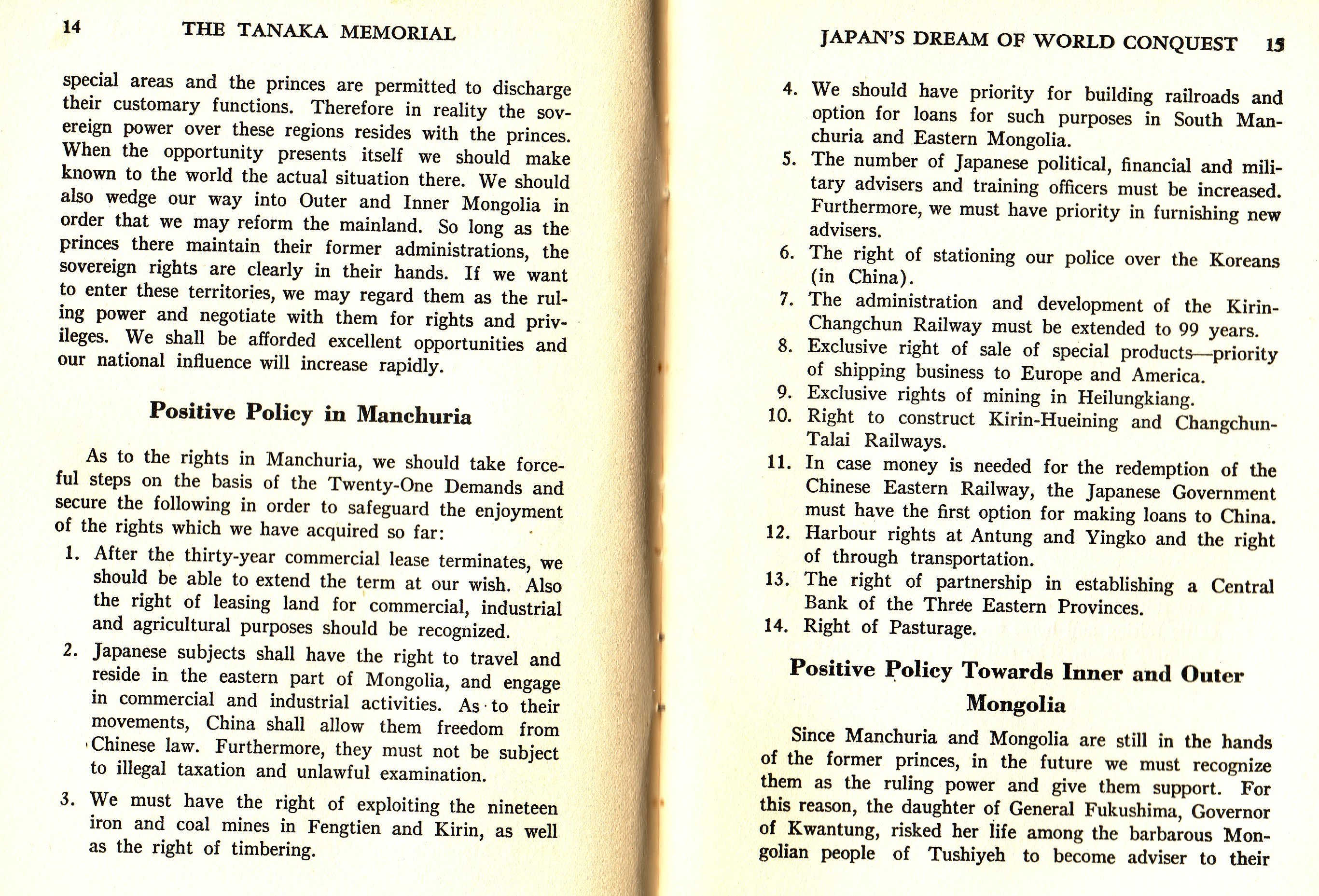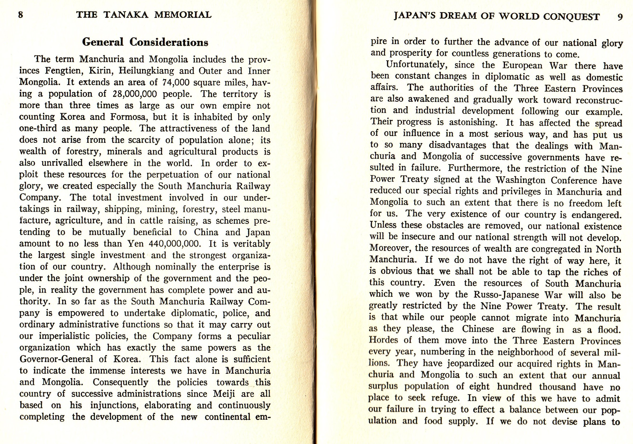 This is a document from 1931 that basically details Japan's future plan for aggression in the Far East. The movie Battle of China refers to the document, although in the movie it sort of implies the document also included plans for the invasion of the US and the document really doesn't have anything like that. Anyhow, following is the entire document.