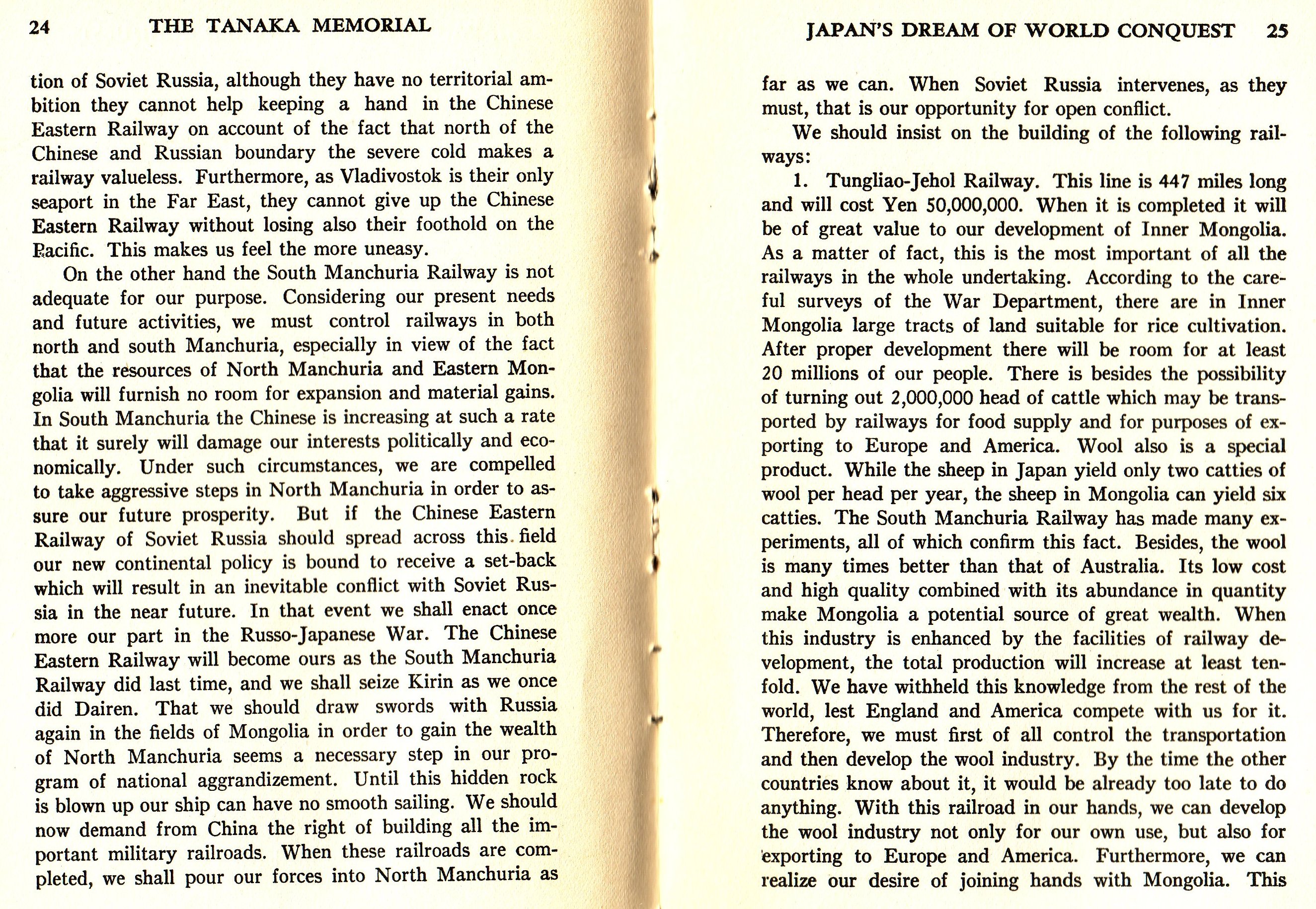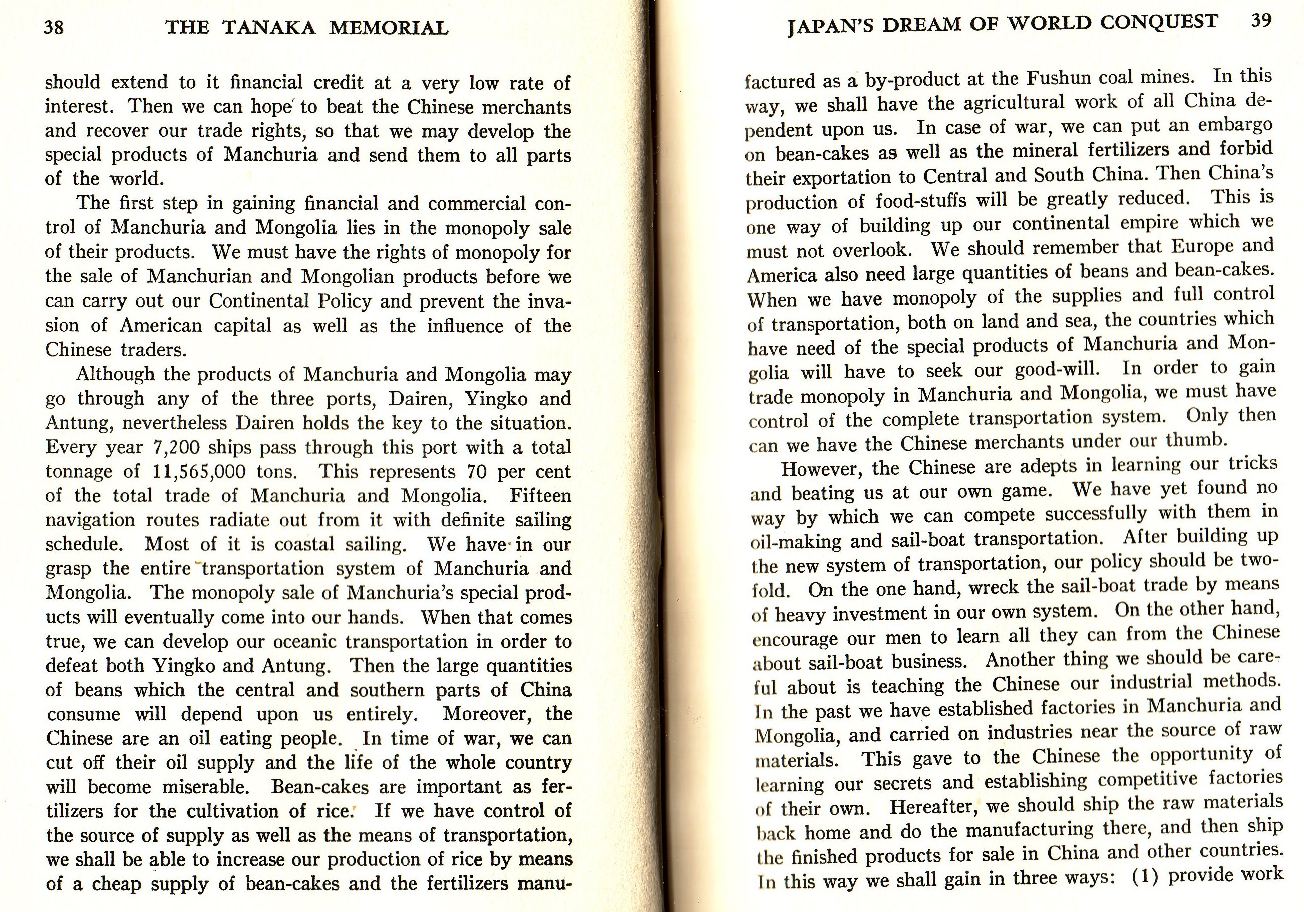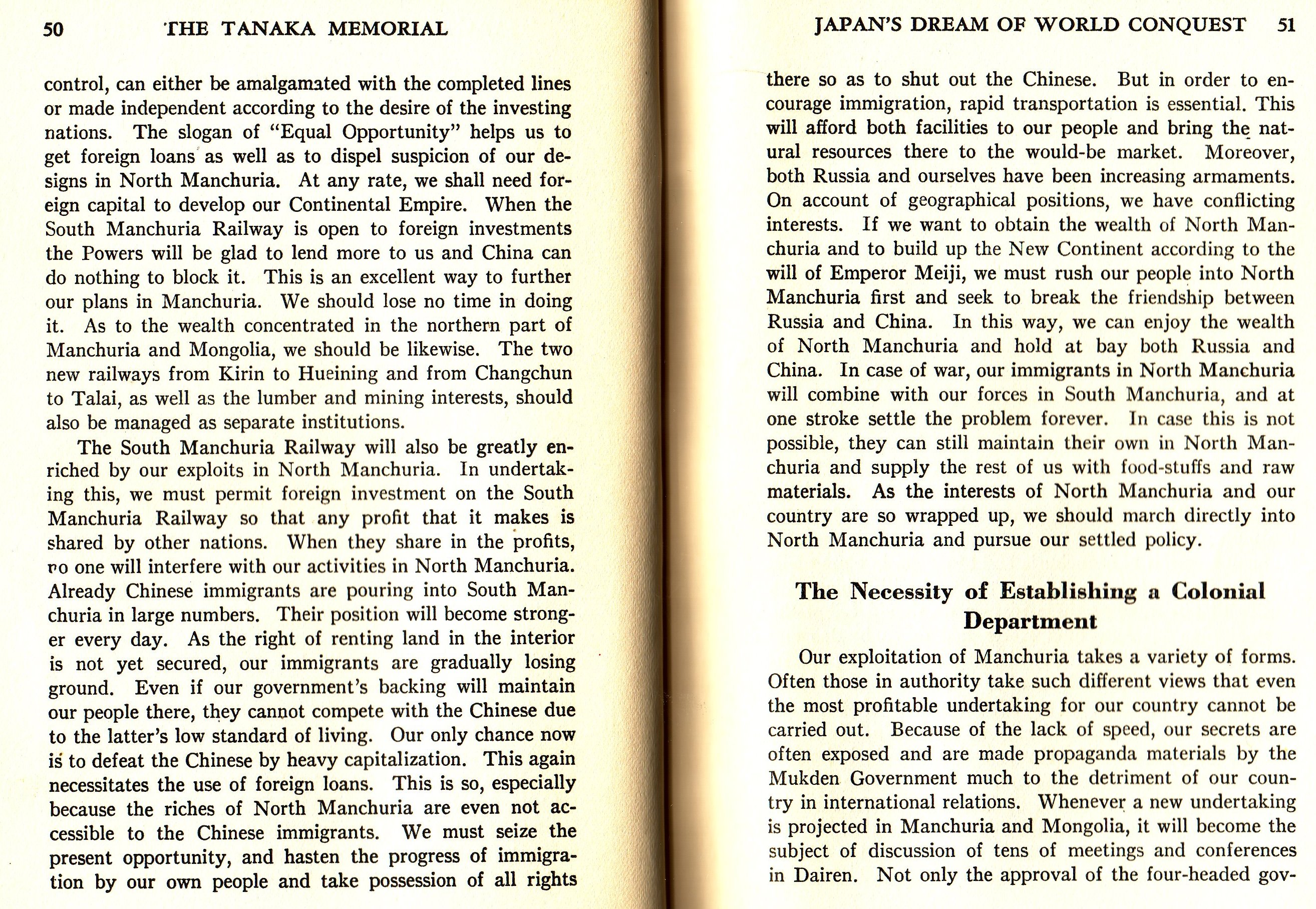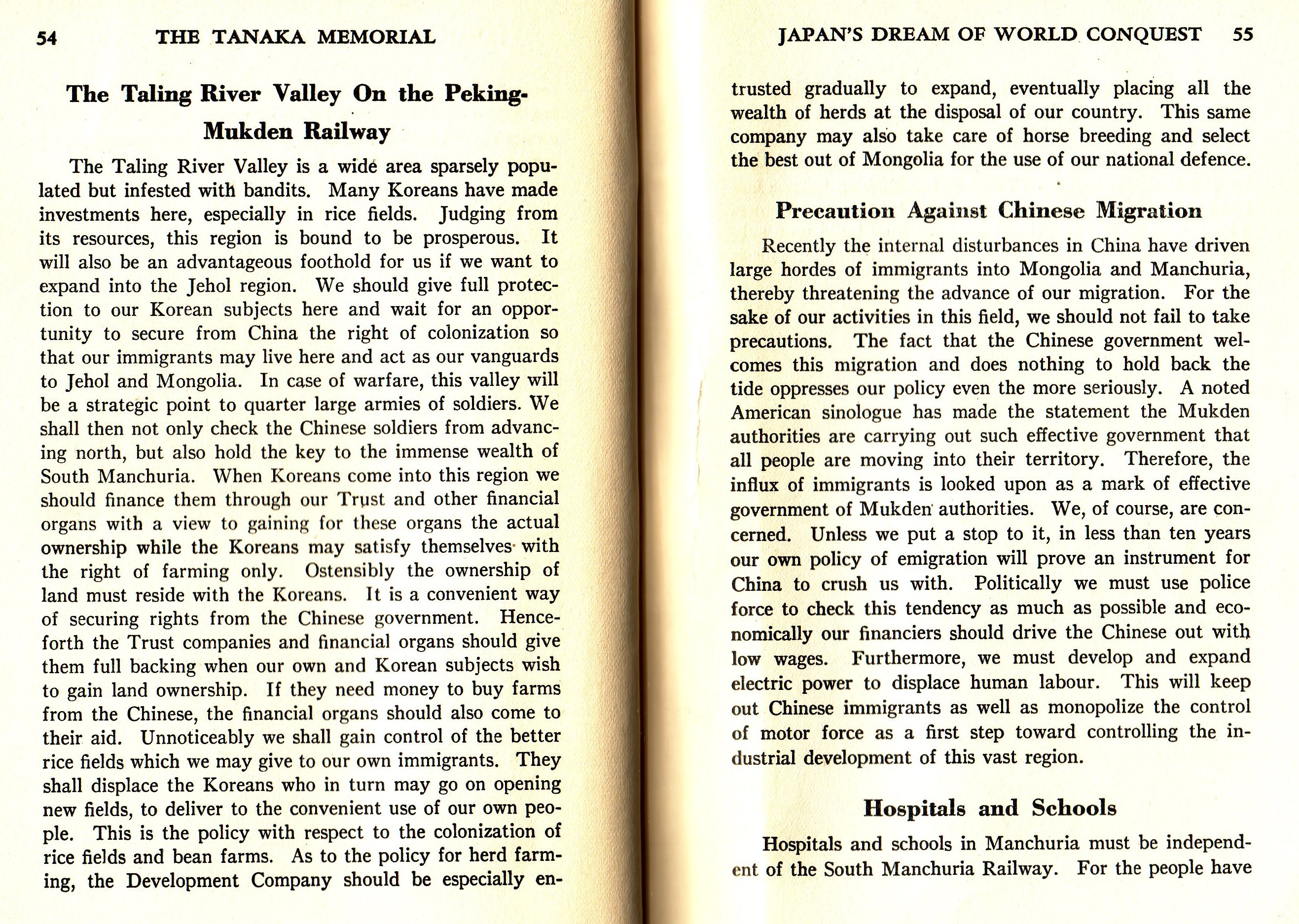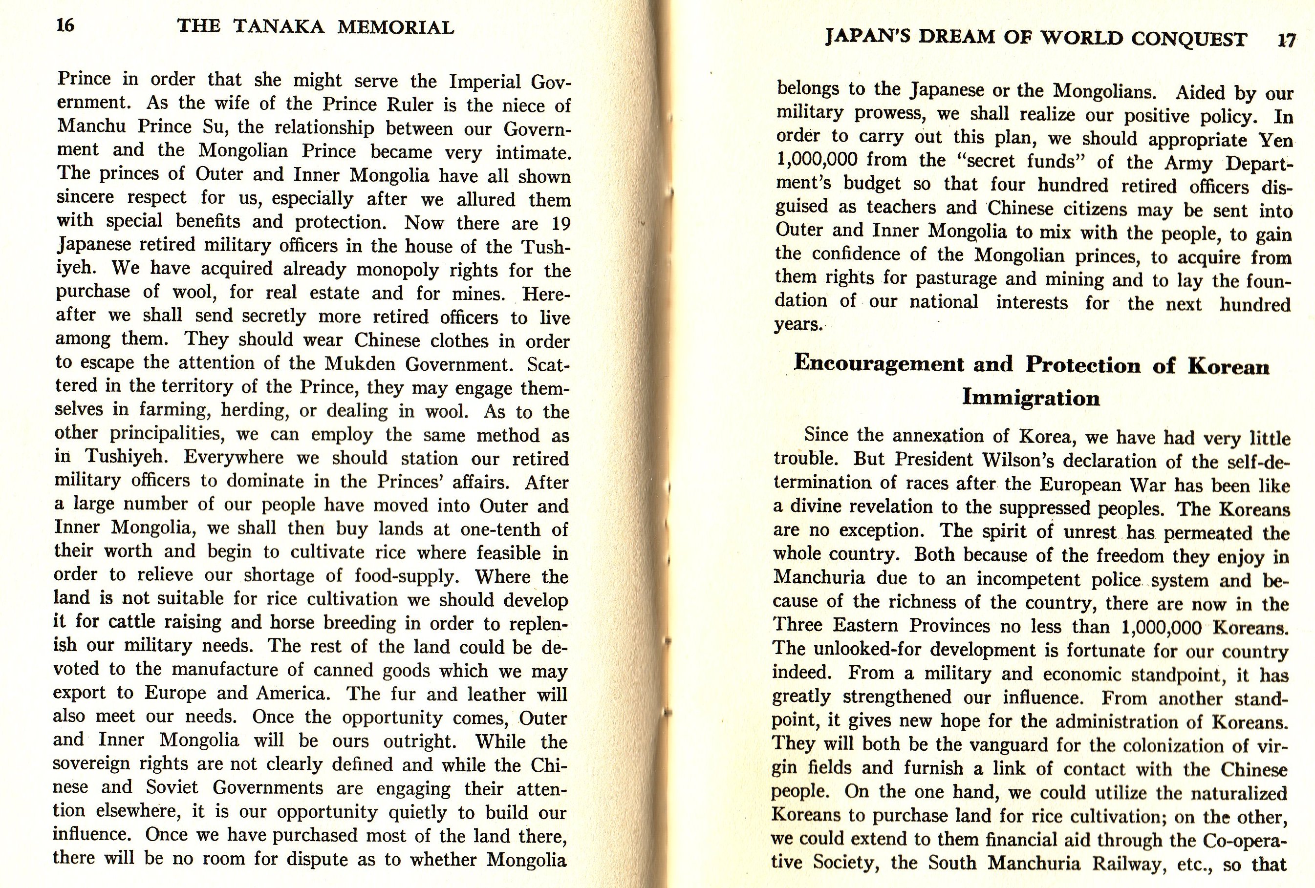 This is a document from 1931 that basically details Japan's future plan for aggression in the Far East. The movie Battle of China refers to the document, although in the movie it sort of implies the document also included plans for the invasion of the US and the document really doesn't have anything like that. Anyhow, following is the entire document.