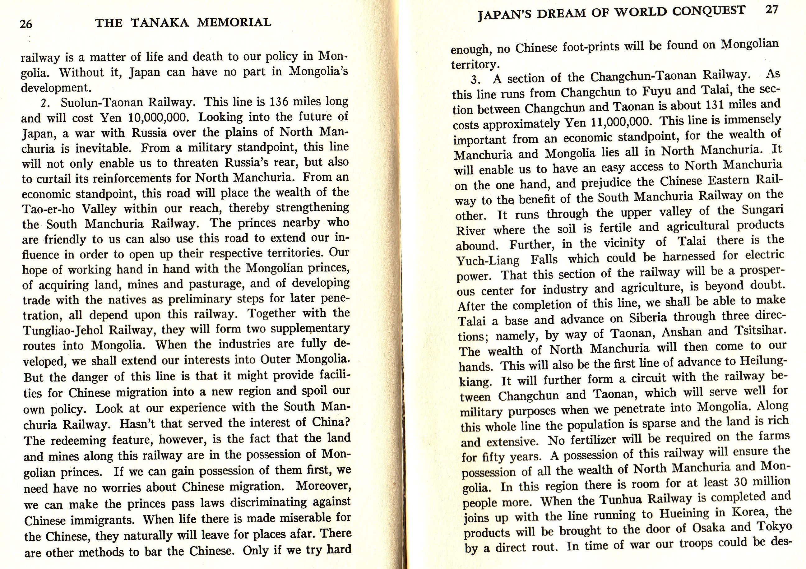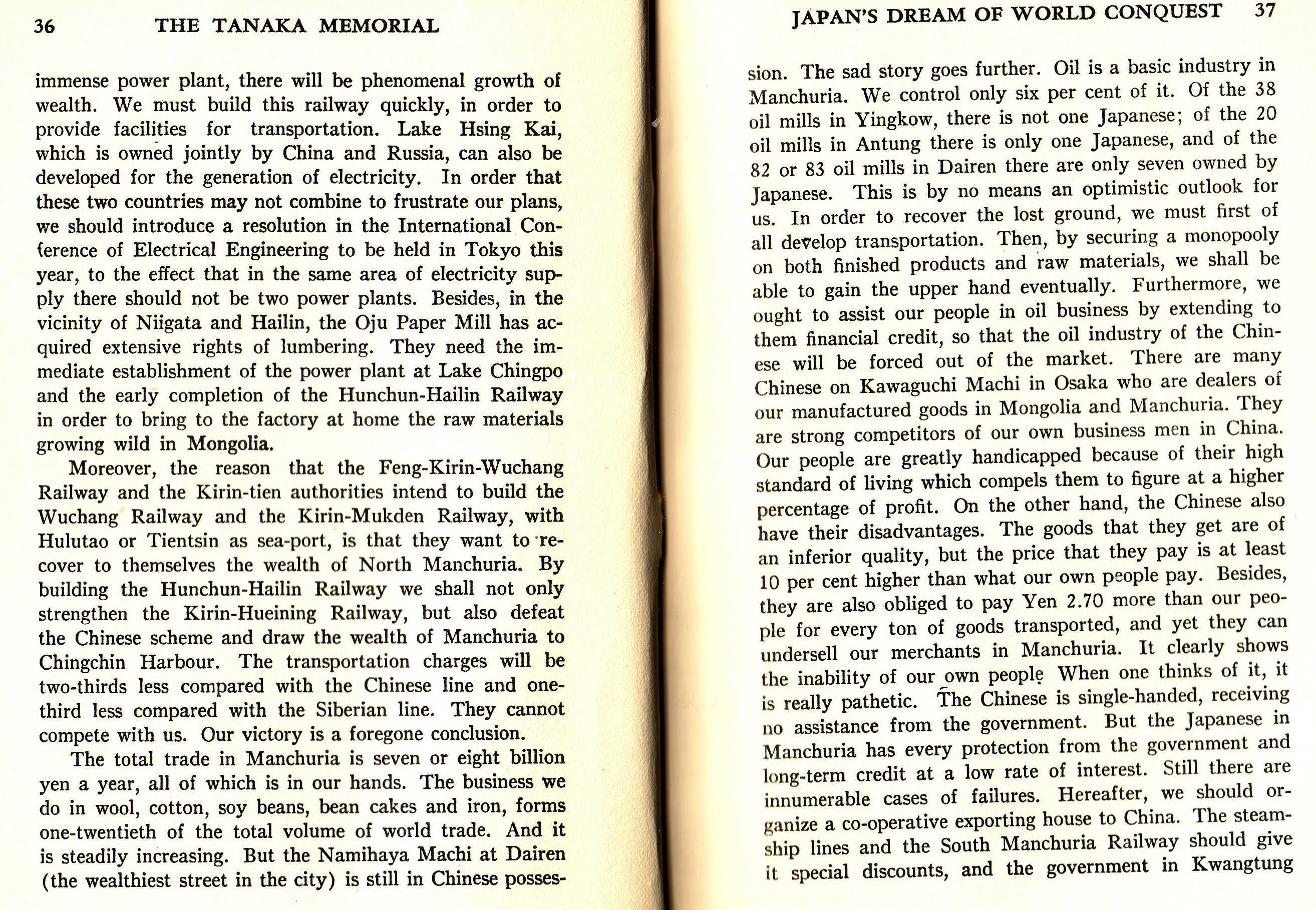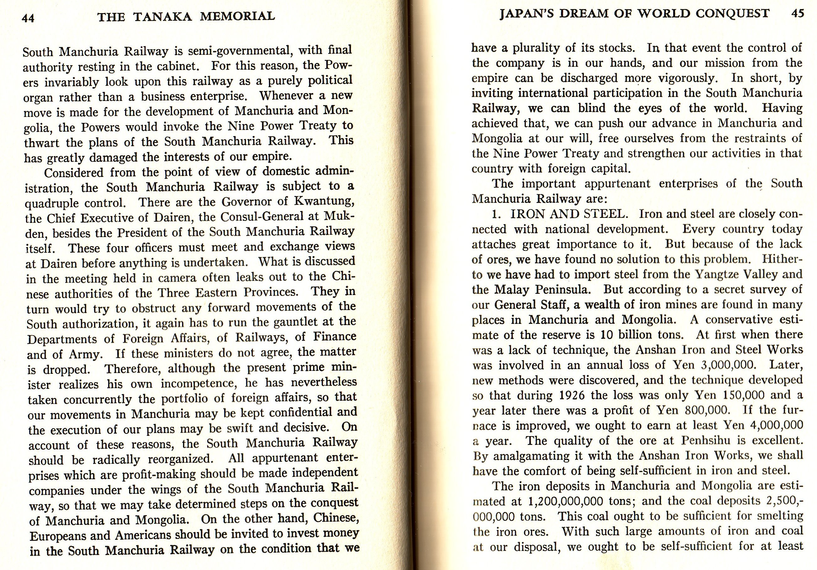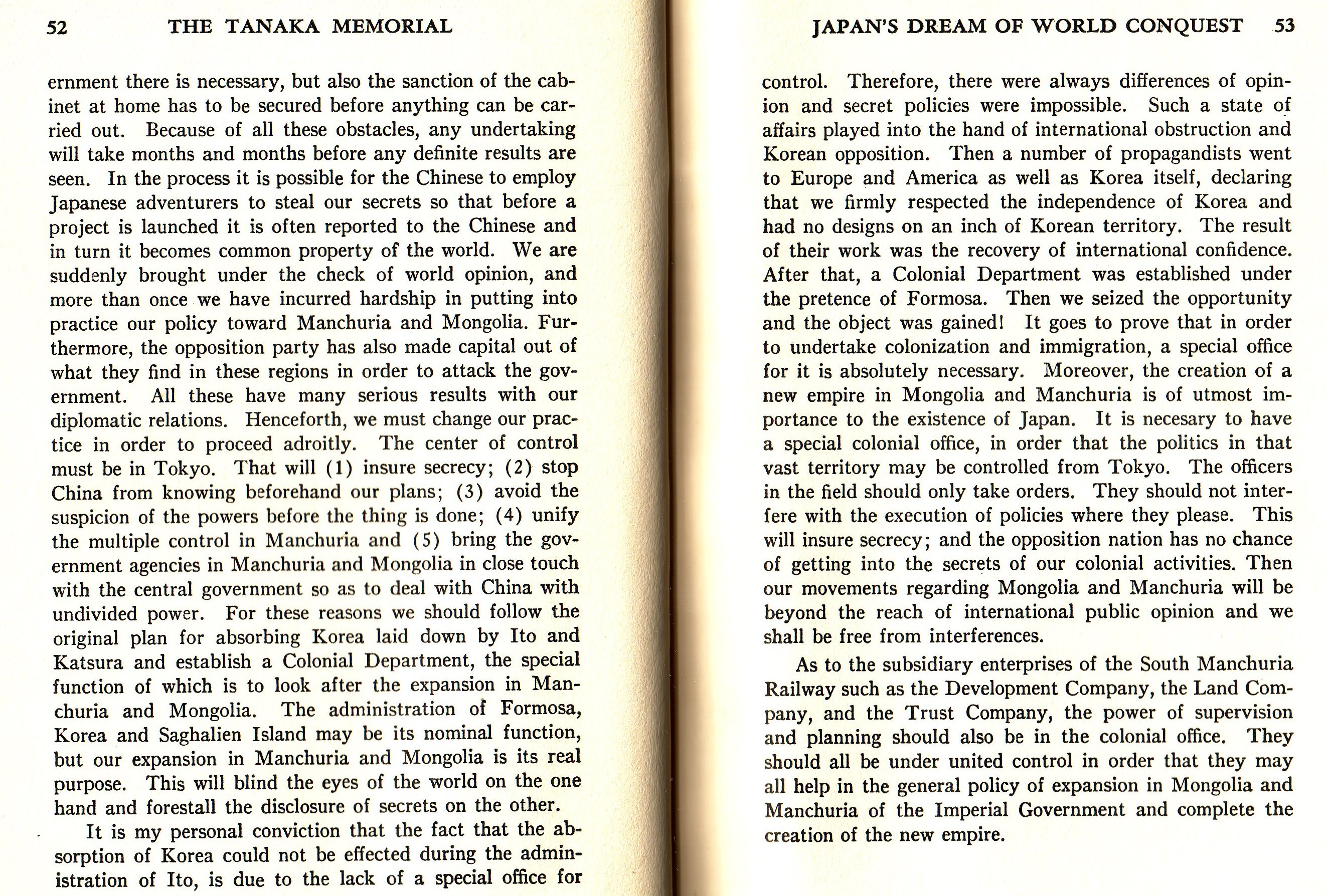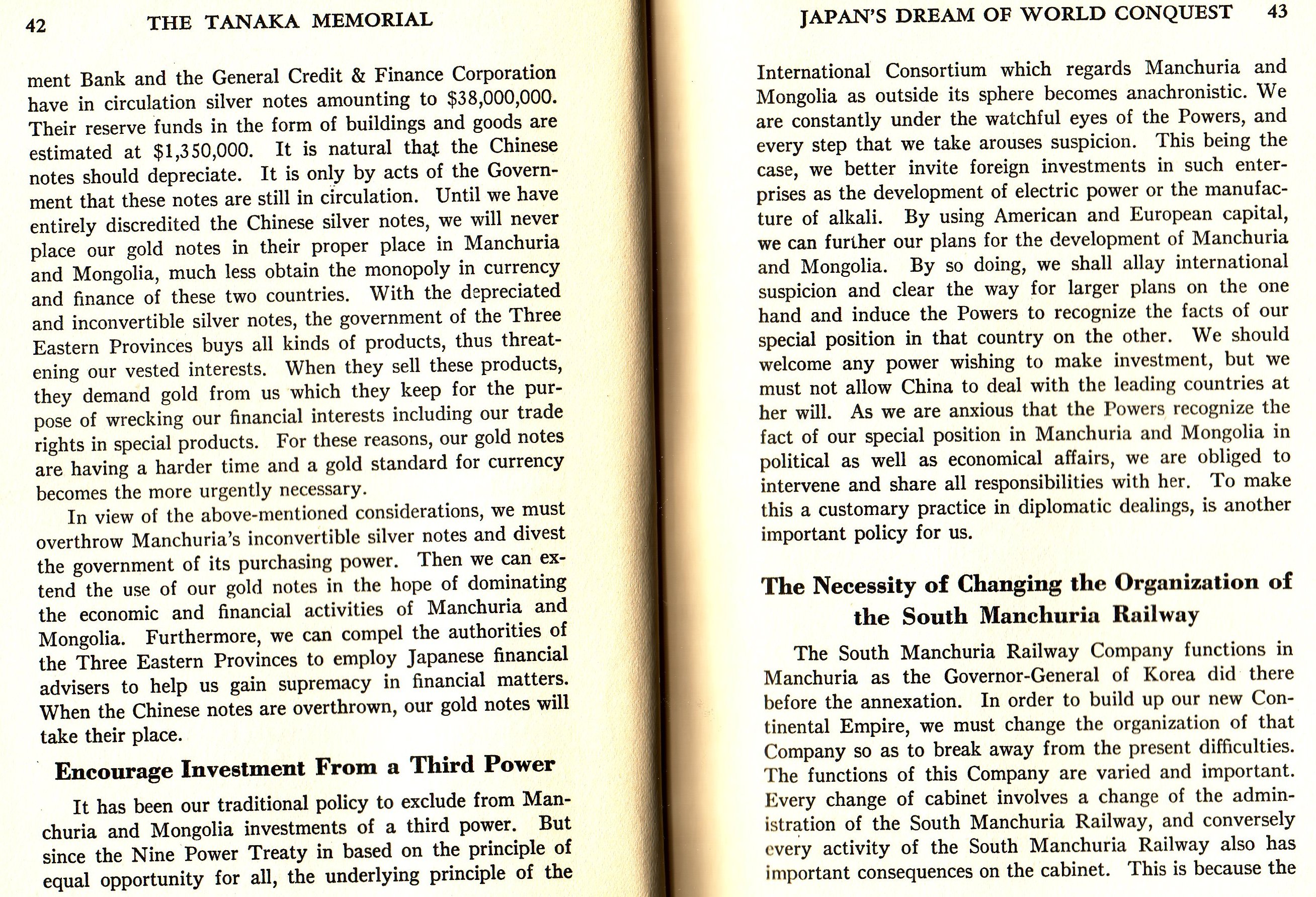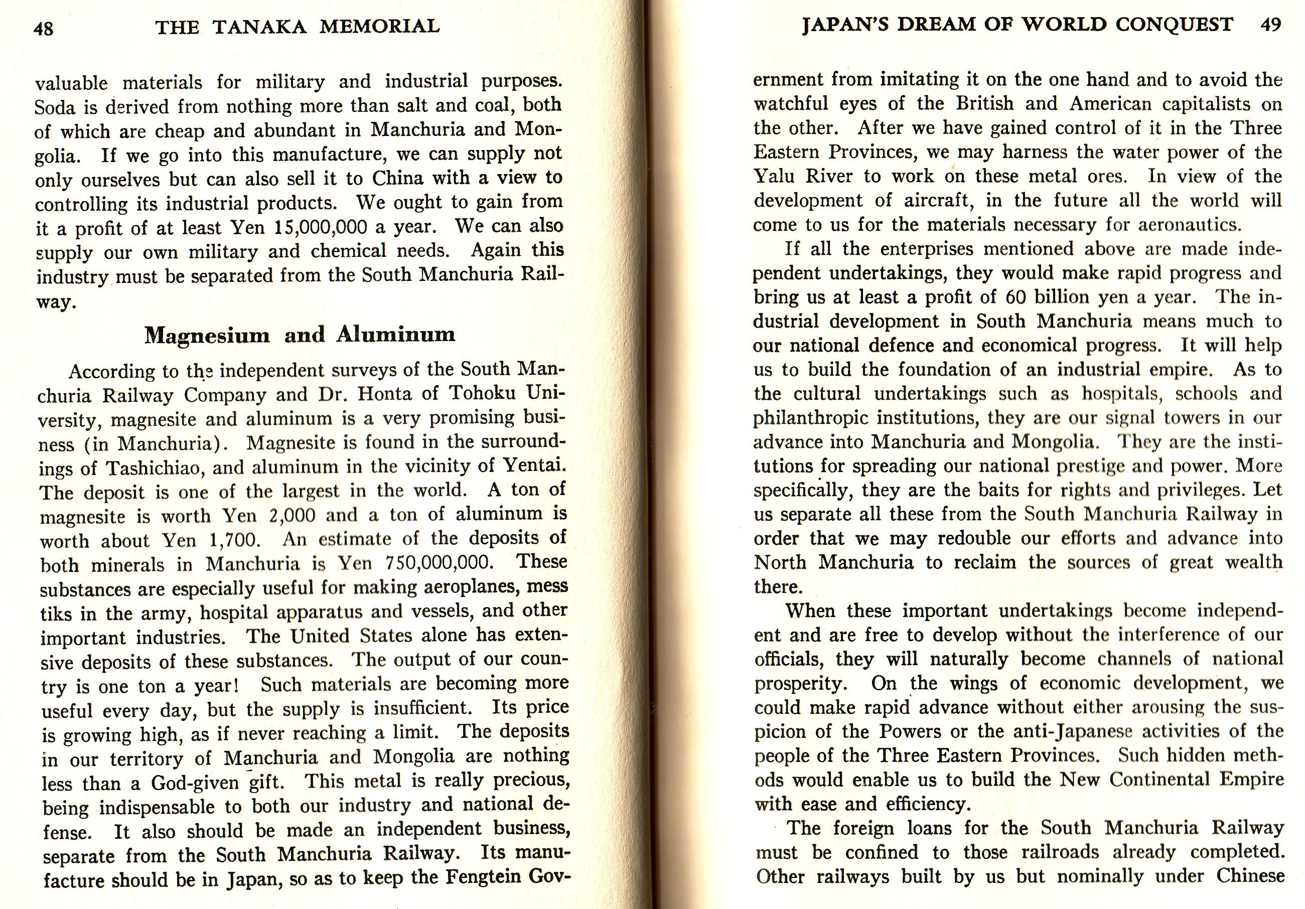 This is a document from 1931 that basically details Japan's future plan for aggression in the Far East. The movie Battle of China refers to the document, although in the movie it sort of implies the document also included plans for the invasion of the US and the document really doesn't have anything like that. Anyhow, following is the entire document.