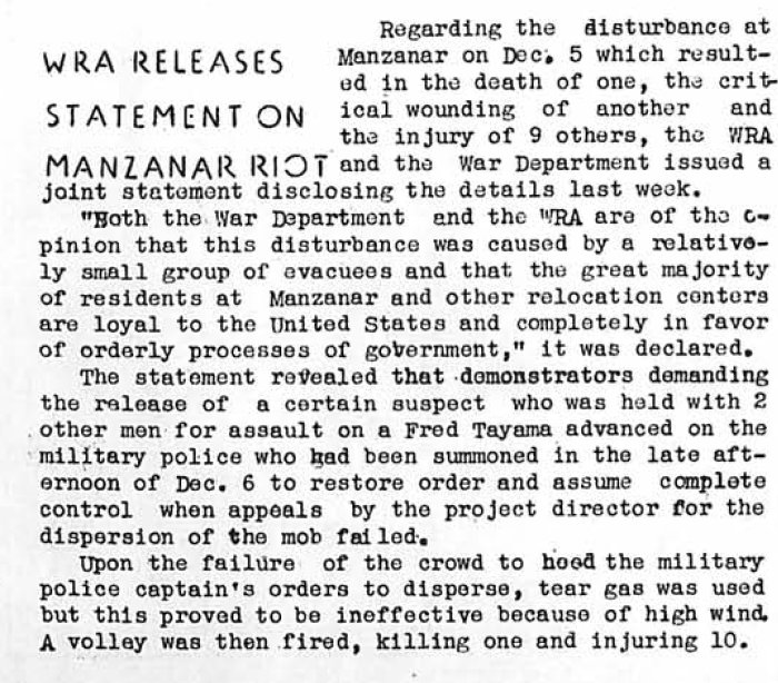 Page 1: News Briefs column; WRA issues statement on civil service; fire damages block 4 apartment; co-op orders variety of new stock.