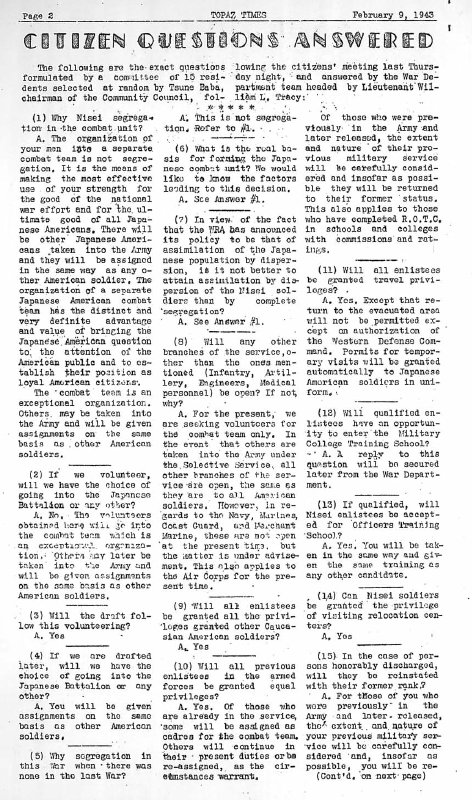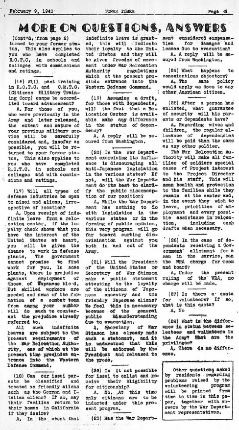 Page 1: Get replies on questions from war department; first blocks agree to register on Saturday; WRA official from capital visits Topaz; council sets temporary city speed limits; bridge tournament.