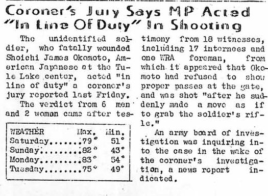 Page 1: Seasonal leave; Topaz volunteer Pvt. Koizumi killed in action; 47 draftees go for physicals; Hoffman welcomed at reception.